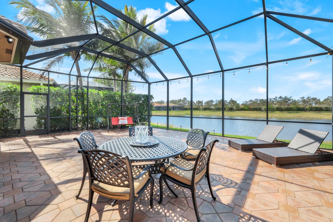 Embrace an effortless flow of casual elegance and the serene panoramic view this exquisite home exudes. From the moment you step into the foyer, you are welcomed into a space designed for both comfort and entertaining. The heart of the home unfolds with a spacious open floor plan living/dining area which overlooks the large extended lanai and lake. This premium lot offers a very private and serene view of the lake with no other homes to obstruct the picturesque landscape. The gourmet kitchen boasts beautiful upgraded cabinetry with custom pantry pullouts, designer accent lighting, Granite countertops, and high-end appliances, including an induction cooktop and a microwave/convection combo. No detail was spared to make this culinary and gathering experience both pleasurable and effortless. Meticulously maintained, this home is in impeccable condition. The moldings and lighting throughout showcase the elegance and well thought-out finishes the owners aspired. Other features include, a custom design powder room, great room surround sound, custom-designed master closets, and frameless glass enclosures in both full baths. The stylish ceiling fans, and silhouette window treatments enhance the home’s warm and inviting ambiance. Located in the coveted Riverstone community, residents enjoy a vibrant, resort-inspired clubhouse with world-class amenities. From a state-of-the-art fitness center, social hall, resort and lap pools, spa, and five Har-Tru tennis court, indoor/outdoor basketball court, pickleball courts, and a fully gated splash pad and tot-lot. This home is the perfect retreat for any buyer who relishes a carefree lifestyle and taste of what we call Paradise!