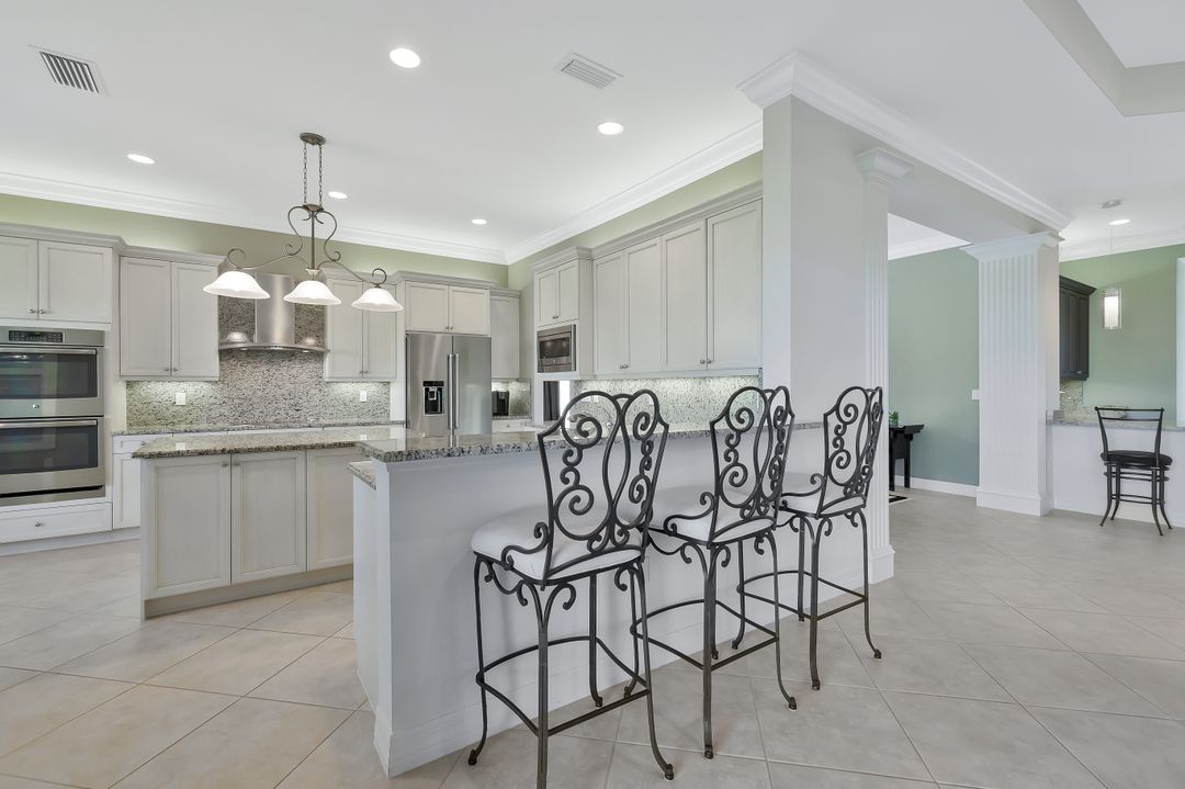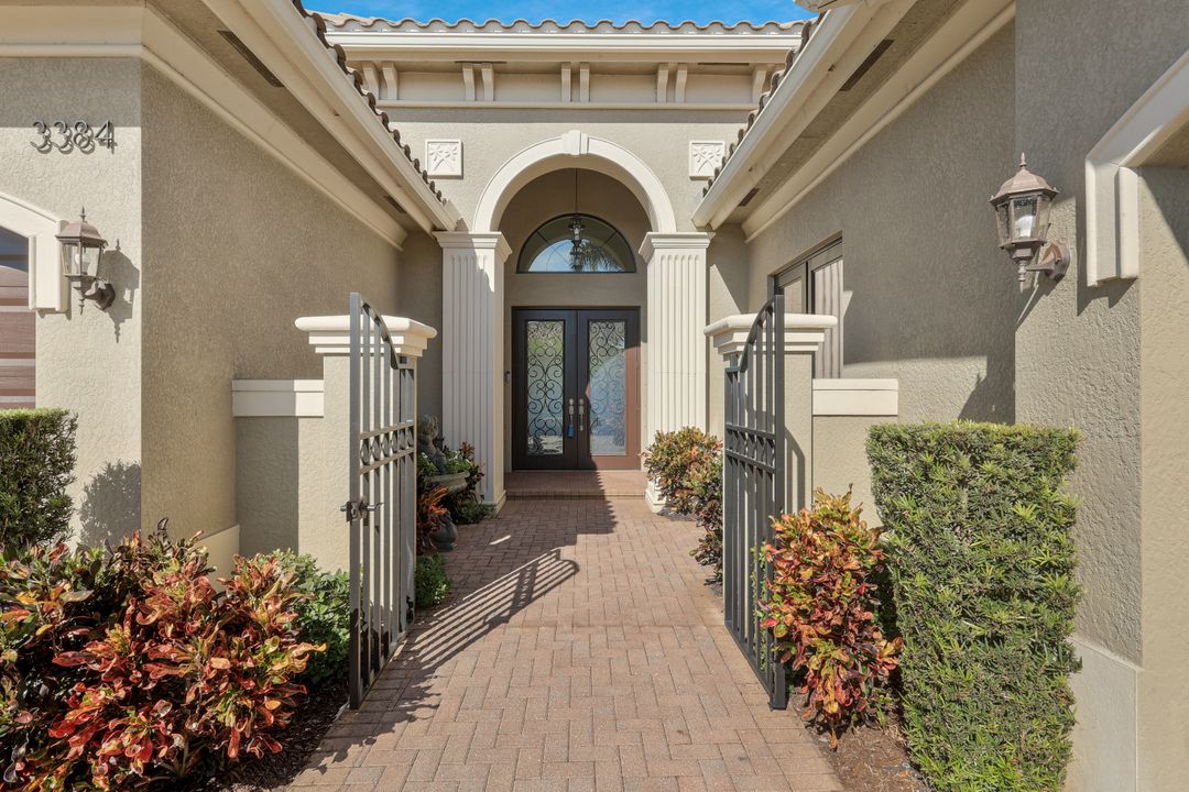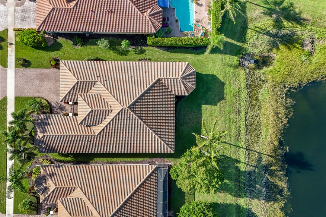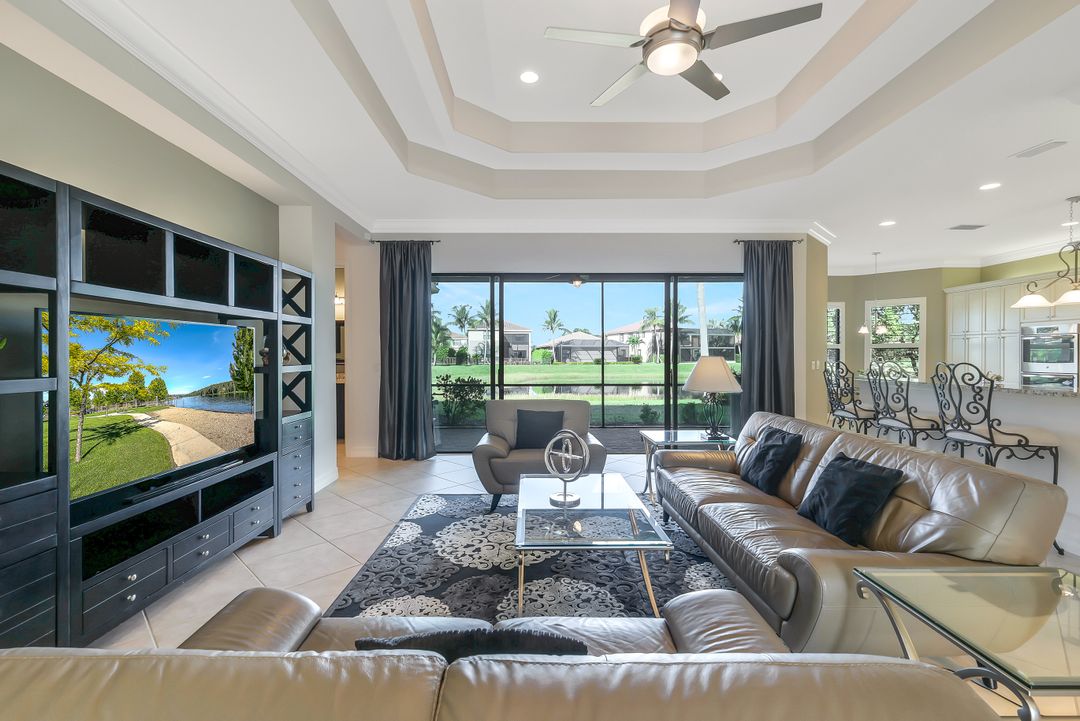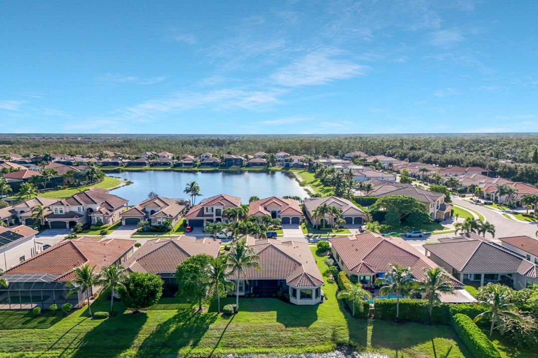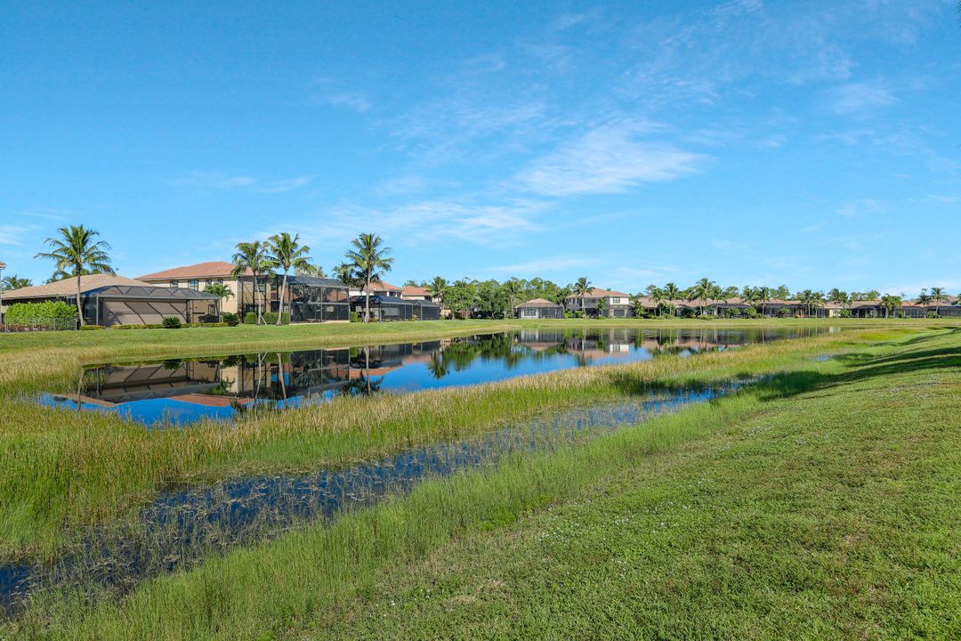 Sunsets over the lake and timeless elegance define this coveted 3,051 sq. ft. Carlyle, the most sought-after floor plan in Riverstone. Beyond the gated courtyard, double entry doors reveal an inviting layout designed for both easy everyday living and effortless entertaining. A spacious great room, formal dining room, wet bar with KitchenAid beverage fridge, and an adjacent custom wine storage rack for over 150 bottles make hosting unforgettable evenings a breeze. At the heart of the home, the gourmet kitchen features upgraded off-white shaker cabinetry, granite counters and backsplash, ambient lighting, and stainless-steel appliances including a double wall oven, vented hood over the cooktop, and a newer KitchenAid refrigerator—sure to inspire any culinary enthusiast. The versatile Club Room, finished with wood flooring and matching plantation shutters, is perfect as an office, den, or media retreat. The primary suite offers serene lake views, custom closets, and a spa-like bath with marble counters and decorative mirrors. Two private guest suites, each with a full bath and built-in closets, ensure comfort for family and friends. Thoughtful details include crown molding, wood-wrapped pillars, decorative mantlepiece, upgraded lighting fixtures and fans, and elegant window treatments. Everyday living is made easier with a finished laundry room offering a sink, ample cabinetry, folding counter, and a new (2024) LG washer and dryer. Peace of mind comes with a whole-home Generac generator powered by dual 120-gallon tanks, accordion shutters for quick storm prep, and an AC system with medical-grade UV lights and filters. The garage is equally functional with storage shelving and insulated doors. Expansive glass sliders flow seamlessly to the outdoors, where a west-facing lanai frames tranquil lake views and panoramic sunsets that fill the sky with vibrant color. The backyard offers abundant space to add a custom pool or design your own custom tropical oasis. Here, unforgettable gatherings, quiet moments, and golden sunsets become part of everyday life. Riverstone offers a vibrant, vacation-inspired lifestyle for all ages. Located in North Naples, just minutes from I-75 and zoned for "A"-rated schools, the community features a fitness center, social hall, resort-style pool, lap pool, spa, five lighted tennis courts, outdoor basketball and pickleball, a full indoor basketball court, tot lot, children’s water play area, game room, and an activities coordinator; making it easy to meet new friends. Perfectly suited for entertaining, unwinding, or savoring the view, this home captures the essence of Naples living.
