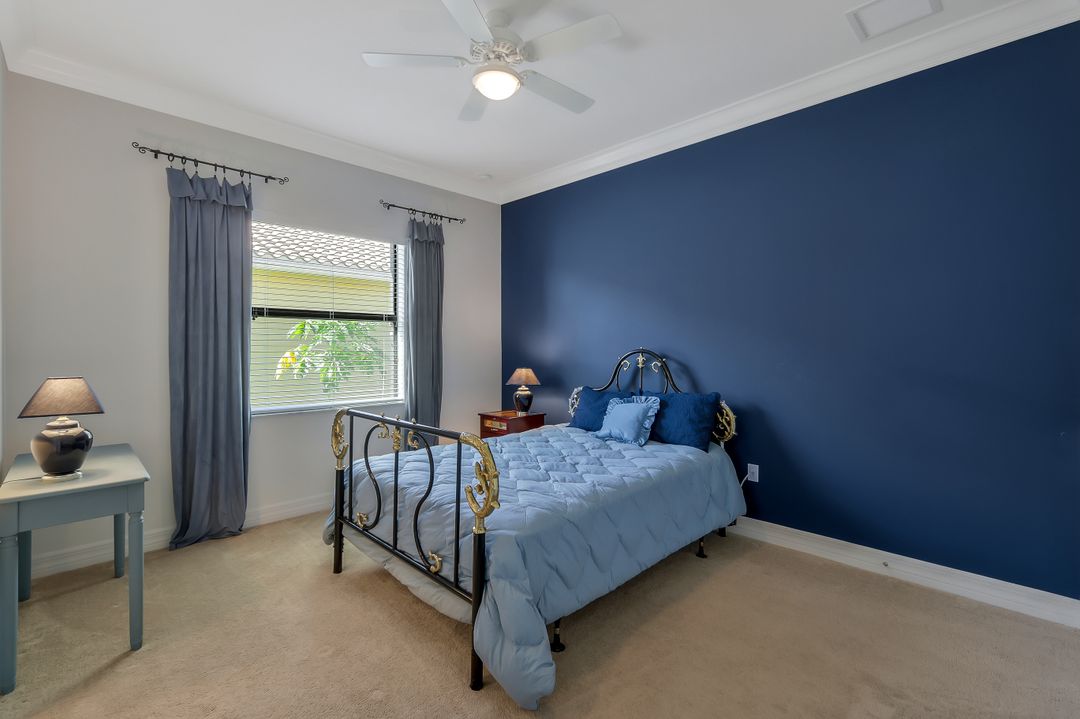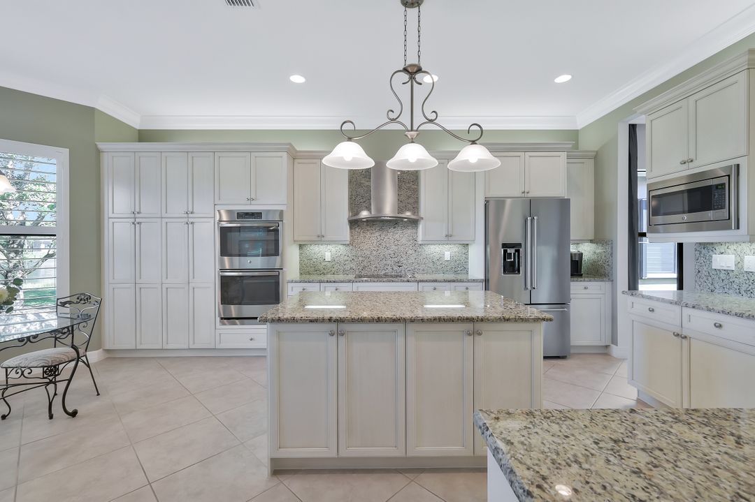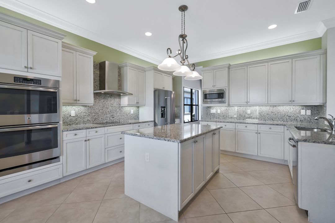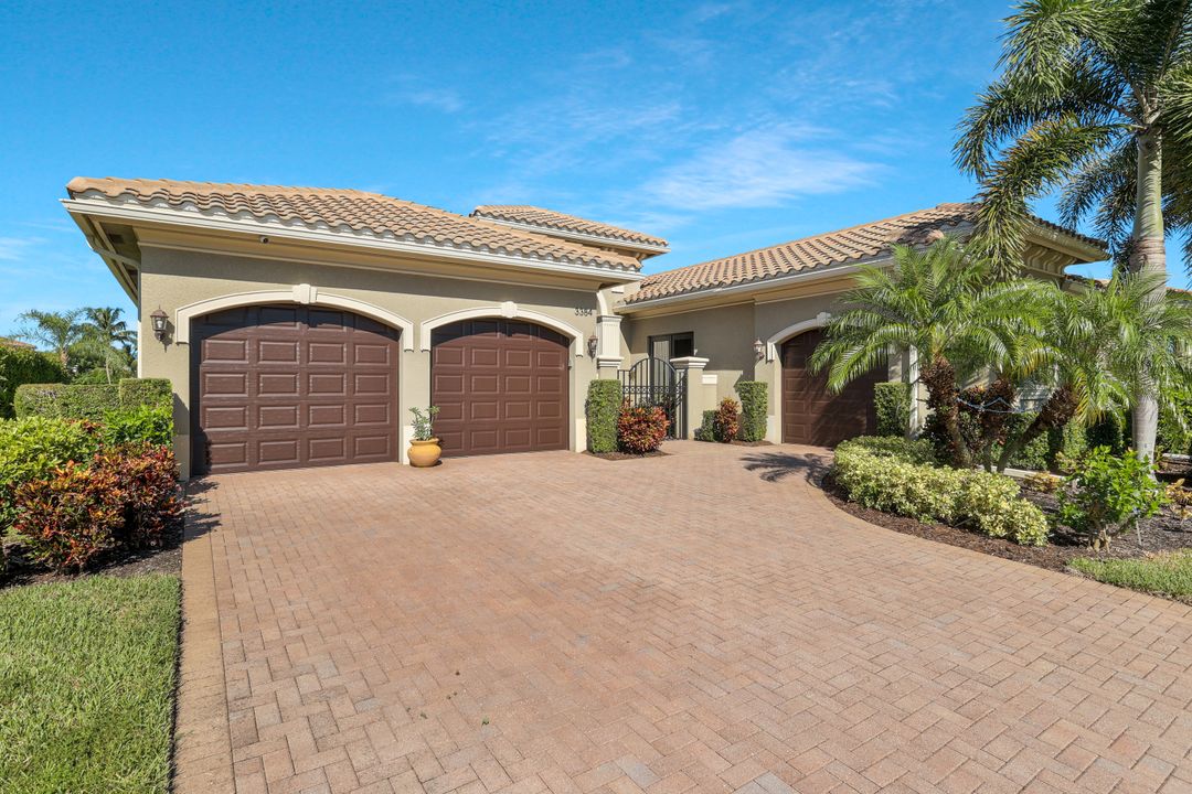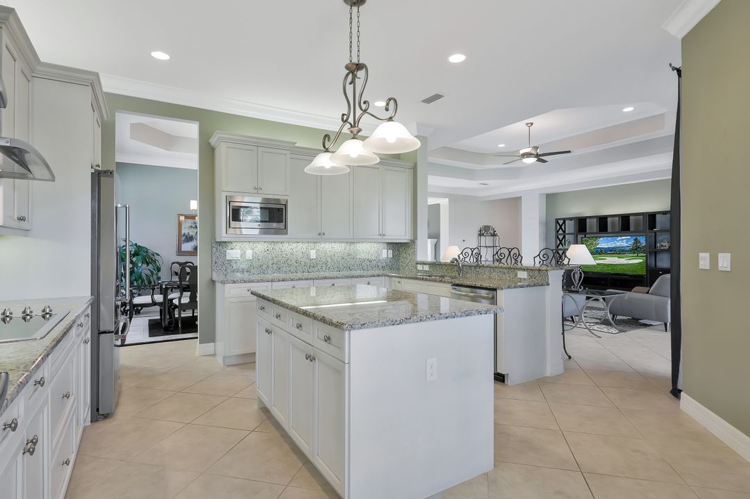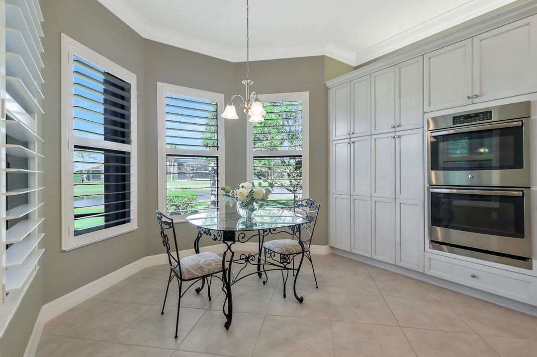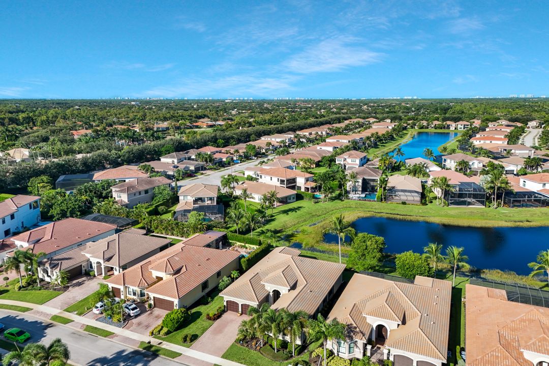 Sunsets over the lake and timeless elegance define this coveted 3,051 sq. ft. Carlyle, the most sought-after floor plan in Riverstone. Beyond the gated courtyard, double entry doors reveal an inviting layout designed for both easy everyday living and effortless entertaining. A spacious great room, formal dining room, wet bar with KitchenAid beverage fridge, and an adjacent custom wine storage rack for over 150 bottles make hosting unforgettable evenings a breeze. At the heart of the home, the gourmet kitchen features upgraded off-white shaker cabinetry, granite counters and backsplash, ambient lighting, and stainless-steel appliances including a double wall oven, vented hood over the cooktop, and a newer KitchenAid refrigerator—sure to inspire any culinary enthusiast. The versatile Club Room, finished with wood flooring and matching plantation shutters, is perfect as an office, den, or media retreat. The primary suite offers serene lake views, custom closets, and a spa-like bath with marble counters and decorative mirrors. Two private guest suites, each with a full bath and built-in closets, ensure comfort for family and friends. Thoughtful details include crown molding, wood-wrapped pillars, decorative mantlepiece, upgraded lighting fixtures and fans, and elegant window treatments. Everyday living is made easier with a finished laundry room offering a sink, ample cabinetry, folding counter, and a new (2024) LG washer and dryer. Peace of mind comes with a whole-home Generac generator powered by dual 120-gallon tanks, accordion shutters for quick storm prep, and an AC system with medical-grade UV lights and filters. The garage is equally functional with storage shelving and insulated doors. Expansive glass sliders flow seamlessly to the outdoors, where a west-facing lanai frames tranquil lake views and panoramic sunsets that fill the sky with vibrant color. The backyard offers abundant space to add a custom pool or design your own custom tropical oasis. Here, unforgettable gatherings, quiet moments, and golden sunsets become part of everyday life. Riverstone offers a vibrant, vacation-inspired lifestyle for all ages. Located in North Naples, just minutes from I-75 and zoned for "A"-rated schools, the community features a fitness center, social hall, resort-style pool, lap pool, spa, five lighted tennis courts, outdoor basketball and pickleball, a full indoor basketball court, tot lot, children’s water play area, game room, and an activities coordinator; making it easy to meet new friends. Perfectly suited for entertaining, unwinding, or savoring the view, this home captures the essence of Naples living.