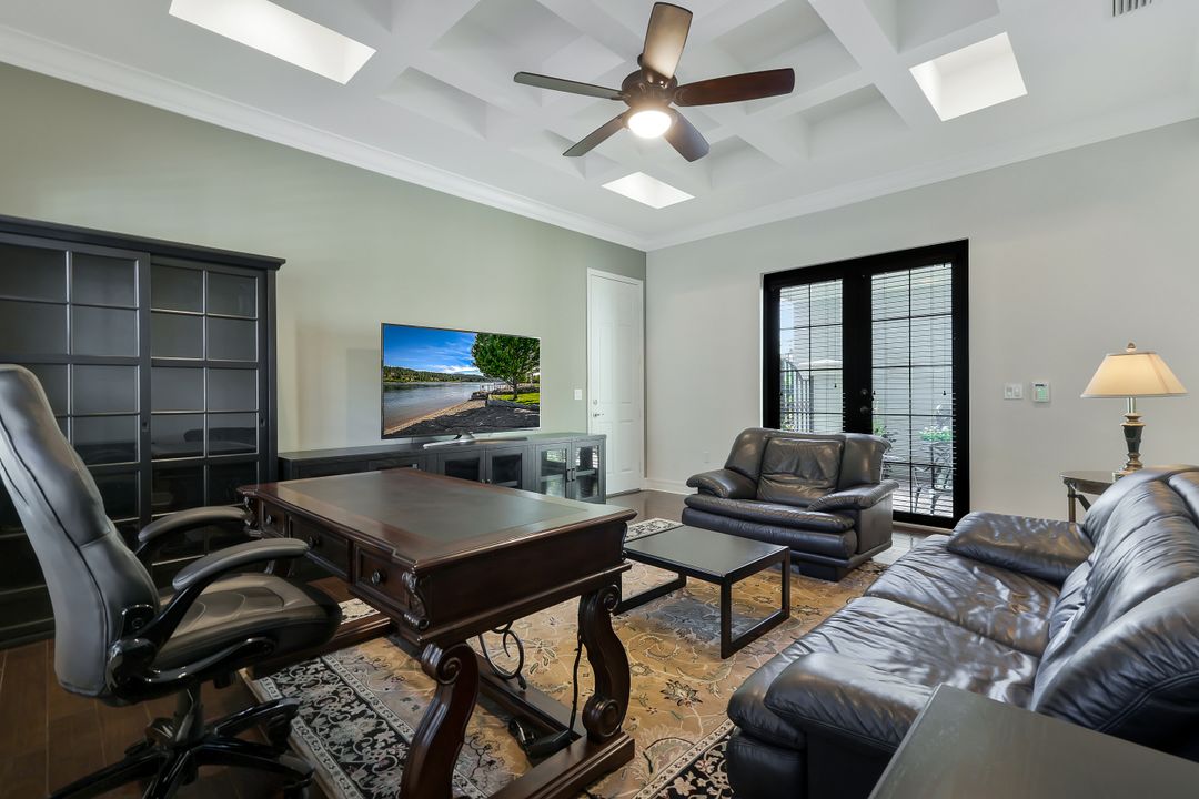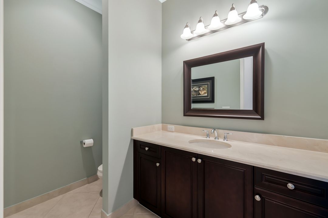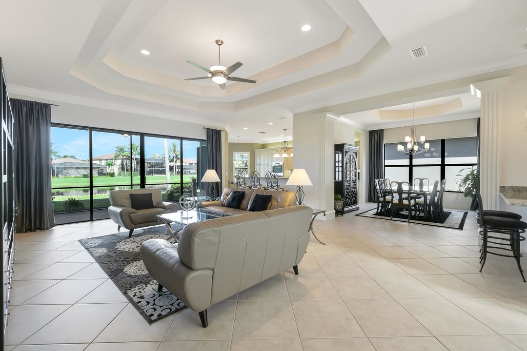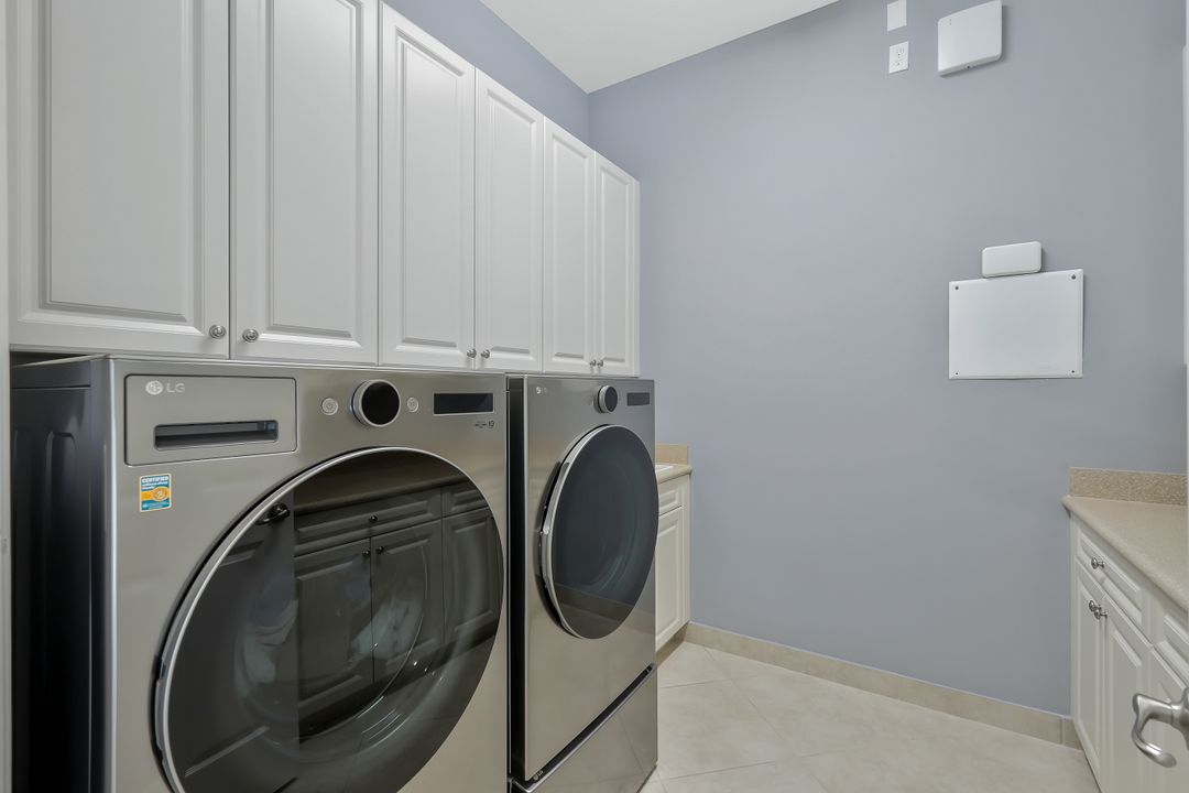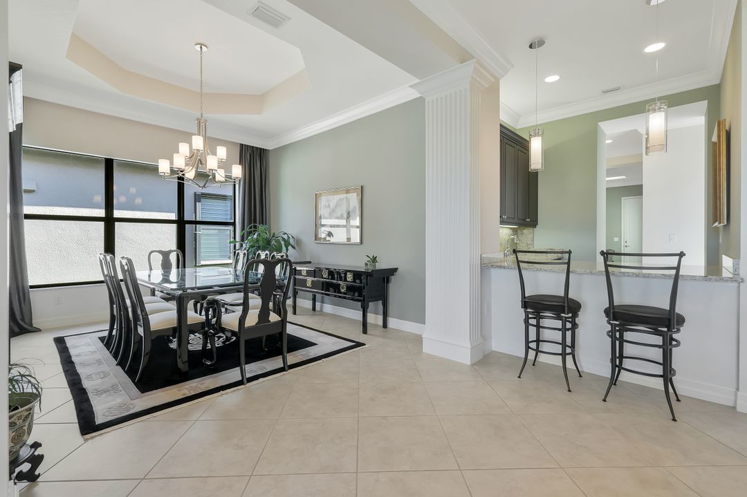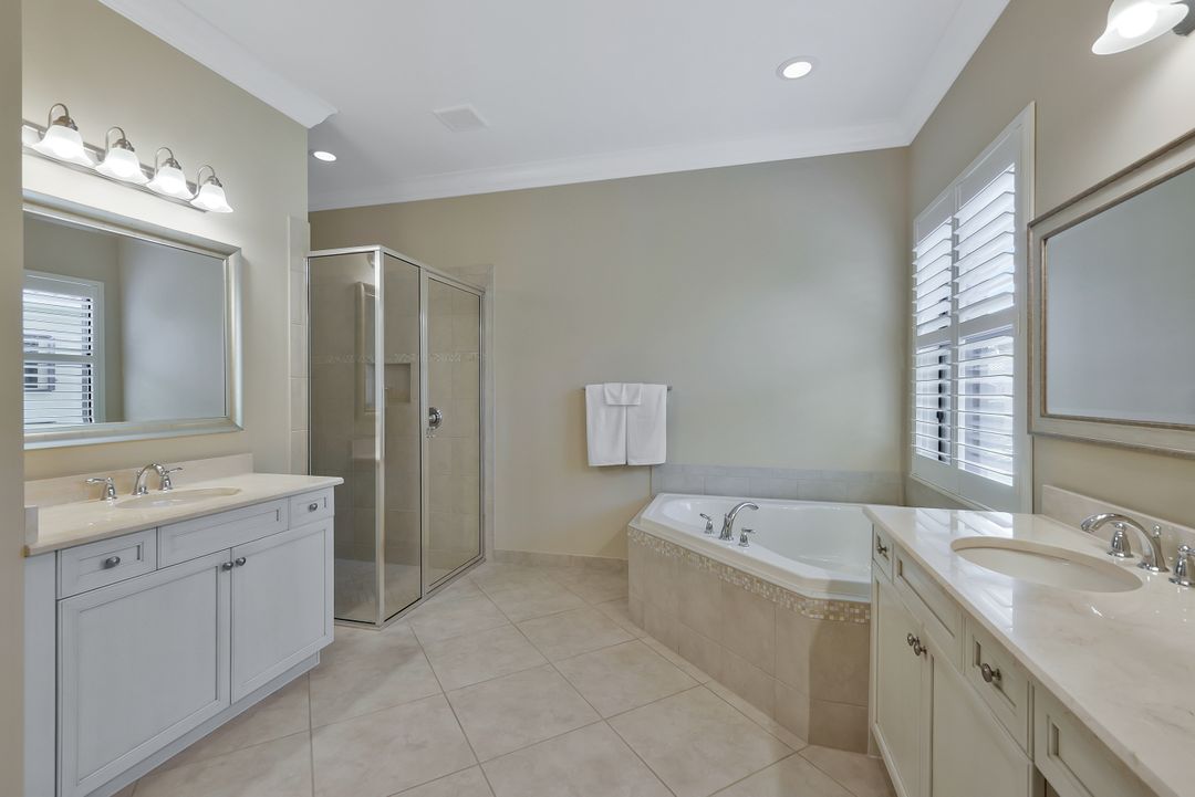 Sunsets over the lake and timeless elegance define this coveted 3,051 sq. ft. Carlyle, the most sought-after floor plan in Riverstone. Beyond the gated courtyard, double entry doors reveal an inviting layout designed for both easy everyday living and effortless entertaining. A spacious great room, formal dining room, wet bar with KitchenAid beverage fridge, and an adjacent custom wine storage rack for over 150 bottles make hosting unforgettable evenings a breeze. At the heart of the home, the gourmet kitchen features upgraded off-white shaker cabinetry, granite counters and backsplash, ambient lighting, and stainless-steel appliances including a double wall oven, vented hood over the cooktop, and a newer KitchenAid refrigerator—sure to inspire any culinary enthusiast. The versatile Club Room, finished with wood flooring and matching plantation shutters, is perfect as an office, den, or media retreat. The primary suite offers serene lake views, custom closets, and a spa-like bath with marble counters and decorative mirrors. Two private guest suites, each with a full bath and built-in closets, ensure comfort for family and friends. Thoughtful details include crown molding, wood-wrapped pillars, decorative mantlepiece, upgraded lighting fixtures and fans, and elegant window treatments. Everyday living is made easier with a finished laundry room offering a sink, ample cabinetry, folding counter, and a new (2024) LG washer and dryer. Peace of mind comes with a whole-home Generac generator powered by dual 120-gallon tanks, accordion shutters for quick storm prep, and an AC system with medical-grade UV lights and filters. The garage is equally functional with storage shelving and insulated doors. Expansive glass sliders flow seamlessly to the outdoors, where a west-facing lanai frames tranquil lake views and panoramic sunsets that fill the sky with vibrant color. The backyard offers abundant space to add a custom pool or design your own custom tropical oasis. Here, unforgettable gatherings, quiet moments, and golden sunsets become part of everyday life. Riverstone offers a vibrant, vacation-inspired lifestyle for all ages. Located in North Naples, just minutes from I-75 and zoned for "A"-rated schools, the community features a fitness center, social hall, resort-style pool, lap pool, spa, five lighted tennis courts, outdoor basketball and pickleball, a full indoor basketball court, tot lot, children’s water play area, game room, and an activities coordinator; making it easy to meet new friends. Perfectly suited for entertaining, unwinding, or savoring the view, this home captures the essence of Naples living.