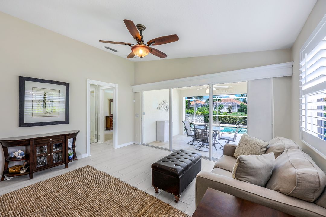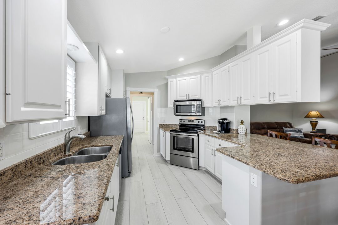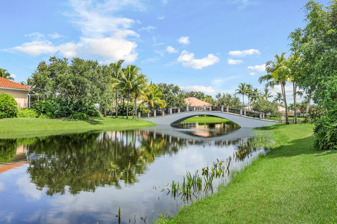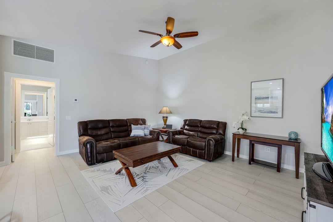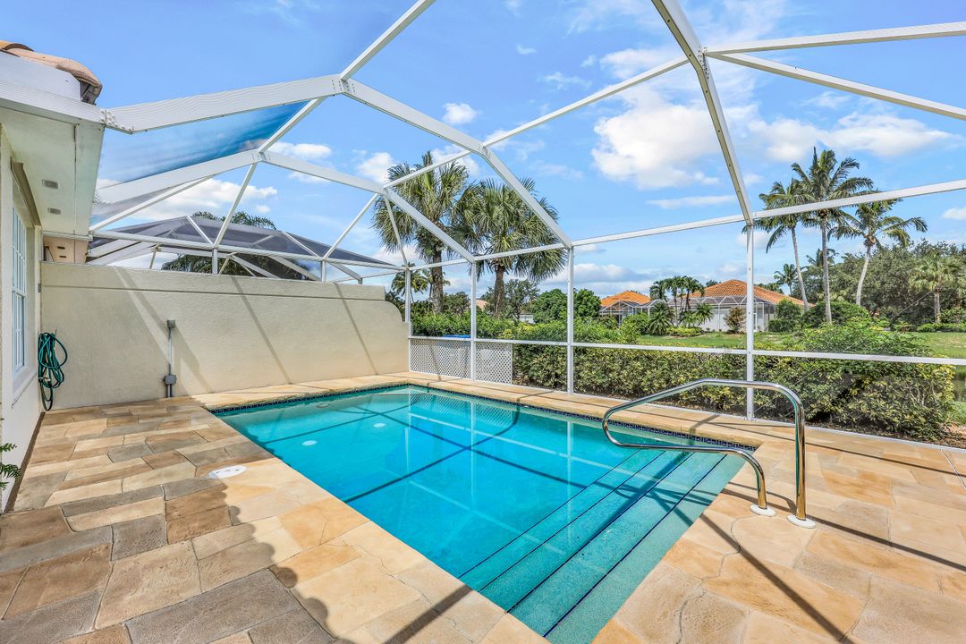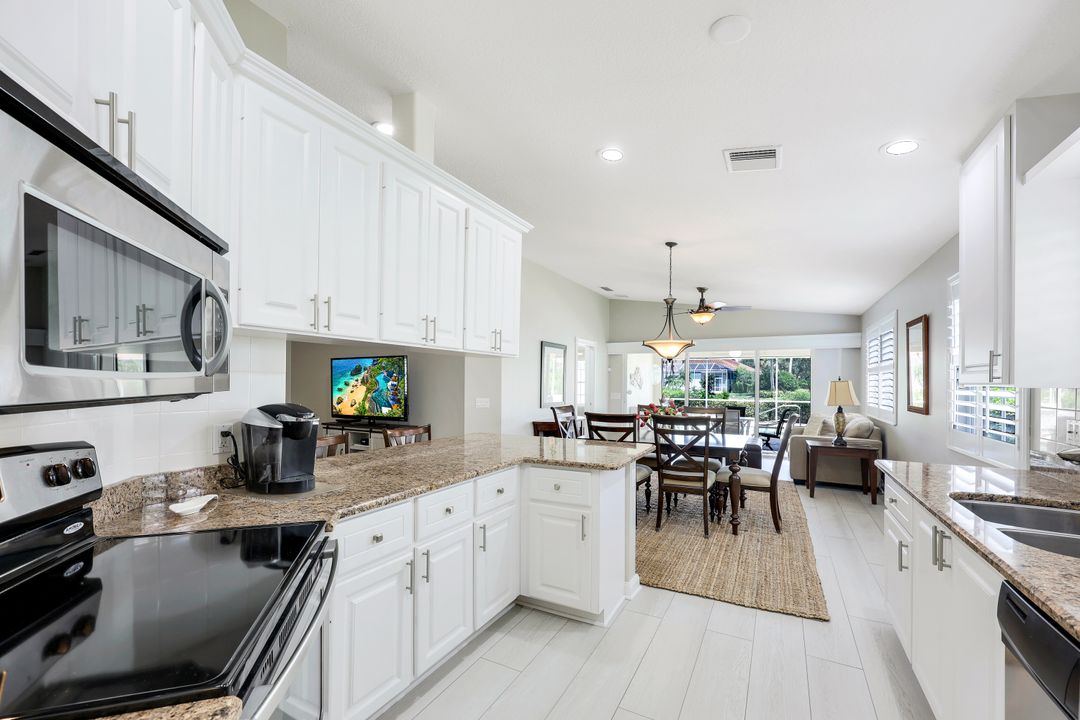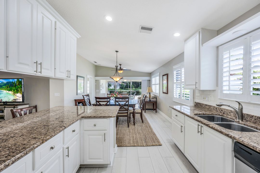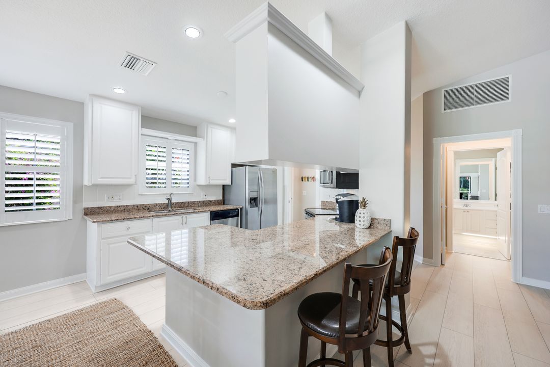 Lakefront 2-bedroom+den villa in fabulous ISLAND WALK with 2-car garage, heated pool, new roof (2021), new luxury vinyl flooring, new paint, new flooring in bathrooms, updated travertine pool deck, granite counters in kitchen, stainless steel appliances, plantation shutters, privacy shades on sliding doors, bedrooms with crown molding and walk-in California-style closets. Available furnished or unfurnished.