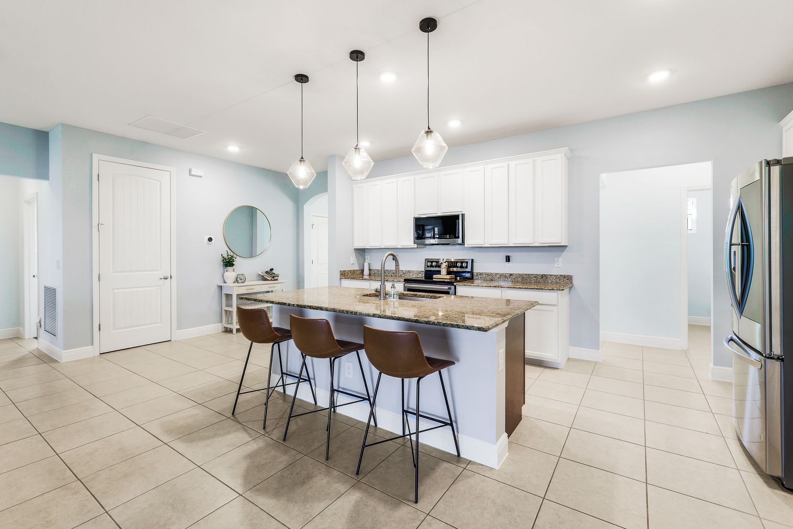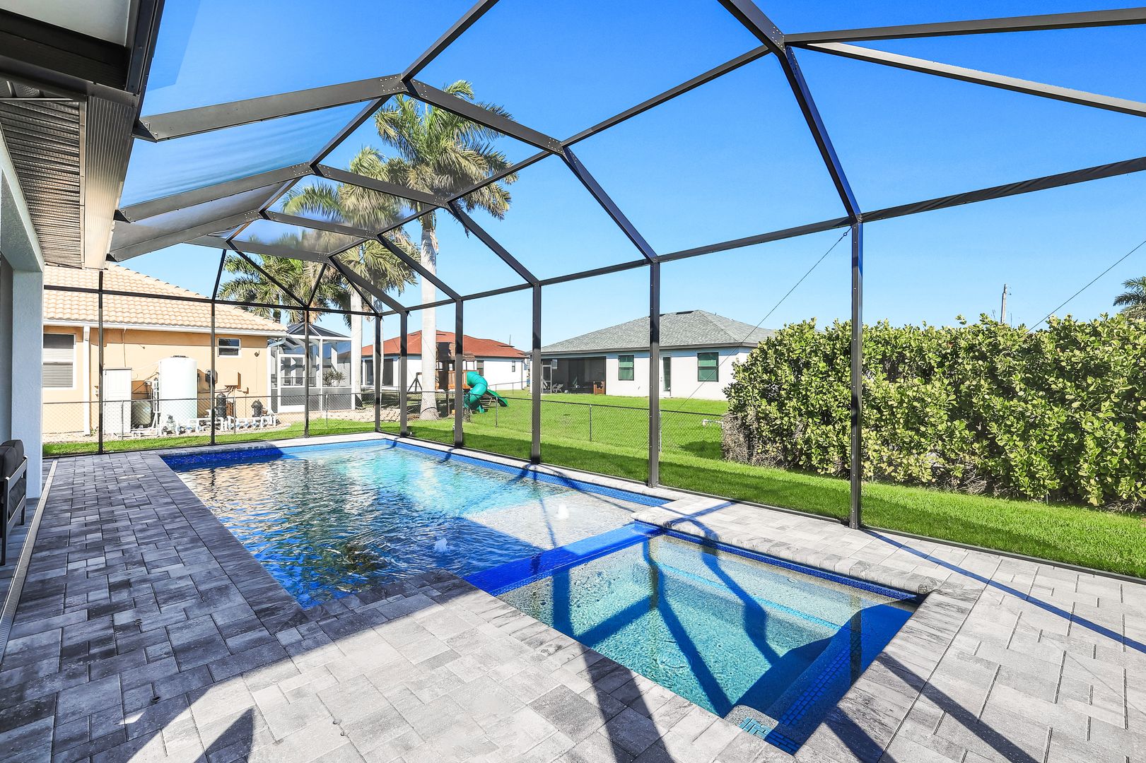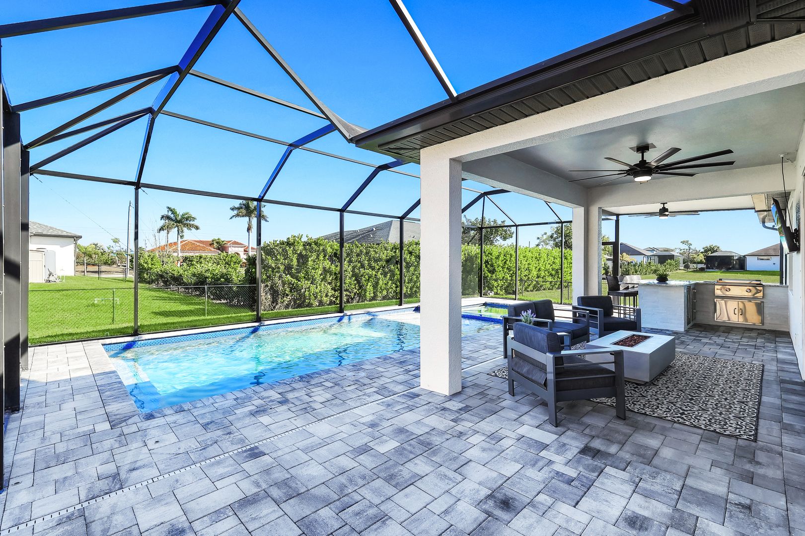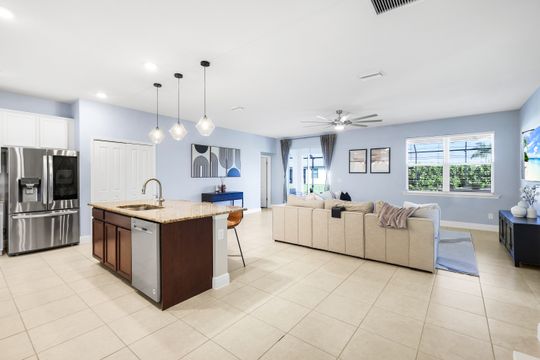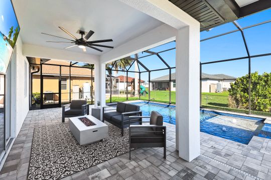 Located in Northwest Cape Coral, this 2018-built residence offers a sophisticated blend of modern design and functional living. Featuring three bedrooms plus den and two bathrooms, the interior is defined by an open-concept great room layout with durable tile flooring in the main living areas and a versatile den perfect for a home office, hobby area, or quiet retreat. The home is centered around a gourmet kitchen finished with granite countertops, large pantry, and stainless steel appliances. For more formal occasions, the home includes a dedicated dining room, providing an elegant setting for hosting dinner parties and holiday gatherings. Relax in the oversized primary bedroom, complete with an huge walk-in closet and a spacious bathroom featuring an open-concept shower. The living space transitions seamlessly to the outdoors, where a large screened lanai serves as a private sanctuary for relaxation and entertainment. This outdoor area features a heated pool and spa package with sunshelf, fully enclosed within a cage to ensure year-round enjoyment of the Florida weather. Exceptional attention was paid to the outdoor kitchen space, which includes an expansive setup equipped with a professional-grade griddle, a beverage refrigerator, granite countertops, and sleek stainless steel storage cabinetry. Additional upgrades include whole-house reverse osmosis system, stylish lighting fixtures, wood apron window sills, fence, gutters on all sides, epoxy garage floor, and EV charging outlet. Experience the peace of mind of newer construction paired with premium details. This home is well positioned in a highly desirable area, offering easy access to the upcoming Seven Islands project, neighborhood parks, and the convenient Burnt Store Road corridor.