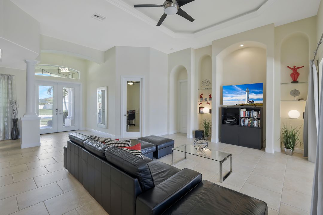 Discover the ultimate Florida lifestyle in this immaculately maintained and fully furnished single-family home, offering 4 spacious bedrooms, a versatile den, and 3 full bathrooms. This residence is move-in ready with tile flooring throughout and features impact-resistant sliders, doors, and windows for peace of mind and storm protection, and has never experienced flooding since it was built, making it a rare find in today’s market.