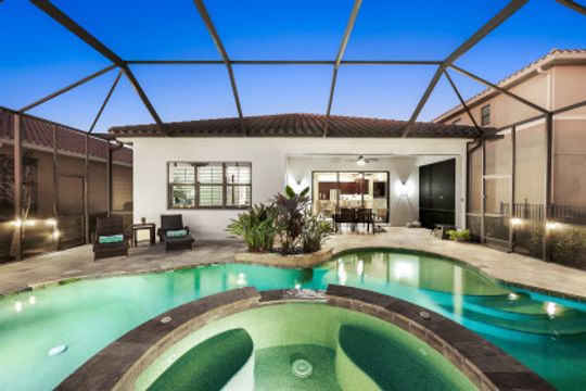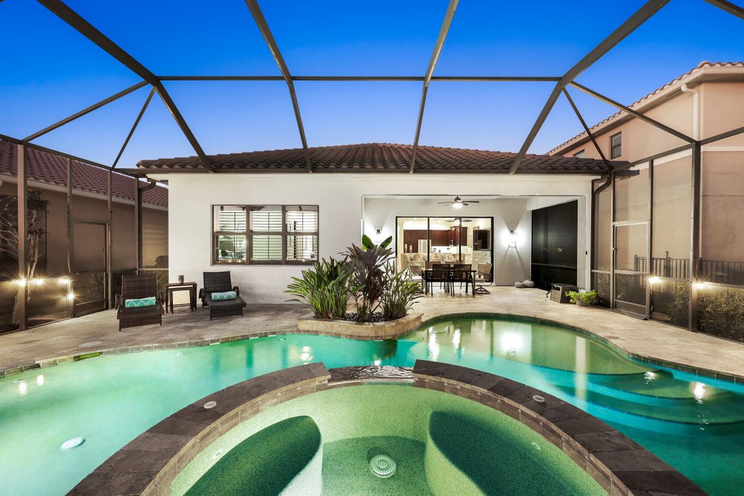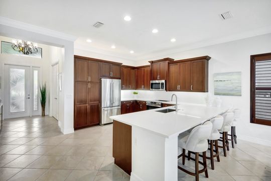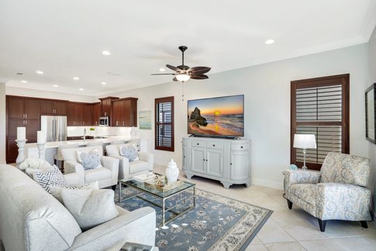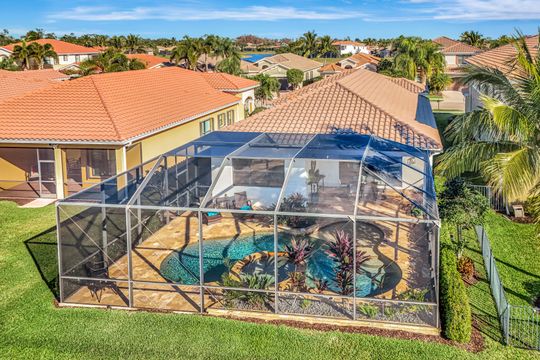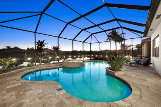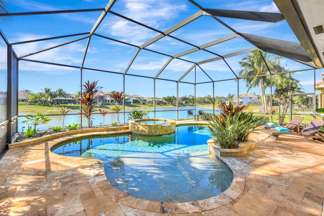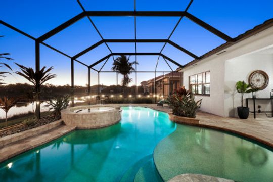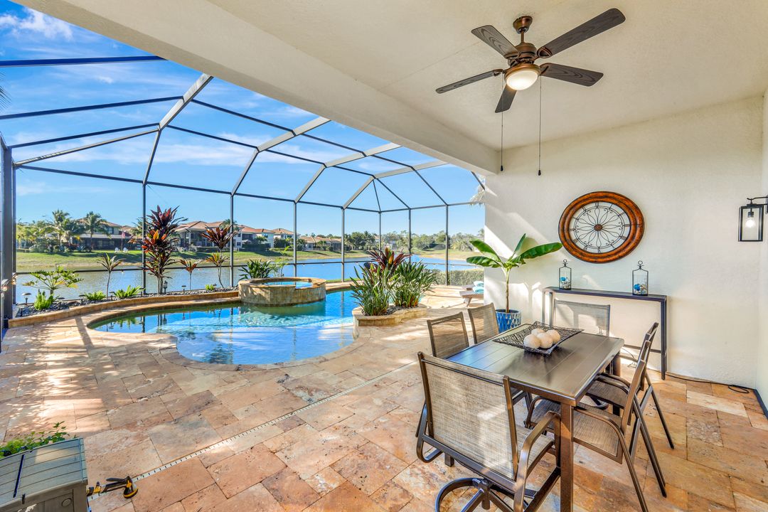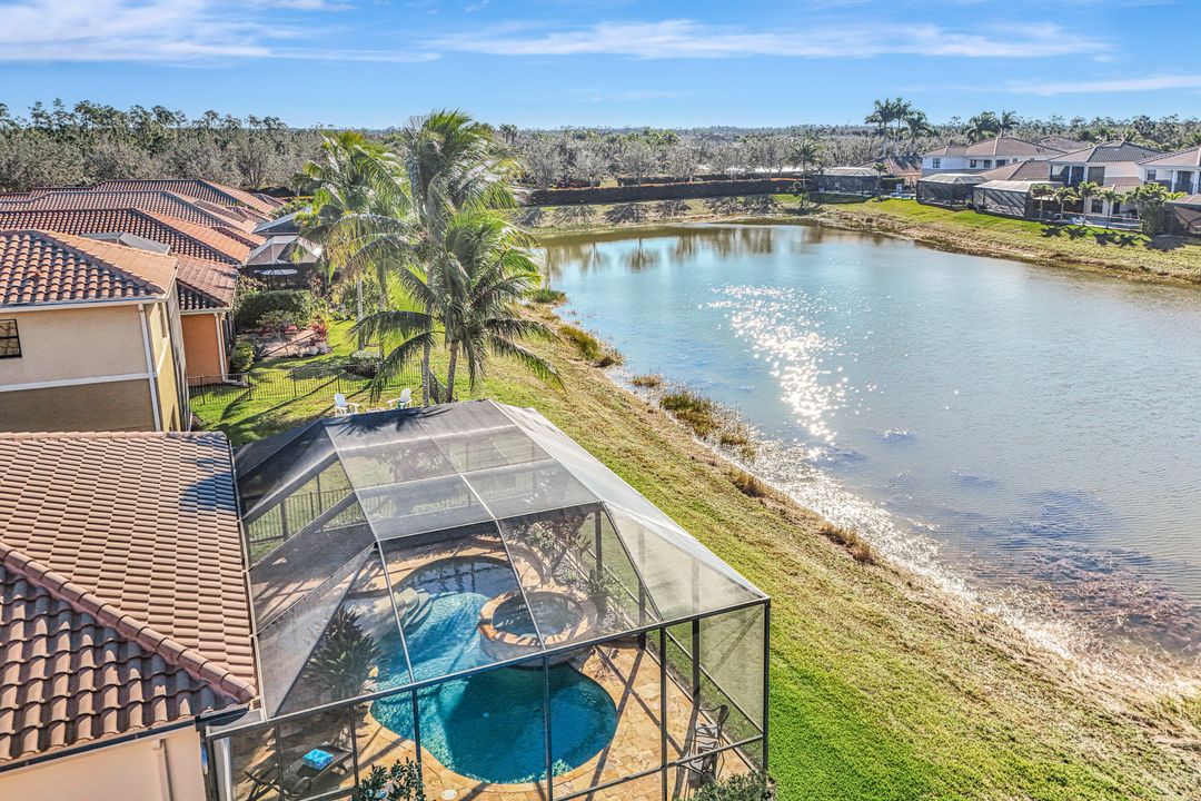 Paradise is calling. Live as though you are on vacation every day in this meticulously maintained, tastefully appointed residence designed to embrace the very best of the Naples lifestyle. Enjoy effortless outdoor living as you comfortably dine alfresco in the screened lanai enhanced by travertine pavers, cool off in your saltwater pool, or soak in the relaxing spa, all while enjoying a sunny southern lake view. Upon entry, the foyer’s soaring 13-foot coffered ceiling immediately draws your eye out to a sparkling water view. The Burgundy floor plan is perfect for entertaining allowing guests to mingle comfortably between the great room, dining room & open kitchen. The light-filled kitchen is truly the heart of the home, featuring stunning new quartz counters that continue up into backsplash, an oversized dining counter, newer dishwasher, new range, new deep sink, new faucet, wood cabinetry with updated hardware & ambient cabinet lighting. The serene primary suite overlooks the lake and offers dual custom finished walk-in closets & well-appointed bath with wood cabinets, new quartz counters and new sinks; echoing the kitchen finishes. Frameless glass shower door, framed mirrors and a soaking tub polish off this calming space. A privately positioned second bedroom includes a custom closet and is adjacent to a full bath updated with new quartz countertops, new sink, and framed mirror. The third bedroom is great for guests or easily functions as a cozy den. Impressive interior details include plantation shutters, decorator lighting and fans, a built-in linen cabinet, decorative glass at the entry door, porcelain tile set on the diagonal, a wood-framed slider, crown molding, and new luxury vinyl plank flooring in the bedrooms. Recent improvements also include fresh exterior paint, built-in shelving and a barn door added to the third bedroom closet, and a new HVAC system to ensure year-round comfort. Finished laundry includes pedestaled washer & dryer, upper & lower cabinetry with folding counter & oversized storage closet. Seller is licensed broker. Located in Riverstone offering a vibrant, vacation-inspired lifestyle for all ages. The community features a fitness center, social hall, resort-style pool, lap pool, spa, five lighted tennis courts, outdoor basketball and pickleball, a full indoor basketball court, tot lot, children’s water play area, game room, and an activities coordinator; making it easy to meet new friends. The North Naples location is just minutes from I-75, with convenient proximity to fabulous beaches, dining, golf and shopping. This is more than a home—it is an invitation to slow down, savor the sunshine, and start living the Naples lifestyle you have been waiting for.