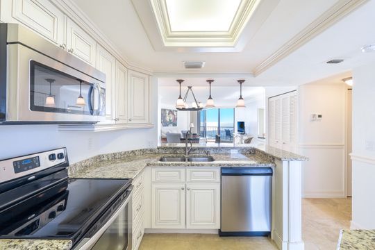 Stunning sunsets and sunrises are yours to enjoy from this renovated condominium right on the gorgeous, white sandy beach of Marco Island. Captivating and breathtaking wide water and island views from every room including the famous Tigertail Beach. Inviting open floor plan, spacious kitchen, custom made cabinets, stainless steel appliances, granite counter tops, crown molding, tile throughout, and high impact windows for extra peace of mind. The open balcony is the ideal setting to sip your morning coffee or your favorite happy hour drink, entertain or simply relax and embrace the soothing breeze, the sound of the waves and the tropical scenery. Offered turnkey furnished, ready to move in for your personal enjoyment or to make it your rental investment. South Seas is the only complex on Marco Island offering beach and boat docks available for lease along with fabulous amenities to suit any lifestyle including pool, tennis and pickle ball courts, bike and kayak storage, exercise room, shuffleboard, barbecue/picnic area, manicured landscaped grounds, and on-site management. All this in a centrally located Gated Community walking distance to shops and restaurants. Paradise awaits you.
