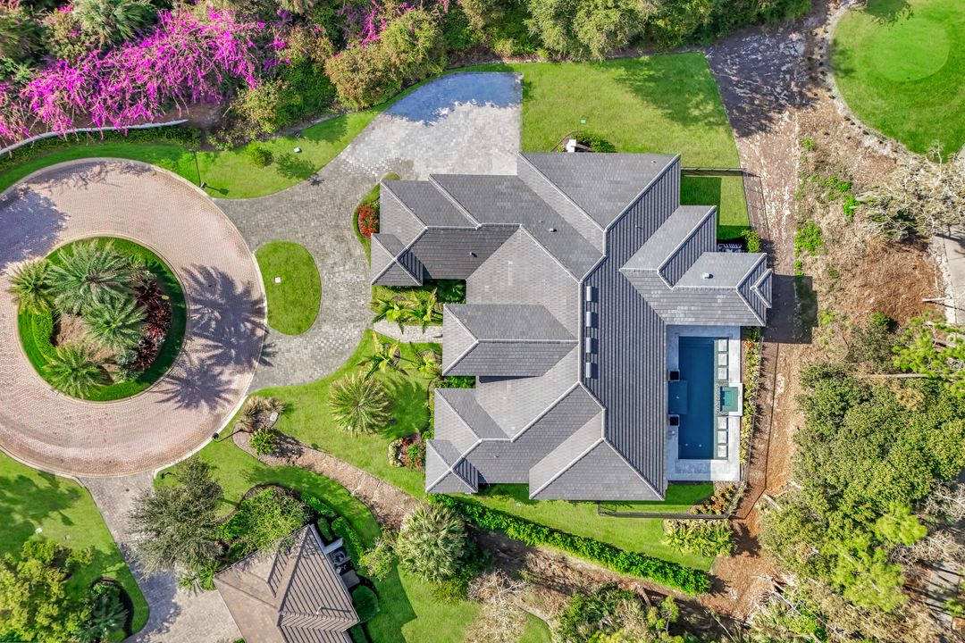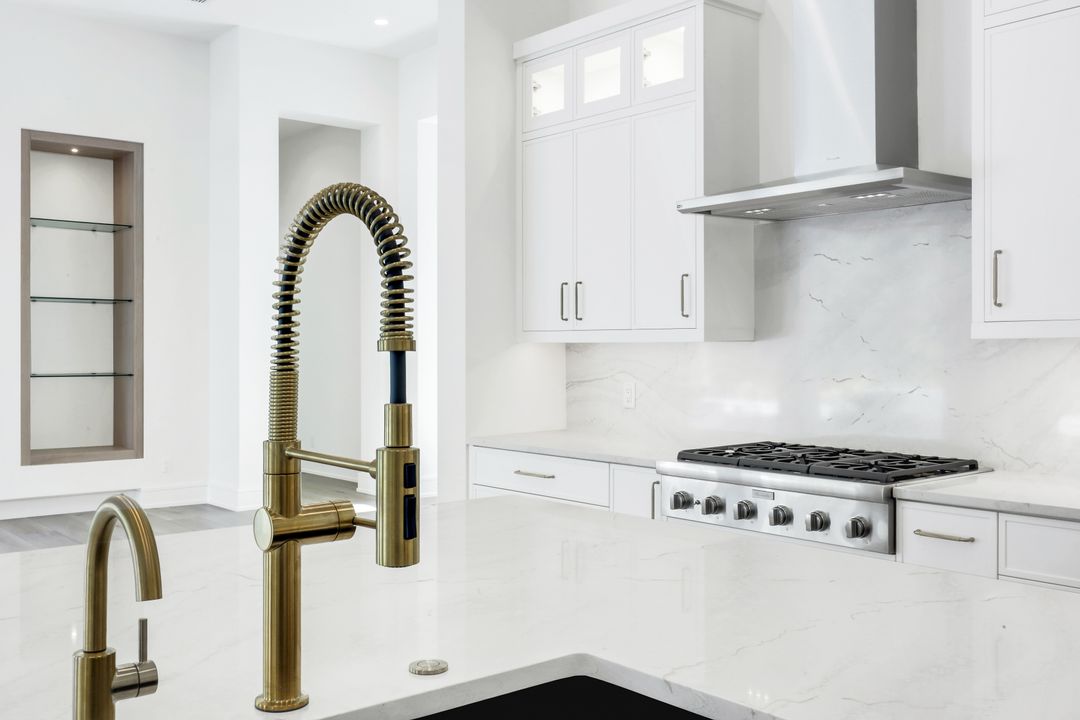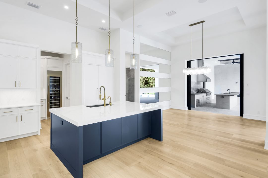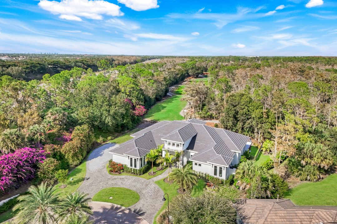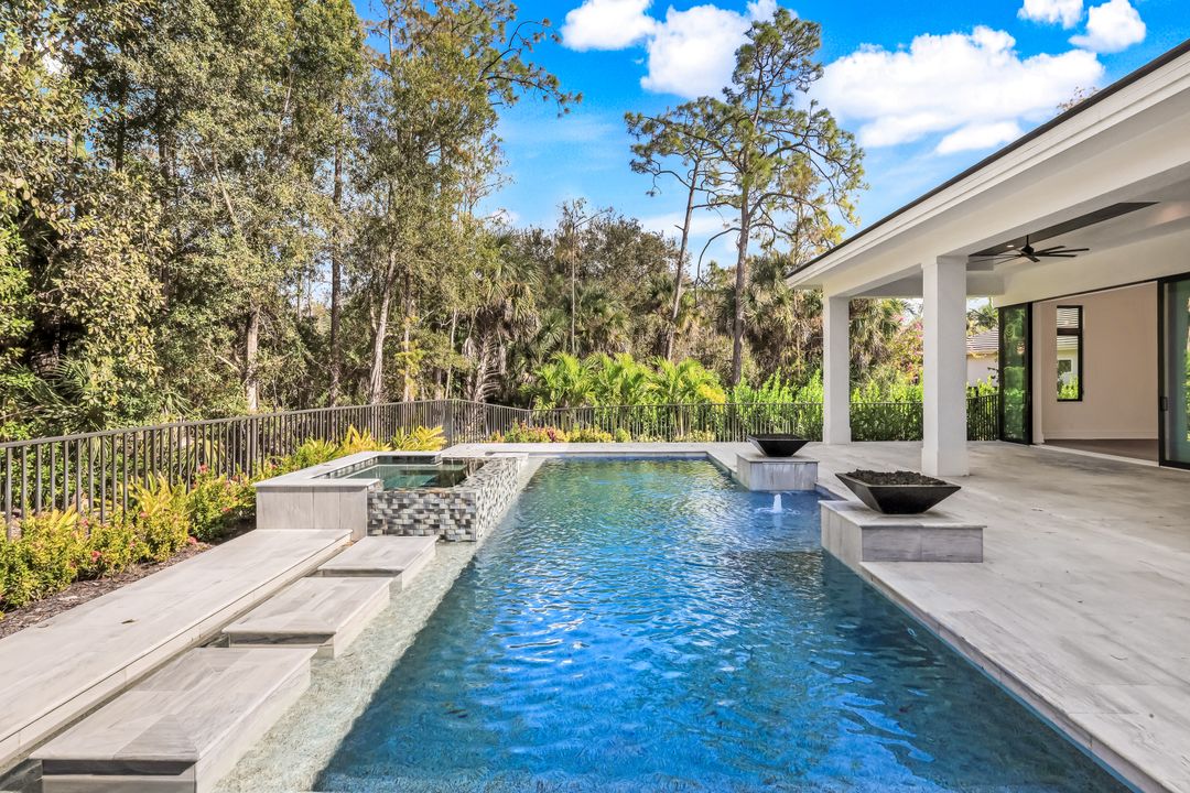 TRANSFERABLE GOLF MEMBERSHIP AVAILABLE – NO WAITLIST. Be the first to enjoy this exceptional new construction residence by Florida Lifestyle, offering immediate access to golf through a transferable membership—an extraordinary opportunity in Quail West. Privately situated at the end of a quiet cul-de-sac, the home delivers peaceful seclusion while maintaining picturesque golf course views. Designed with a desirable split floor plan, the home features four spacious en suite bedrooms, including a serene, spa-inspired primary suite with custom walk-in closets, a soaking tub, expansive multi-head walk-in shower, dual vanities, and separate water closets. A nearby study, accented by a custom shiplap feature wall, opens directly to the lanai—perfect for work or relaxation. The open-concept living area is ideal for entertaining, flowing seamlessly from the gathering room with coffered ceilings and custom lighting into the dining area and gourmet kitchen. The dining room’s elegant mirrored accent wall adds a striking architectural touch, while the chef’s kitchen is equipped with Thermador appliances, dual ovens, and an oversized breakfast bar. Enhancing functionality is a spectacular butler’s pantry featuring a second dishwasher, sink, microwave, wine refrigerator, walk-in pantry, and abundant storage—making entertaining effortless. Hurricane-rated sliding glass doors open to a generous covered lanai with outdoor kitchen and fireplace. Outdoors, unwind by the resort-style pool with sun shelf, spa, and tranquil water and fire features—your own private oasis. Located within amenity-rich Quail West, a hidden gem in North Naples, residents enjoy Platinum Club® status, ranking among the top 1% of private clubs worldwide. Amenities include two championship golf courses, an elegant clubhouse with multiple dining venues, racquet sports complex, bocce courts, state-of-the-art fitness center, full-service salon and spa, and a vibrant calendar of activities.