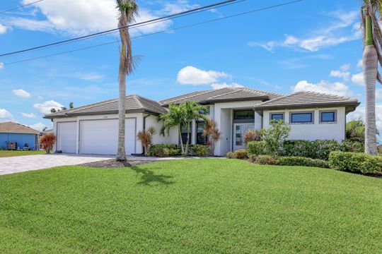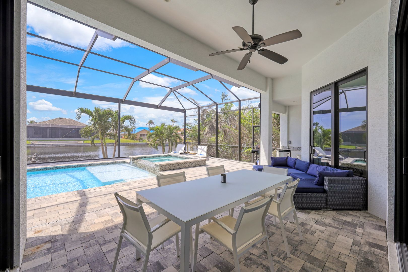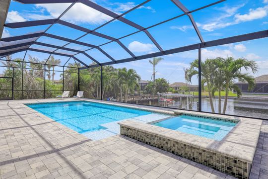 Captivating Contemporary Gulf Access Western Exposure home on a wide canal in the highly saught after SW of Cape Coral. The decorative drive- and walkway lead to a beautiful double-door entry that grants you a view of the dining, kitchen, and pool areas fit for the Florida lifestyle. Entertaining is a breeze in this tastefully decorated and furnished home with open floor plan. Great room impresses with 9ft sliding doors leading out to the large pavered lanai with electrically heated oversized pool & spa. Other features include a gourmet kitchen with center island, stainless steel appliances, an outdoor kitchen, a spacious laundry room with separate storage, and a 3-car garage with epoxy flooring. Kevlar screens and impact windows & doors for hurricane protection. Boating enthusiasts will for sure appreciate the PVC boat dock with 10k lb boat lift. Home is sold turnkey and was a successful vacation rental.