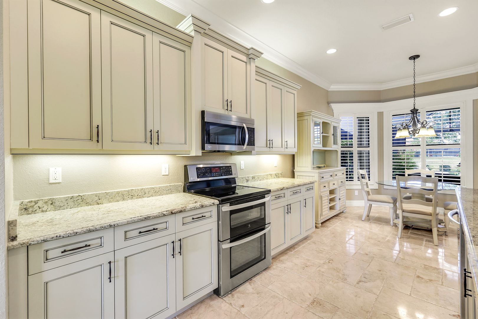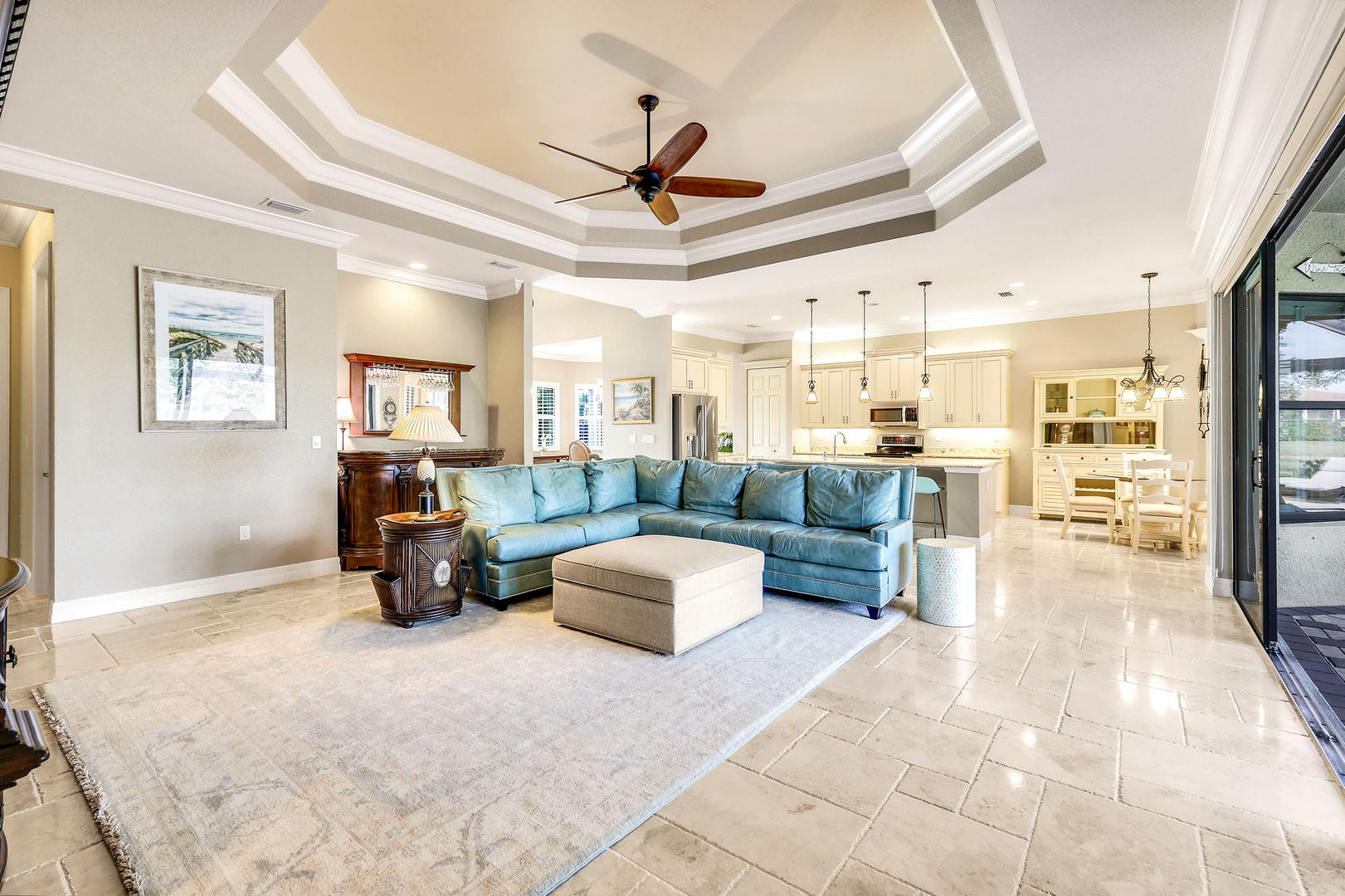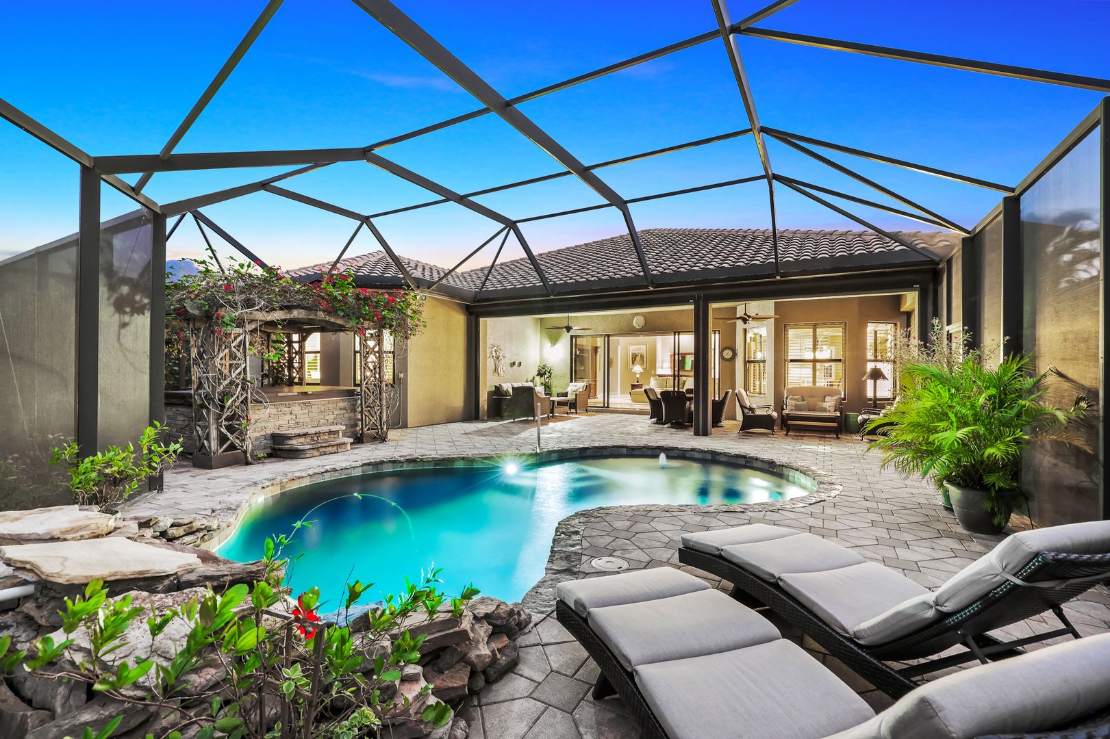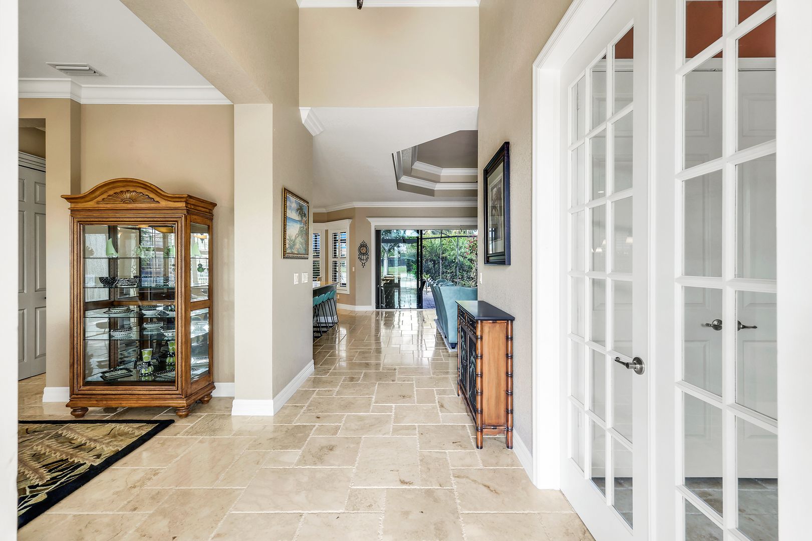 This Bellagio estate home is designed for effortless entertaining and relaxed Southwest Florida living, offering generous space, refined finishes, and exceptional outdoor amenities. A grand 14-foot entry foyer with coffered ceiling sets the tone, opening to chiseled-edge marble flooring that flows throughout the home. The expansive great room and formal dining area create a welcoming environment for both everyday living and hosting guests. The chef’s kitchen is a true centerpiece, featuring an oversized island, granite countertops, upgraded 42-inch glazed cream cabinetry, ambient lighting, and stainless-steel LG appliances, including a new LG refrigerator. Four well-proportioned bedrooms provide versatility, including one set behind elegant glass French doors that would make an ideal home office or den. The owner’s suite offers a peaceful retreat with dual custom-finished walk-in closets and a spa-inspired bath with double vanities, soaking tub, and walk-in shower. Additional highlights include crown molding, decorative trim above slider and kitchen windows, plantation shutters, designer lighting, ceiling fans, a laundry room with utility sink and LG washer & dryer, epoxy-finished garage floor, and a newer HVAC system. The home is offered furnished in a relaxed, Tommy Bahama–inspired style, making it ideal as a move-in-ready second home or full-time residence. Step outside to an extra-high screened lanai with a picture window framing a serene lake view. A custom free-form saltwater pool with waterfall feature & sun shelf anchors this private, resort-style retreat. Indoor-outdoor living takes center stage beneath the expansive covered lanai, approximately 34 by 12 feet, offering generous space for both lounging and dining. A Hot Springs hot tub beneath a pergola provides an inviting place to unwind at day’s end, while beyond the lanai, the thoughtfully designed backyard is lushly landscaped for added privacy and tranquility. Electric Storm Smart screens provide protection, privacy, and peace of mind. Quietly situated on a cul-de-sac street and conveniently close to the clubhouse. Riverstone offers a vibrant, vacation-inspired lifestyle for all ages. Located in North Naples, just minutes from I-75 and zoned for "A"-rated schools, the community features a fitness center, social hall, resort-style pool, lap pool, spa, five lighted tennis courts, outdoor basketball and pickleball, a full indoor basketball court, tot lot, children’s water play area, game room, and an activities coordinator; making it easy to meet new friends. Don’t miss your chance to step into the Naples lifestyle. Your dream home awaits, ready to enjoy from the moment you arrive.