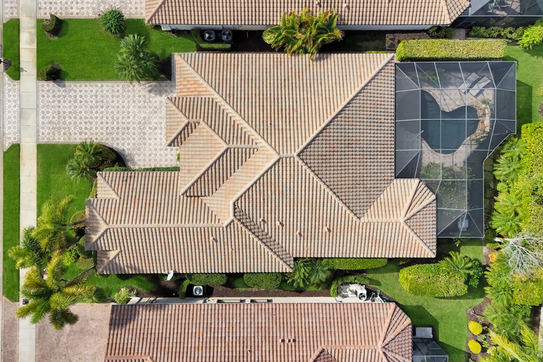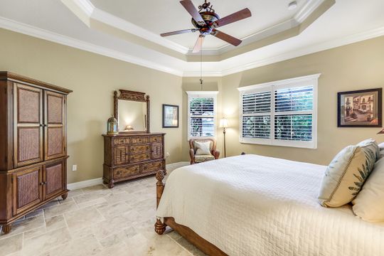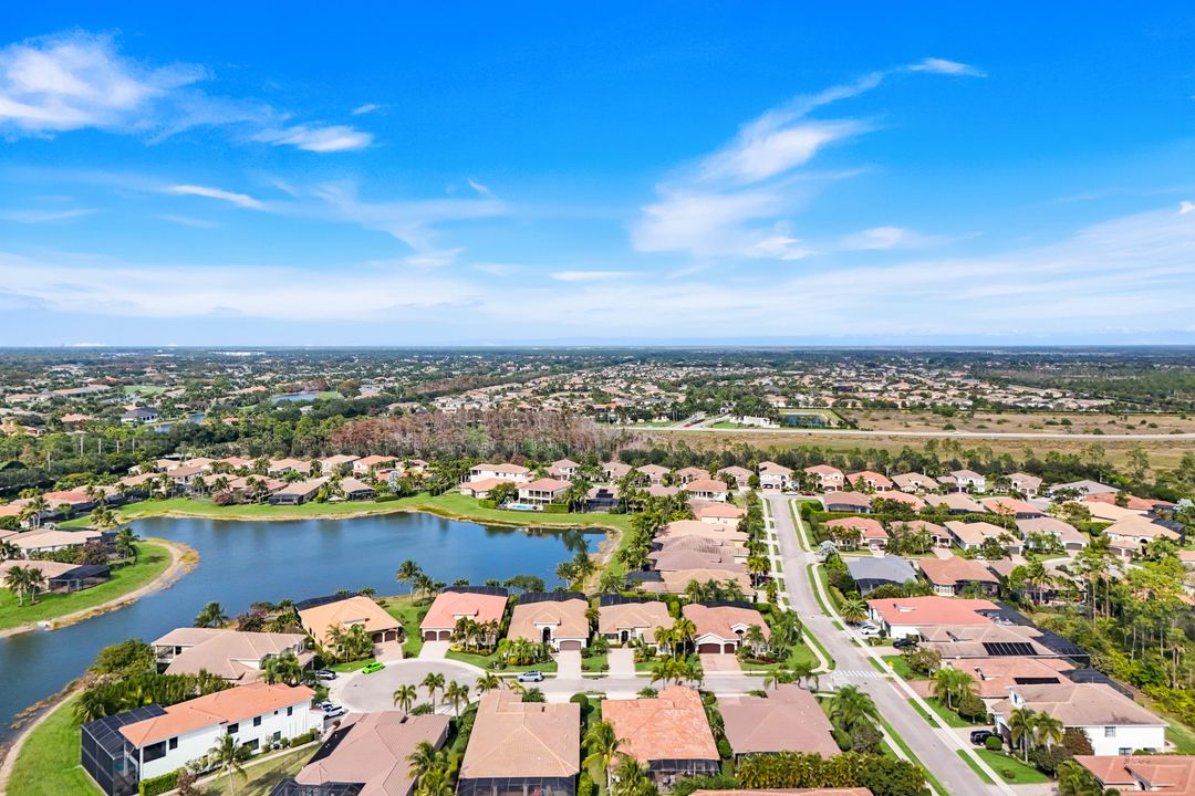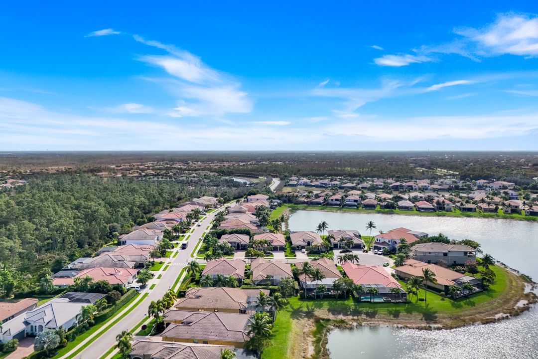 This Bellagio estate home is designed for effortless entertaining and relaxed Southwest Florida living, offering generous space, refined finishes, and exceptional outdoor amenities. A grand 14-foot entry foyer with coffered ceiling sets the tone, opening to chiseled-edge marble flooring that flows throughout the home. The expansive great room and formal dining area create a welcoming environment for both everyday living and hosting guests. The chef’s kitchen is a true centerpiece, featuring an oversized island, granite countertops, upgraded 42-inch glazed cream cabinetry, ambient lighting, and stainless-steel LG appliances, including a new LG refrigerator. Four well-proportioned bedrooms provide versatility, including one set behind elegant glass French doors that would make an ideal home office or den. The owner’s suite offers a peaceful retreat with dual custom-finished walk-in closets and a spa-inspired bath with double vanities, soaking tub, and walk-in shower. Additional highlights include crown molding, decorative trim above slider and kitchen windows, plantation shutters, designer lighting, ceiling fans, a laundry room with utility sink and LG washer & dryer, epoxy-finished garage floor, and a newer HVAC system. The home is offered furnished in a relaxed, Tommy Bahama–inspired style, making it ideal as a move-in-ready second home or full-time residence. Step outside to an extra-high screened lanai with a picture window framing a serene lake view. A custom free-form saltwater pool with waterfall feature & sun shelf anchors this private, resort-style retreat. Indoor-outdoor living takes center stage beneath the expansive covered lanai, approximately 34 by 12 feet, offering generous space for both lounging and dining. A Hot Springs hot tub beneath a pergola provides an inviting place to unwind at day’s end, while beyond the lanai, the thoughtfully designed backyard is lushly landscaped for added privacy and tranquility. Electric Storm Smart screens provide protection, privacy, and peace of mind. Quietly situated on a cul-de-sac street and conveniently close to the clubhouse. Riverstone offers a vibrant, vacation-inspired lifestyle for all ages. Located in North Naples, just minutes from I-75 and zoned for "A"-rated schools, the community features a fitness center, social hall, resort-style pool, lap pool, spa, five lighted tennis courts, outdoor basketball and pickleball, a full indoor basketball court, tot lot, children’s water play area, game room, and an activities coordinator; making it easy to meet new friends. Don’t miss your chance to step into the Naples lifestyle. Your dream home awaits, ready to enjoy from the moment you arrive.