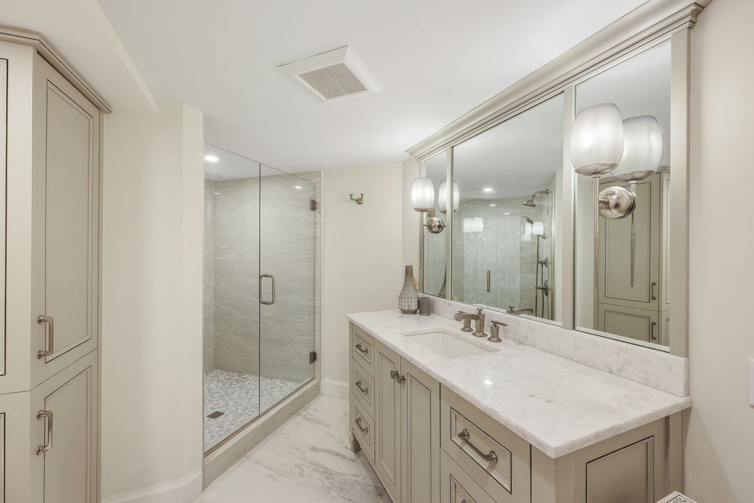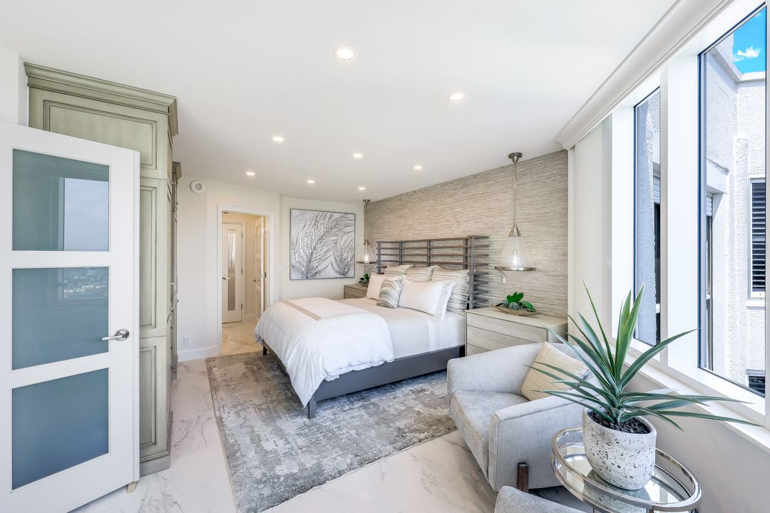 Welcome to your Penthouse in the Sky. This custom architectural designed TWO story 3 bedroom, 3 and 1/2 bathroom penthouse was renovated in 2019 by Edgewater Builders. The incredible views over Venetian Bay from the 16 foot wall of glass are just spectacular. Gulf views are present from both guest suites and from both Savoy community sun decks. After you peel your gaze away from the views, you will be drawn to the kitchen, with custom Ruffino cabinetry, Jenn-Air appliances, a large center island with quartzite countertops and extra storage and a custom built in bar area, allowing for enjoyable entertaining. This property has 3 en-suite bedrooms, a separate downstairs powder room and a laundry room. It features impact windows, custom electric window treatments, abundant lighting and large tile throughout. It is laid out with all of your entertaining space downstairs and a convenient downstairs guest bedroom suite. A wide spiral staircase will take you to the primary bedroom suite, another guest bedroom suite and an office loft. Penthouse 6 is being offered designer furnished. Enjoy a coveted location directly across from the finest shops and restaurants at Venetian Village on Park Shore Beach, allowing immediate access to the beautiful powder sand beaches. The Savoy is accessed through a 24 hour manned gate and has onsite security. Amenities include a large heated pool and spa, tennis, pickleball, grilling area, firepit, fitness center, community room, and TWO sunset decks. The building allows up to twelve 30 day leases a year (rare for this area), making it not only a wonderful home, or second home, but also a flexible investment opportunity. The building does not allow pets.