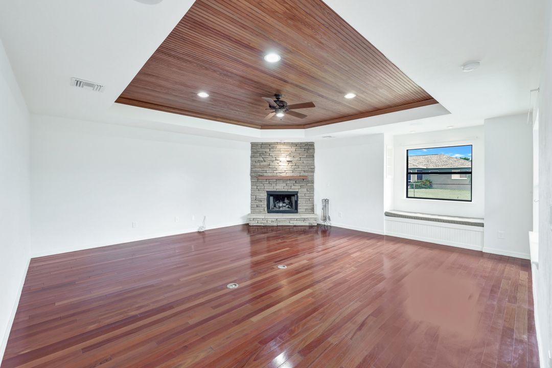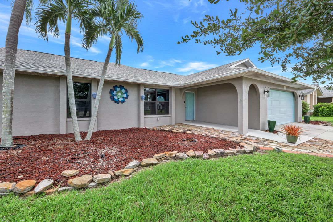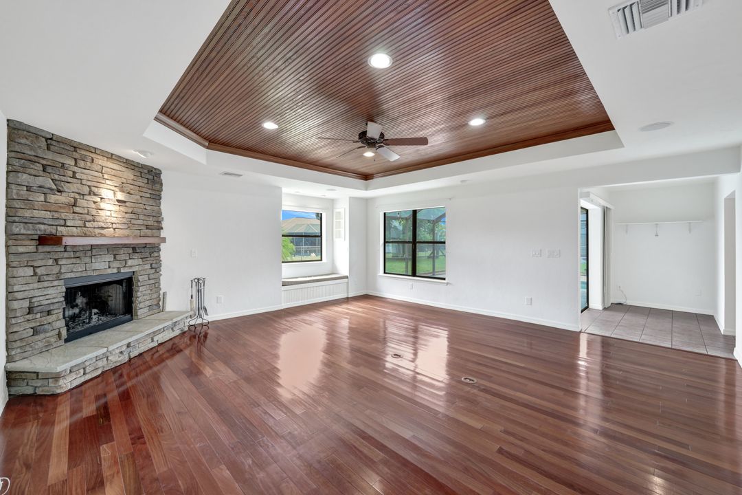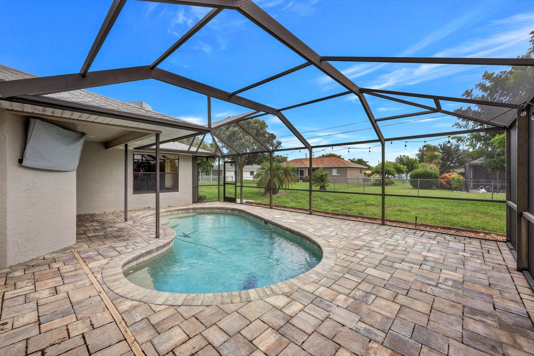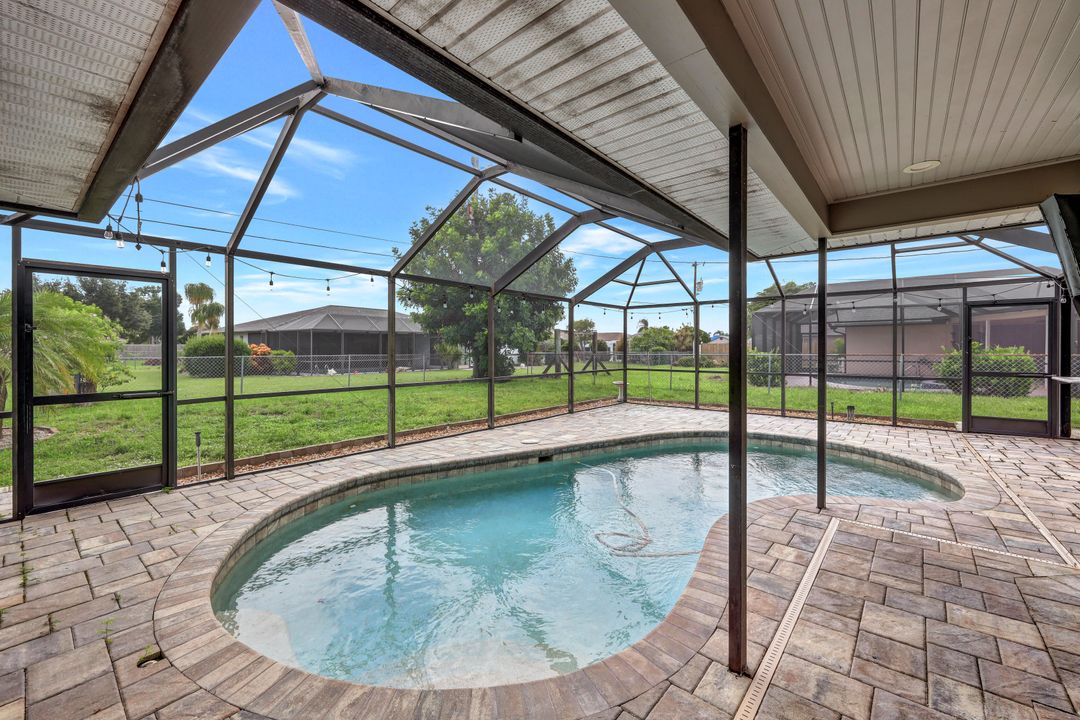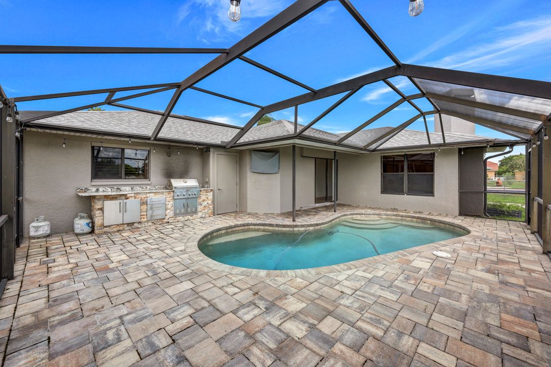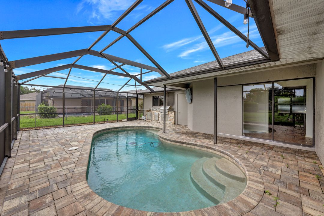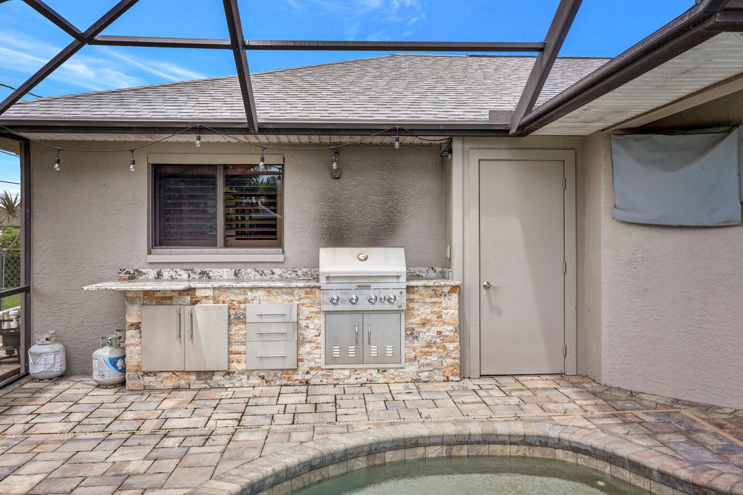 Price Reduction on this beautiful Pool Home w/Eastern Exposure! This upgraded beauty offers over 1800 sqft of living space including 3 bedrooms, 2 bathrooms, and an additional living area featuring a cozy fireplace and a stunning wood feature ceiling. The kitchen boasts granite countertops throughout, a large walk in pantry, tile backsplash and breakfast bar. The high vaulted ceilings and straight stacked tile in all main areas of the house adds a modern touch to the interior. Outdoor living checks all the boxes featuring sparkling blue chlorine pool, pavered patio PLUS incredible built in summer kitchen featuring stacked stone built-in, propane grill, storage and granite countertop which is perfect for the summer BBQ and entertaining family and guests! New shingled roof and A/C unit were installed in 2022; garage doors replaced in 2021 and plumbing repipe done in 2020. Front of home is protected with impact glass while the remaining openings have manual shutters. Flood zone X and assessments are in and PAID in full! Conveniently located near Cape Coral Hospital, schools, shopping centers, fitness clubs, and 10 just minutes to downtown Fort Myers! You can have it all! This home offers style and comfort for your family plus convenient location! Call and schedule your private viewing today! Bring all offers!!