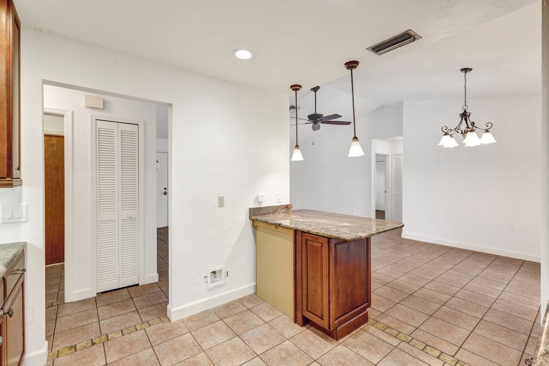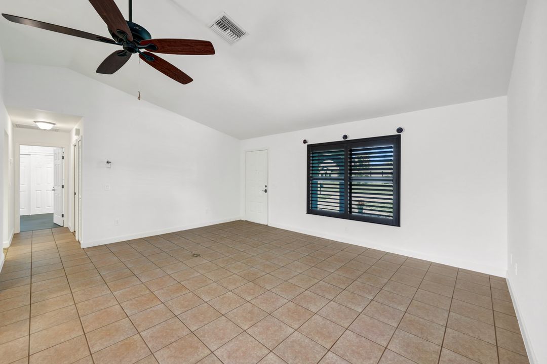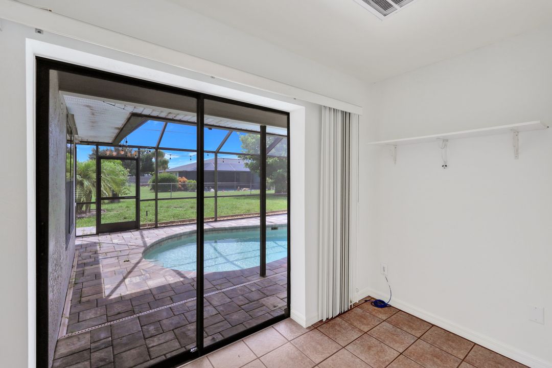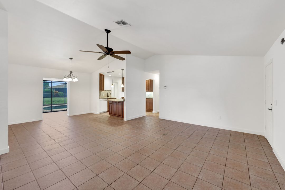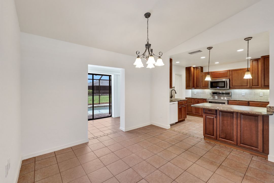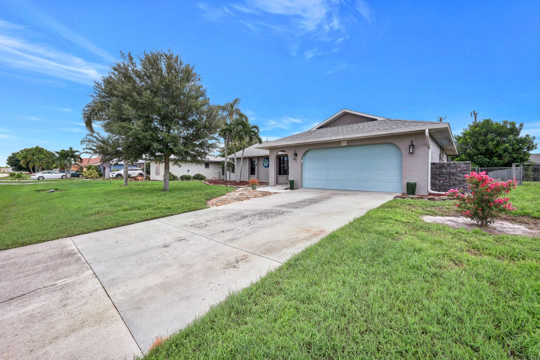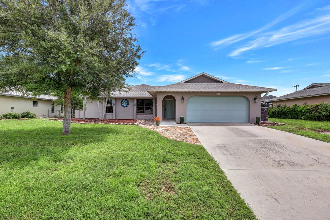 Price Reduction on this beautiful Pool Home w/Eastern Exposure! This upgraded beauty offers over 1800 sqft of living space including 3 bedrooms, 2 bathrooms, and an additional living area featuring a cozy fireplace and a stunning wood feature ceiling. The kitchen boasts granite countertops throughout, a large walk in pantry, tile backsplash and breakfast bar. The high vaulted ceilings and straight stacked tile in all main areas of the house adds a modern touch to the interior. Outdoor living checks all the boxes featuring sparkling blue chlorine pool, pavered patio PLUS incredible built in summer kitchen featuring stacked stone built-in, propane grill, storage and granite countertop which is perfect for the summer BBQ and entertaining family and guests! New shingled roof and A/C unit were installed in 2022; garage doors replaced in 2021 and plumbing repipe done in 2020. Front of home is protected with impact glass while the remaining openings have manual shutters. Flood zone X and assessments are in and PAID in full! Conveniently located near Cape Coral Hospital, schools, shopping centers, fitness clubs, and 10 just minutes to downtown Fort Myers! You can have it all! This home offers style and comfort for your family plus convenient location! Call and schedule your private viewing today! Bring all offers!!