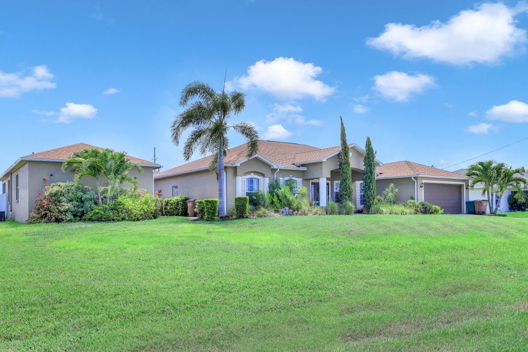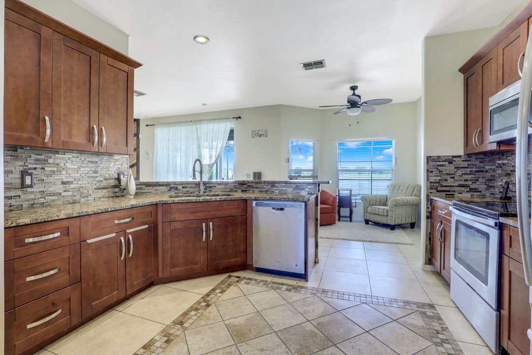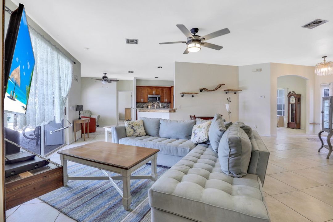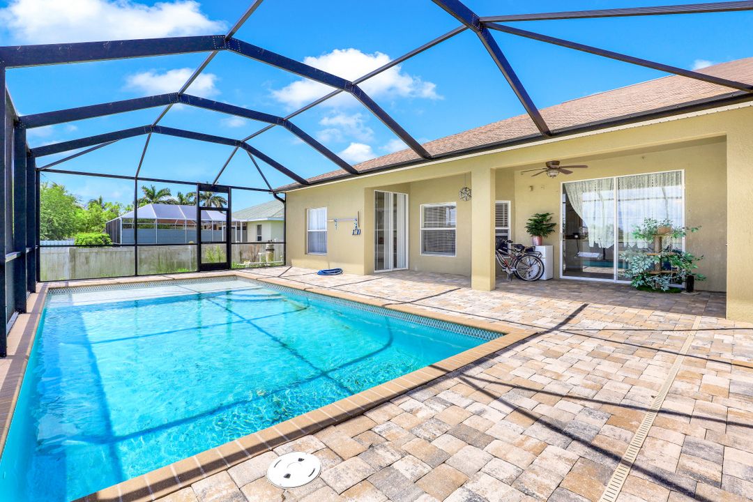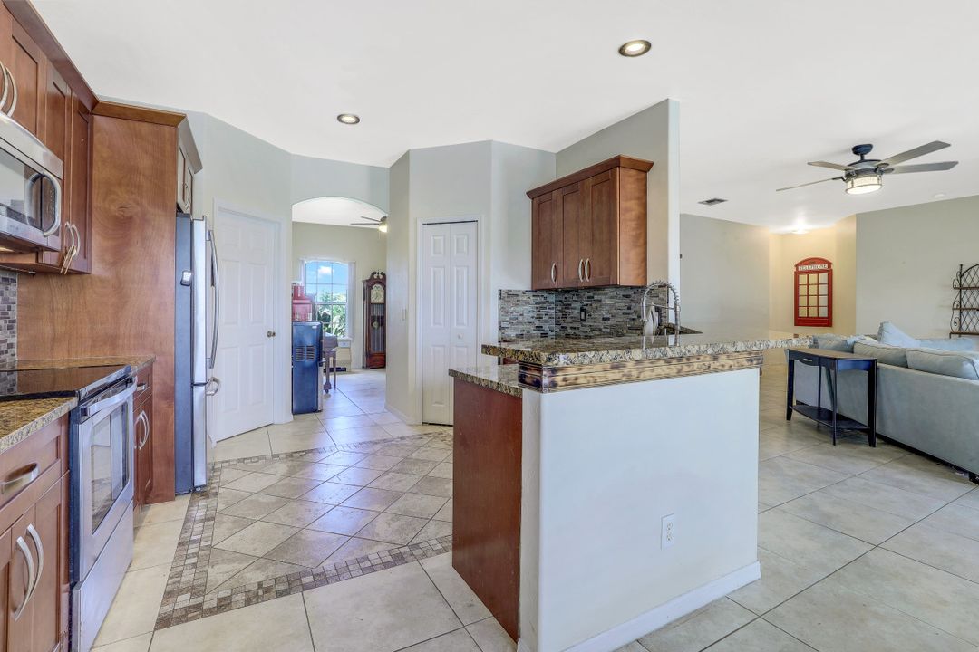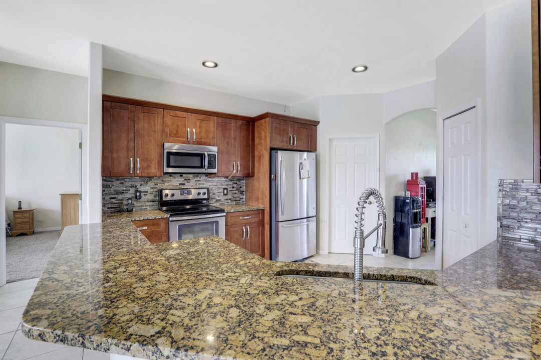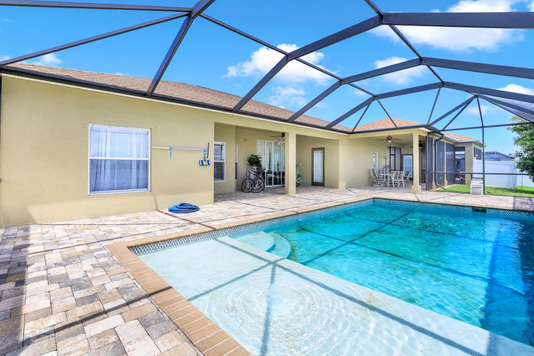 Exceptional find with this 3 Bed 3 Full Bath + Den + In-Law Suite Home!! The den can also be utilized as yet another bedroom giving this home 5 bedrooms and many options for your living and lifestyle needs. Walk into an open split bedroom floor plan with tile throughout the living area & plenty of natural light. Be greeted by the den/bedroom to the left; formal dining off to the right leading to a generous sized kitchen with granite counters, stainless appliances, tile backsplash & breakfast bar overlooking the great room and breakfast nook area. Large owners suite with private entry to the screened lanai, walk-in closet & private bath showcasing a large jetted tub. Two additional guest rooms + full bath which also acts as a pool bath are available for family & friends. In-law suite, student apartment or simply a private guest house for visitors showcases a full kitchen/living space, oversize private bedroom with walk-in closet, private bath PLUS private fenced area giving added flair to this exceptional find. Fenced backyard, screened pool with bathing deck and sizable paver deck makes this home great for all your get togethers!! Entertain, live, relax the SW Florida lifestyle!