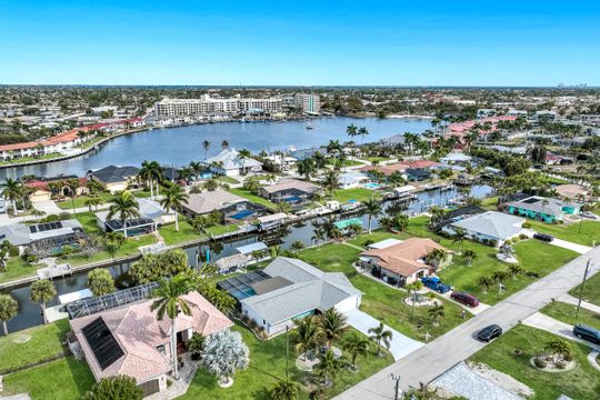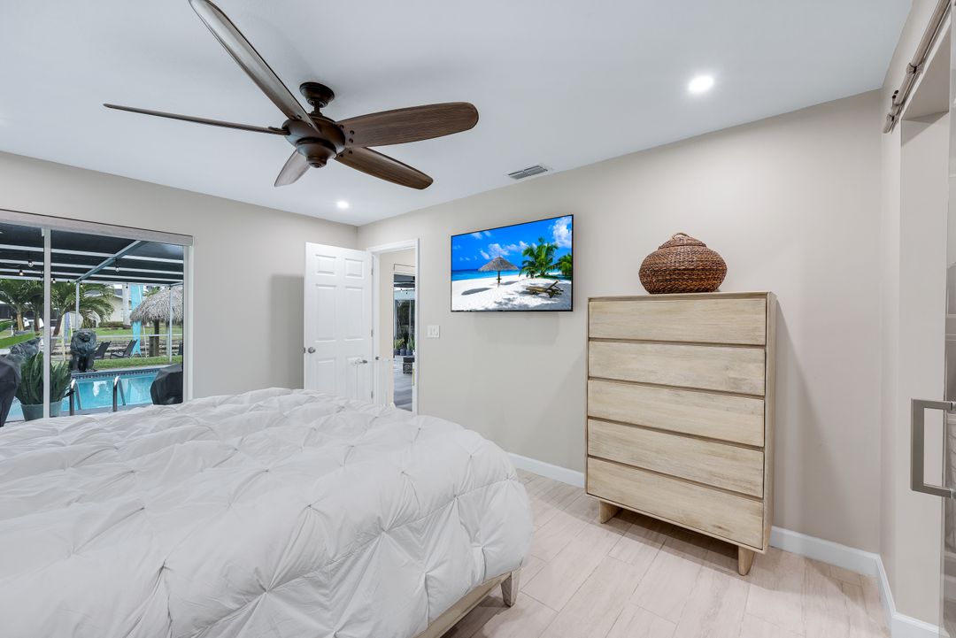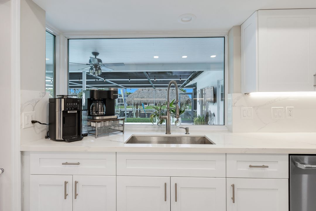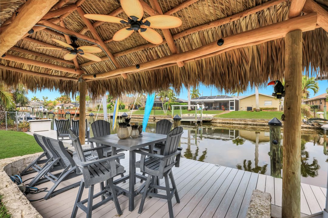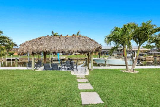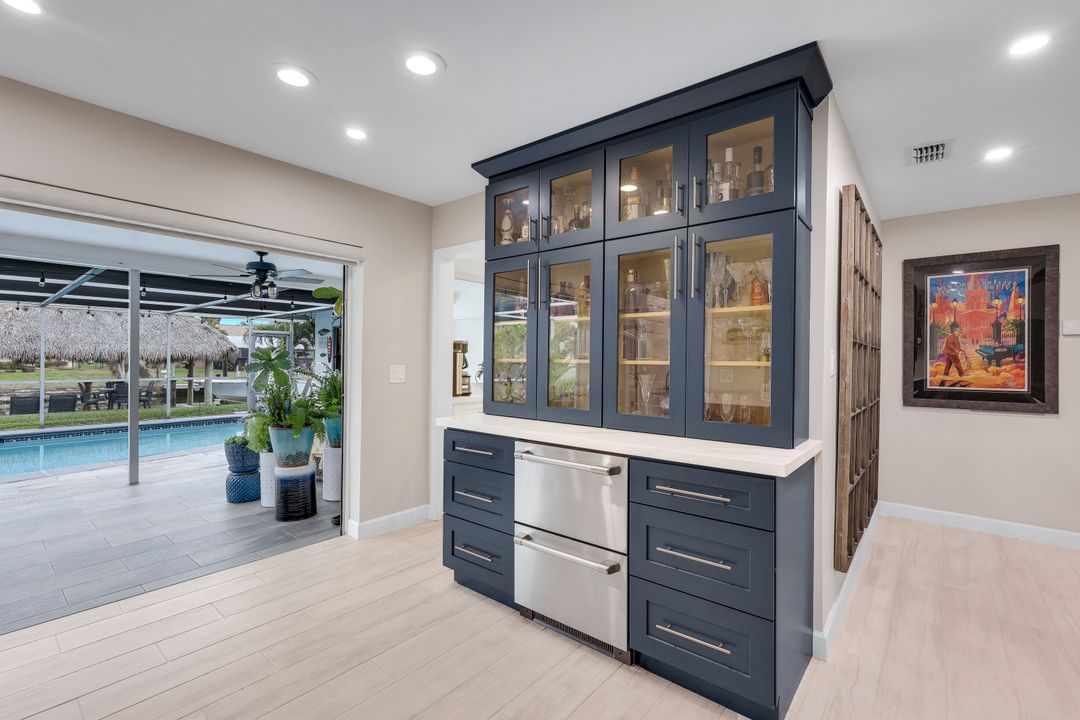Completely remodeled sailboat access pool home on a deep-water canal just minutes to open water! Ideally located one canal from the Bimini Basin with future boatable access to the highly anticipated Bimini Basin Project and within biking distance to the Cape Coral Yacht Club, this property is truly a boater’s paradise in the heart of Cape Coral! Offering just under 2,000 square feet of living space, this home features 4 bedrooms, 3 full bathrooms, and a two-car garage. Inside, a bright open split floor plan showcases tile flooring throughout. The updated kitchen is beautifully appointed with white shaker cabinetry, quartz countertops with a matching backsplash, under-cabinet lighting, soft-close drawers, stainless steel appliances, and a breakfast bar with a two-drawer mini refrigerator. Designed for entertaining, the custom bar area features quartz countertops, open wood shelving, a built-in beverage refrigerator, and seating overlooking the canal and pool, creating a seamless indoor-outdoor flow. The owner’s suite offers sliding glass doors to the outdoor living area, a walk-in closet with decorative glass doors, and a remodeled ensuite bath complete with heated mirrors, quartz countertops, rain shower head, and a walk-in tiled shower. The two additional bathrooms have also been beautifully updated with modern finishes and custom fixtures, each featuring rain shower heads. Major upgrades provide peace of mind, including a brand-new roof, hurricane impact windows, new plumbing throughout (all completed in 2024), along with a new electrical panel, updated recessed lighting and fixtures, an ADT security system, and split A/C units in both the garage and primary bedroom. Step outside to the expansive screened lanai, offering generous space for outdoor dining, a large heated pool, tiled deck, and a pool bathroom. Boaters will appreciate the brand-new composite dock with a 10,000-pound boat lift (2023) and newly installed tiki hut (2024) with full electrical service. With only a 10-minute ride to open water, this property delivers exceptional boating access. Surrounded by lush tropical landscaping, fruit trees, and a fenced-in backyard, the outdoor space offers both beauty and privacy. Centrally located near Downtown Cape Coral, Cape Harbour, and Tarpon Point, with convenient access to Sanibel, Captiva, Fort Myers Beach, shopping, dining, medical facilities, and top-rated schools, this home embodies the very best of Southwest Florida waterfront living. Schedule your private showing today!