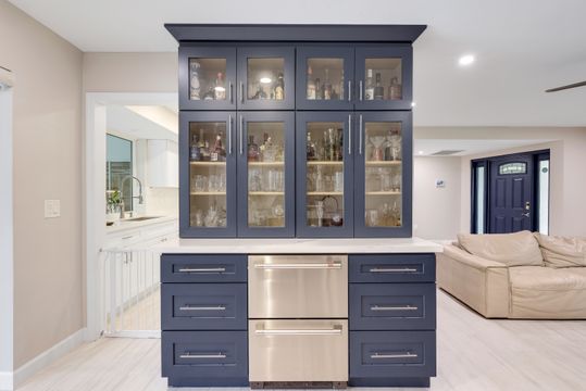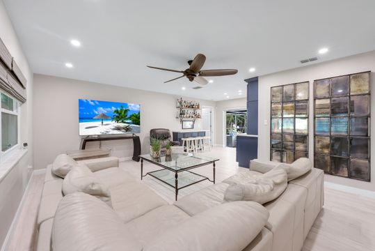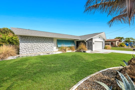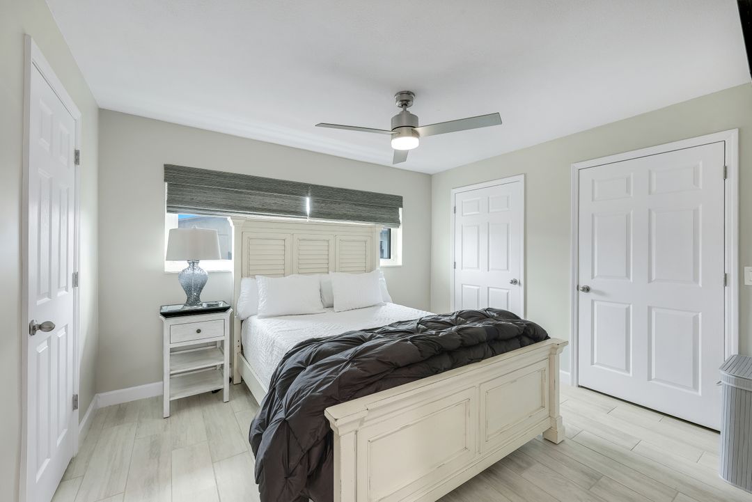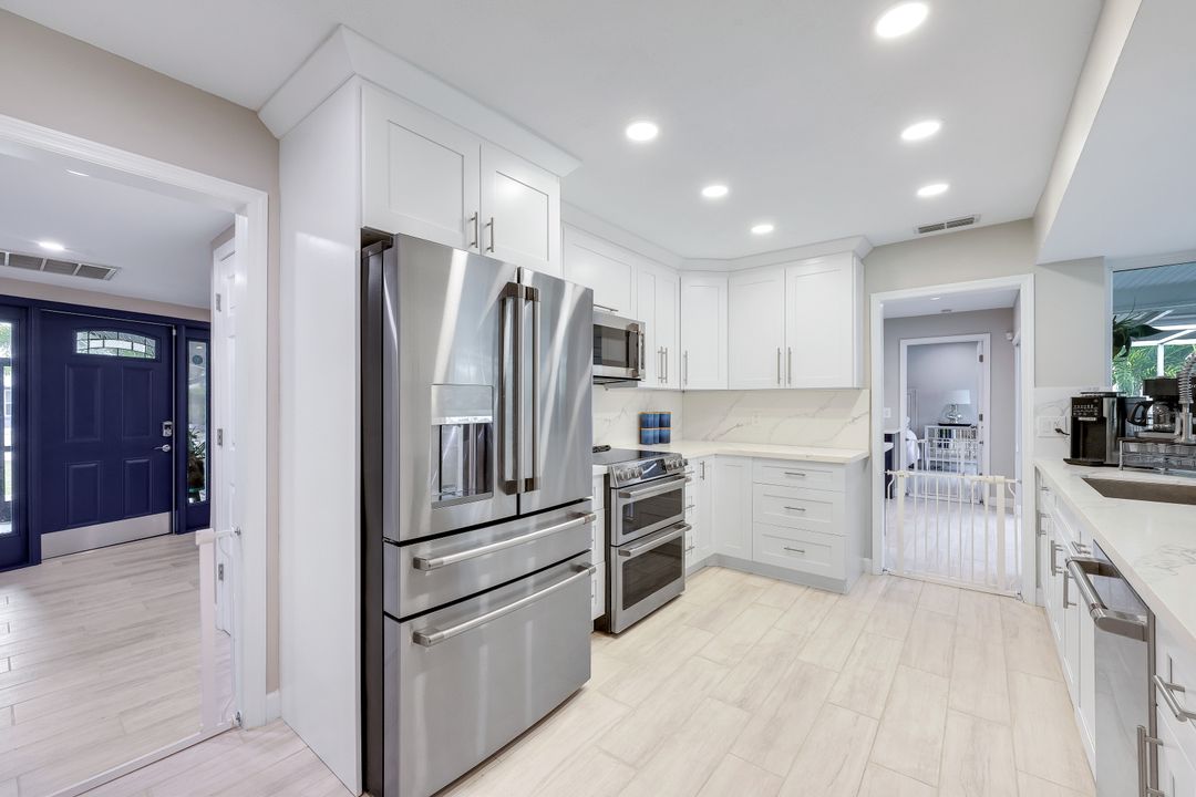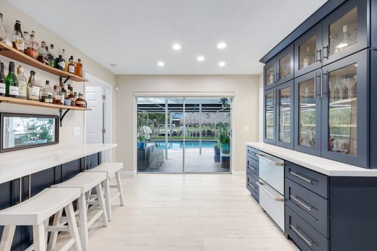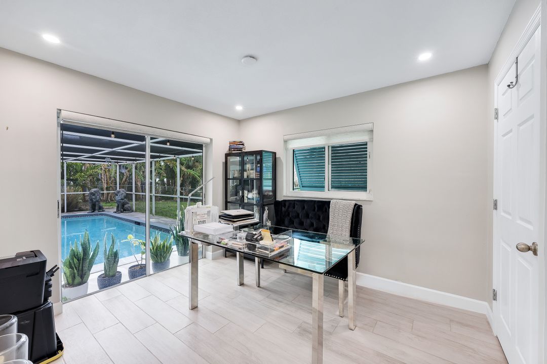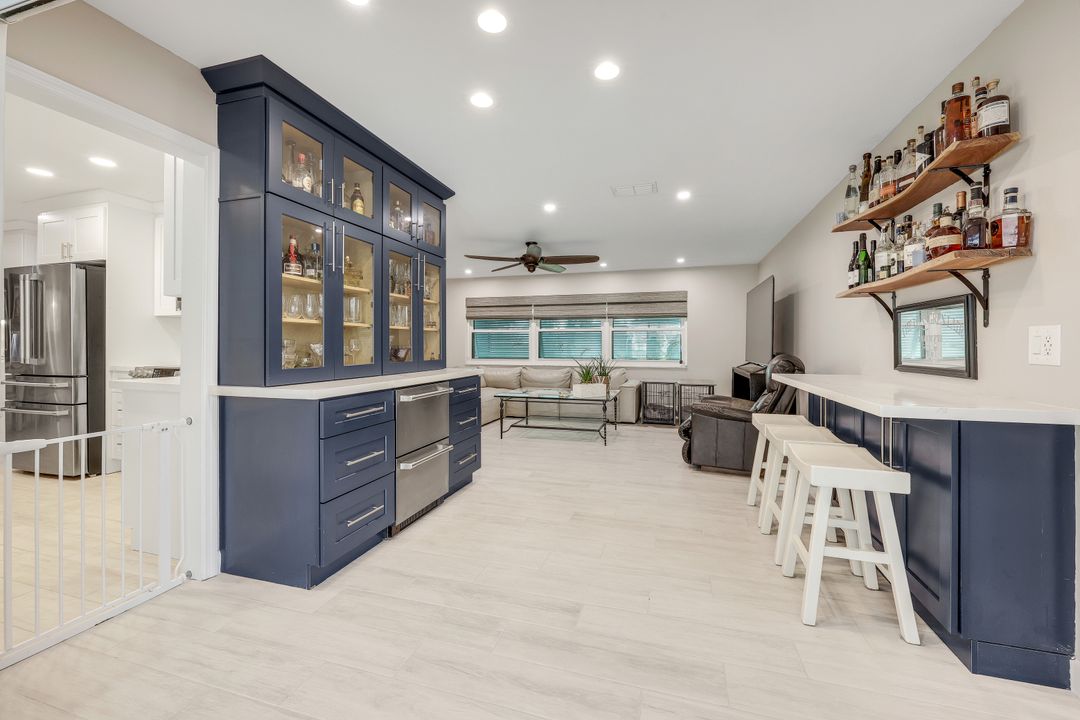 Completely remodeled sailboat access pool home on a deep-water canal just minutes to open water! Ideally located one canal from the Bimini Basin with future boatable access to the highly anticipated Bimini Basin Project and within biking distance to the Cape Coral Yacht Club, this property is truly a boater’s paradise in the heart of Cape Coral! Offering just under 2,000 square feet of living space, this home features 4 bedrooms, 3 full bathrooms, and a two-car garage. Inside, a bright open split floor plan showcases tile flooring throughout. The updated kitchen is beautifully appointed with white shaker cabinetry, quartz countertops with a matching backsplash, under-cabinet lighting, soft-close drawers, stainless steel appliances, and a breakfast bar with a two-drawer mini refrigerator. Designed for entertaining, the custom bar area features quartz countertops, open wood shelving, a built-in beverage refrigerator, and seating overlooking the canal and pool, creating a seamless indoor-outdoor flow. The owner’s suite offers sliding glass doors to the outdoor living area, a walk-in closet with decorative glass doors, and a remodeled ensuite bath complete with heated mirrors, quartz countertops, rain shower head, and a walk-in tiled shower. The two additional bathrooms have also been beautifully updated with modern finishes and custom fixtures, each featuring rain shower heads. Major upgrades provide peace of mind, including a brand-new roof, hurricane impact windows, new plumbing throughout (all completed in 2024), along with a new electrical panel, updated recessed lighting and fixtures, an ADT security system, and split A/C units in both the garage and primary bedroom. Step outside to the expansive screened lanai, offering generous space for outdoor dining, a large heated pool, tiled deck, and a pool bathroom. Boaters will appreciate the brand-new composite dock with a 10,000-pound boat lift (2023) and newly installed tiki hut (2024) with full electrical service. With only a 10-minute ride to open water, this property delivers exceptional boating access. Surrounded by lush tropical landscaping, fruit trees, and a fenced-in backyard, the outdoor space offers both beauty and privacy. Centrally located near Downtown Cape Coral, Cape Harbour, and Tarpon Point, with convenient access to Sanibel, Captiva, Fort Myers Beach, shopping, dining, medical facilities, and top-rated schools, this home embodies the very best of Southwest Florida waterfront living. Schedule your private showing today!