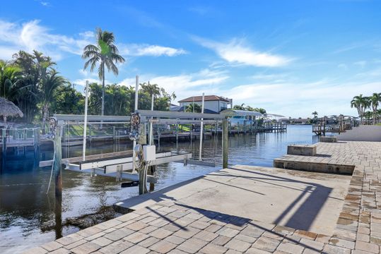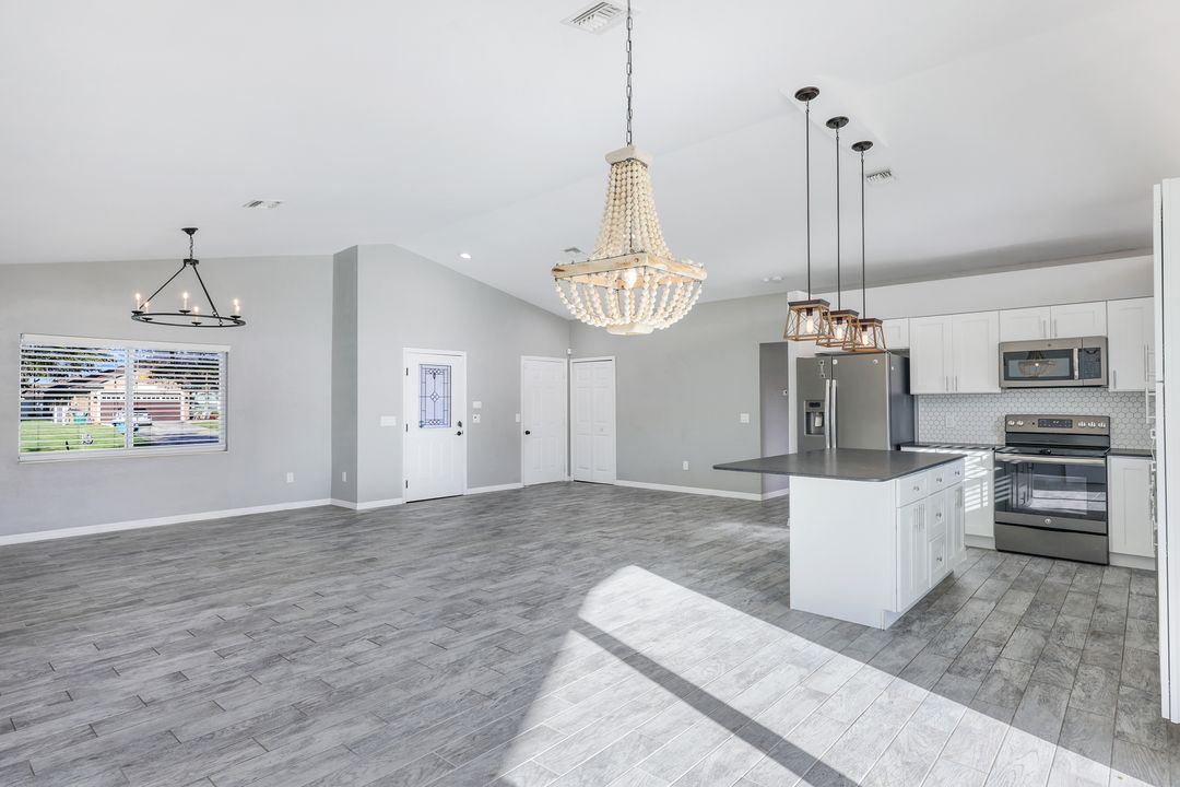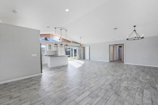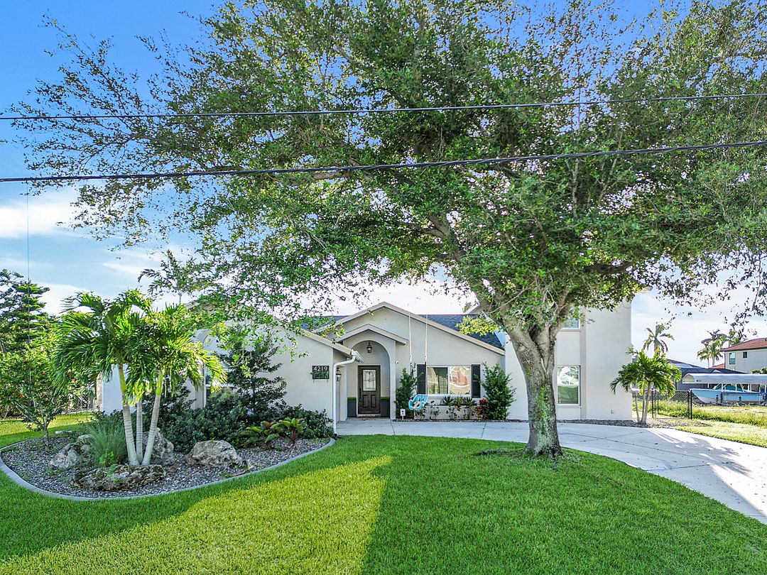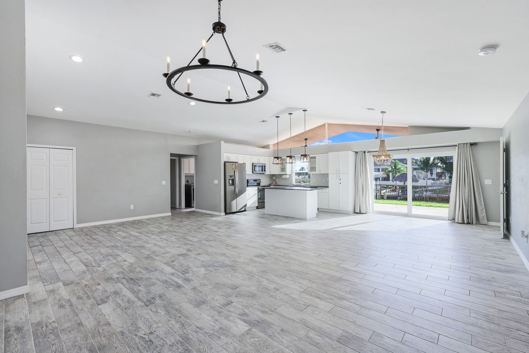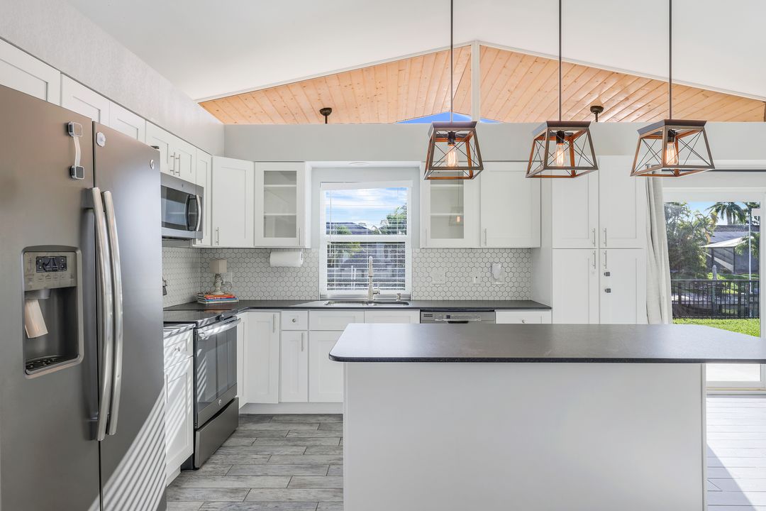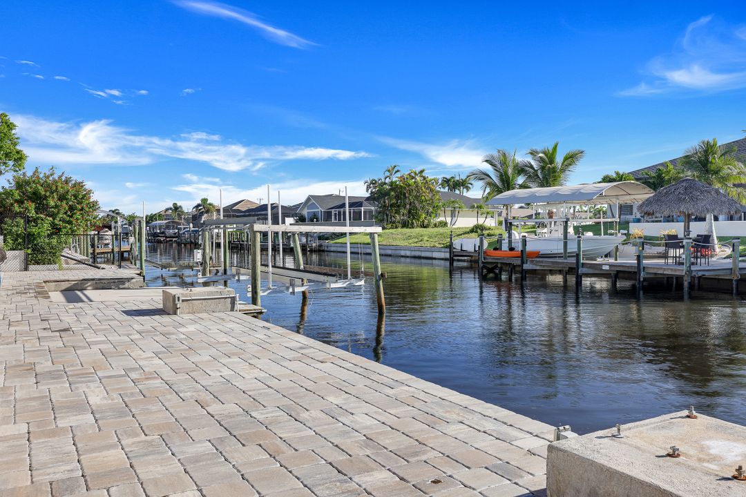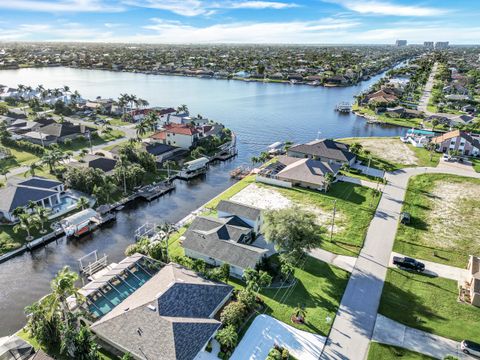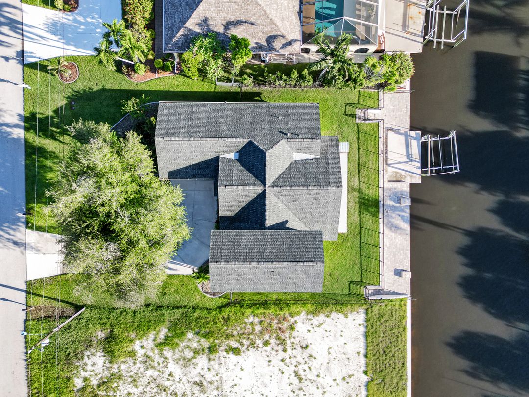 Bring your family AND your Boat! This waterfront oasis is nestled in the heart of a thriving boating/family community in SW Cape Coral. This gem was completely remodeled from top to bottom in 2018 & includes 4BR, 3.5BA, PLUS bonus room. As you step inside, you'll immediately notice the spaciousness of the open concept while numerous windows, vaulted ceilings & recessed lighting, creating a bright & inviting atmosphere. Kitchen has been tastefully updated w/modern fixtures & lighting, shaker style cabinets, slate appliances, leather textured granite & tile backsplash. Downstairs owners suite enjoys water views & private bathroom featuring floor-to-ceiling elegant black shower tile, double vanities & contemporary fixtures. Upstairs area features BR plus full BA along w/bonus room offering unlimited potential uses-home office, in-law/guest suite, kids area just to name a few. Whether you're an avid boater or simply appreciate the serenity of waterfront living, this property offers the best of both worlds. Don't miss your chance to make this beautiful home your own & experience the joys of a welcoming family & boating community. IMPORTANT-New Roof 2022, IMPACT WINDOWS, Flood Zone X!