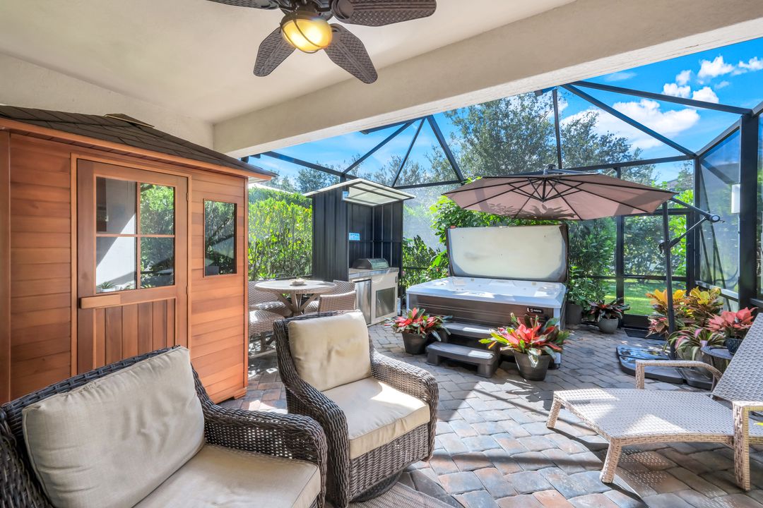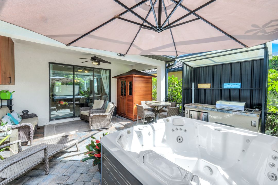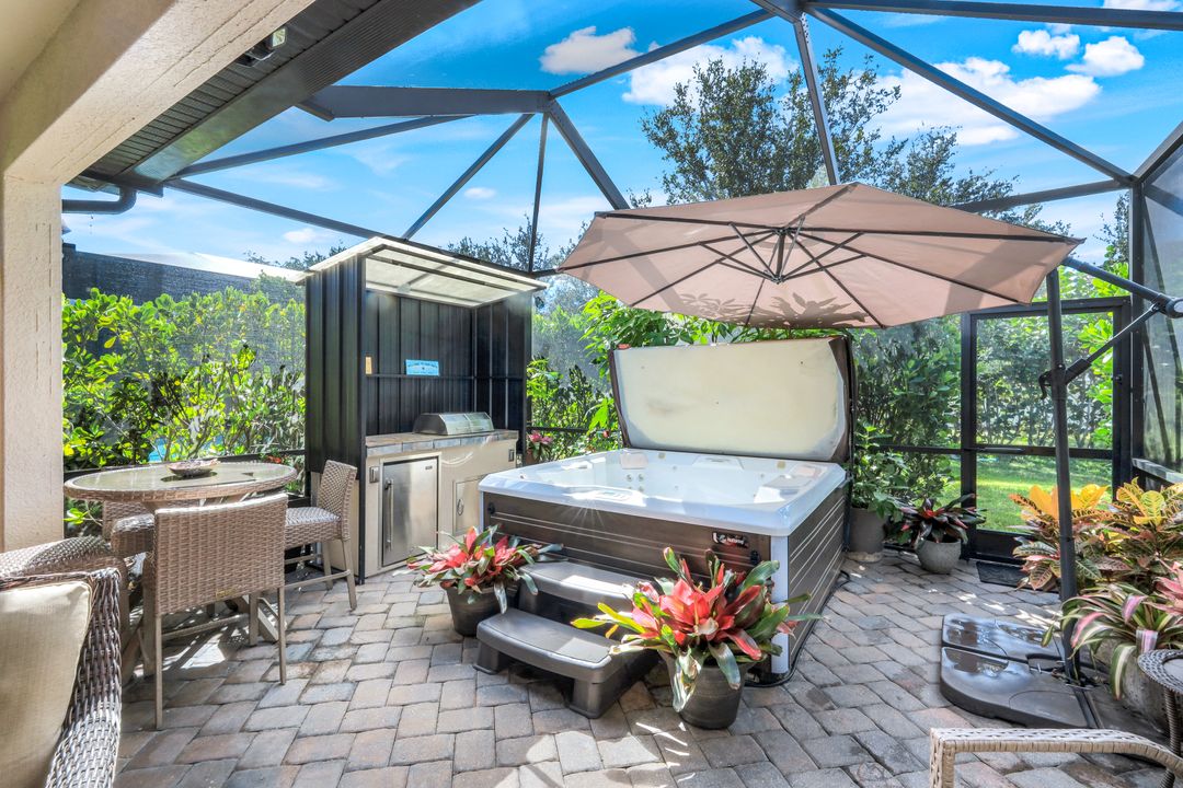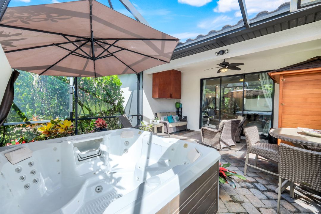 LUXURY LIVING MEETS EVERYDAY COMFORT in this stunning 3-bedroom, 3-bath home with over 1,800 sq. ft. of open-concept living in one of the area’s most sought-after school districts. The spacious great room flows seamlessly into a chef-inspired kitchen featuring new KitchenAid appliances and designer details throughout, including custom moulding, wainscoting, shiplap, and mirrors. The primary suite boasts custom closets, while the laundry room has been upgraded with added cabinetry and a console sink. Step outside and enjoy your private outdoor sanctuary with an extended lanai, Hot Springs saltwater hot tub, outdoor sauna, outdoor kitchen with custom awning, and outdoor TV with custom cabinet—all surrounded by lush landscaping and accent lighting. Practical upgrades include a new hot water heater, epoxy-coated garage floor, freshly painted garage interior, custom garage cabinets, bike racks, slat wall, and pull-down attic stairs with floored storage. Located minutes from renowned beaches, fine dining, shopping, and recreation, this home combines everyday comfort with the feel of a luxury retreat.