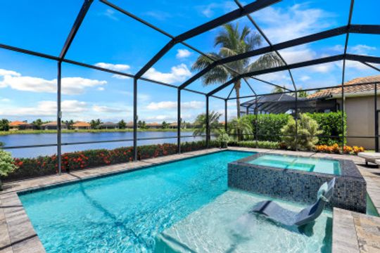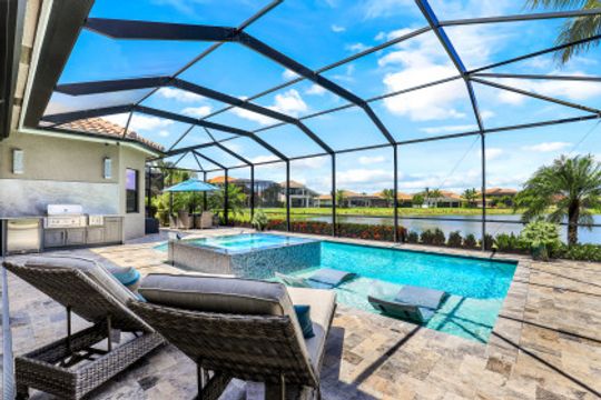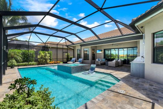 Who says you can't have it all? This impressive model quality "Carlyle" (furniture/decor package available) features over $500k in upgrades: hurricane impact glass windows/doors; electric roll down shutter on the lanai; whole house generator; expanded lanai with travertine marble deck, GAS heated salt water pool with raised infinity edge spa and two sunshelfs with bubblers; $50k custom outdoor kitchen, fireplace, and entertainment wall; wood floors throughout and upgraded tile in the baths; $6k security system including cameras; two climate controlled garages with custom cabinets & epoxy floor; GAS range; tankless GAS hot water heater; HVAC filtration system; special order/designer lighting; $30k in additional landscaping with landscape lighting; $15k in-ceiling audio system; custom impact glass front door with matching transom window; upgraded cabinetry (with soft close) & quartz countertops throughout; bath mirrors and shower tile to the ceiling; master suite closet built-ins; and more! StoneCreek offers a 6.25 acre recreation site featuring a resort-style pool, lap pool, whirlpool spa, firepit, 5 clay tennis courts, 4 pickleball courts, full size basketball court, and more!