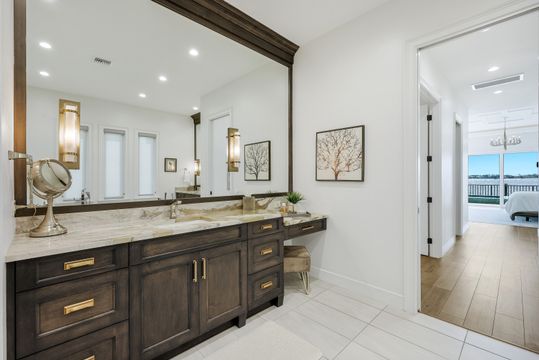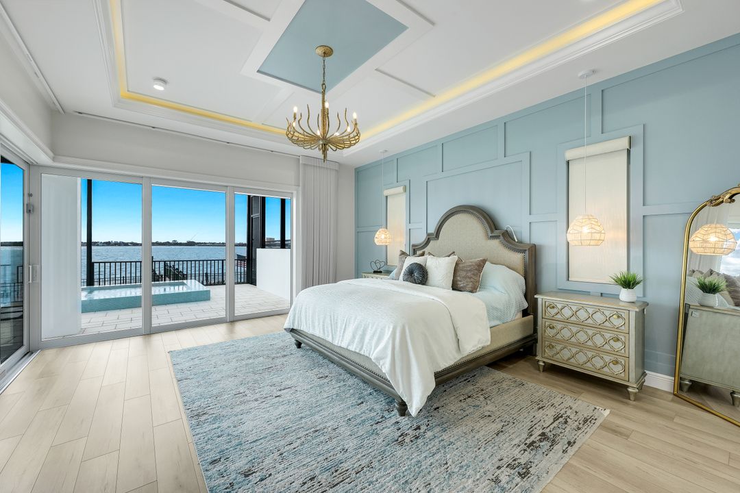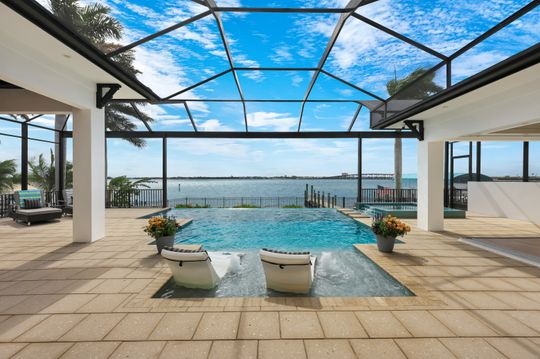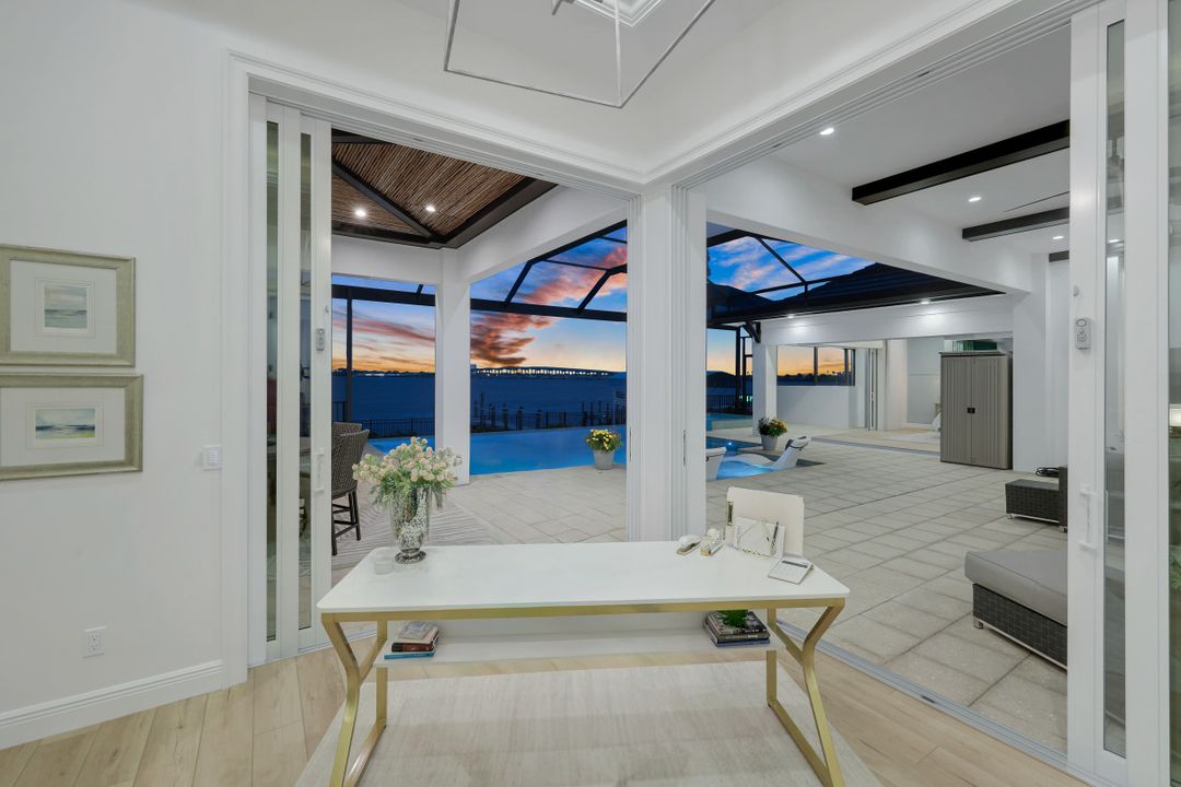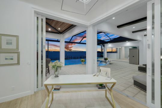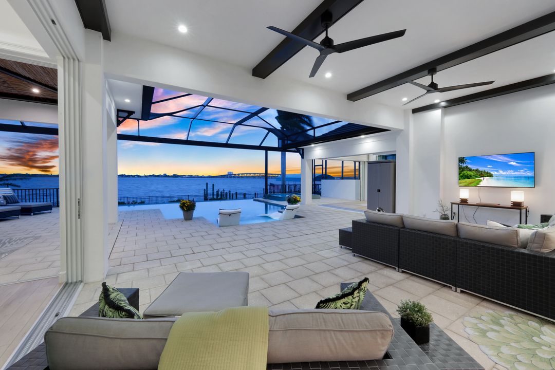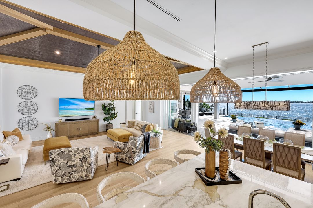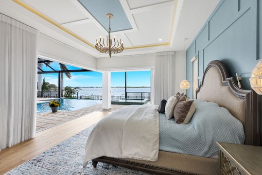 Living room opens fully to the outdoors, effortlessly blurring the line between inside & out. Designer lighting, refined materials, and a warm, welcoming atmosphere make this home livable & stunning. The Owner's Suite overlooks uninterrupted water views for miles. The spa-inspired primary bath features a Marvel Slate Listello herringbone accent wall paired with a tumbled Carrara white herringbone mosaic floor. Guest bedrooms are positioned in a private wing, ideal for extended stays. Outside, your private waterfront oasis is resort-grade in every respect.