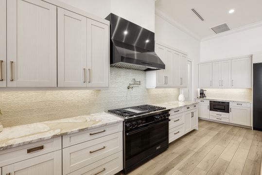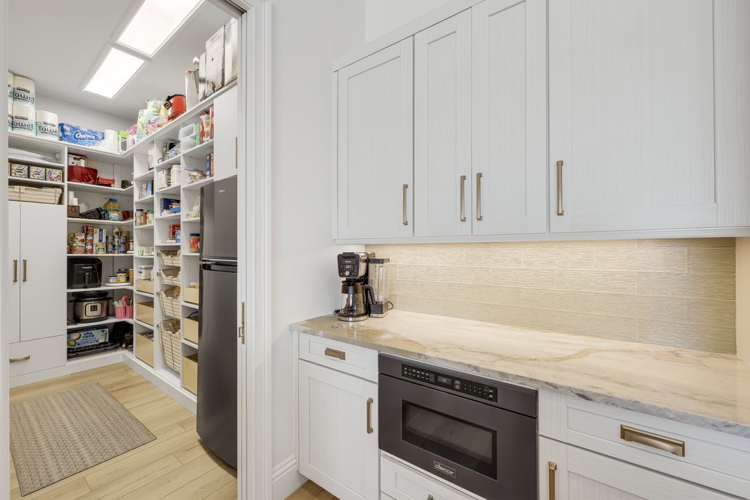 With 3 beds, a private office, 3.5 baths, and a 3-car garage with a mini-split, every inch of this home was intentional. Step through the 12-foot Acadian iron-front door and into a dramatic, light-filled interior defined by soaring vaulted & coffered ceilings and a wall of glass that frames the river like a living painting. The designer kitchen is the heart of the home, anchored by a seamless 118x66" island and wrapped in Montoro Premium Dolomite, one of the most sought-after natural stones in luxury design. The Dolomite carries throughout, bookmatched and perfectly mirrored across the back countertop surfaces, creating a dramatic, gallery-quality effect where the natural veining flows as one continuous, uninterrupted statement. Dacor Modernist appliances include a paired 30" fridge & 30" freezer, beverage and wine refrigeration, and a walk-in pantry outfitted by California Closets. Every detail is bespoke.