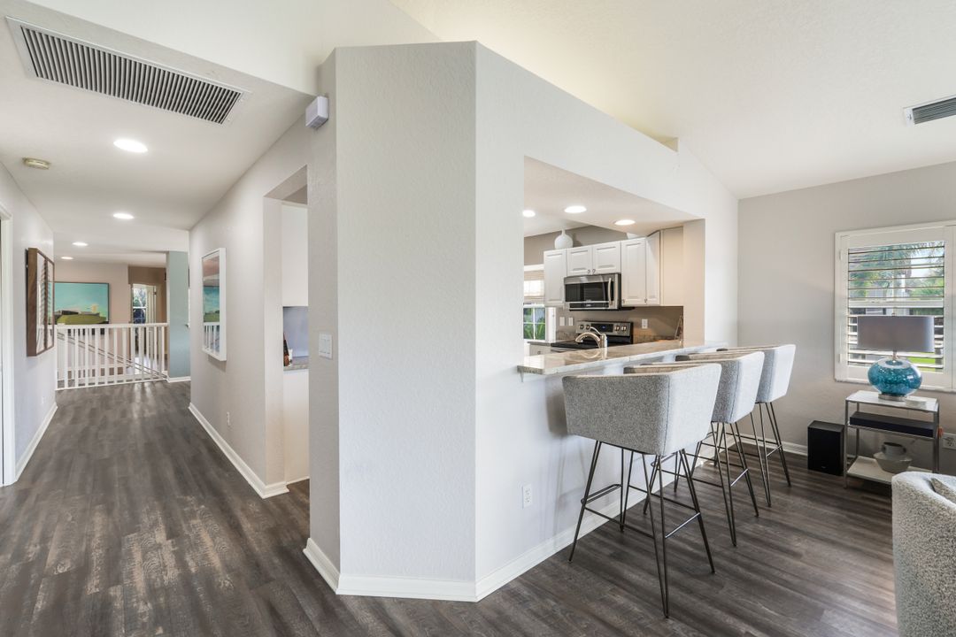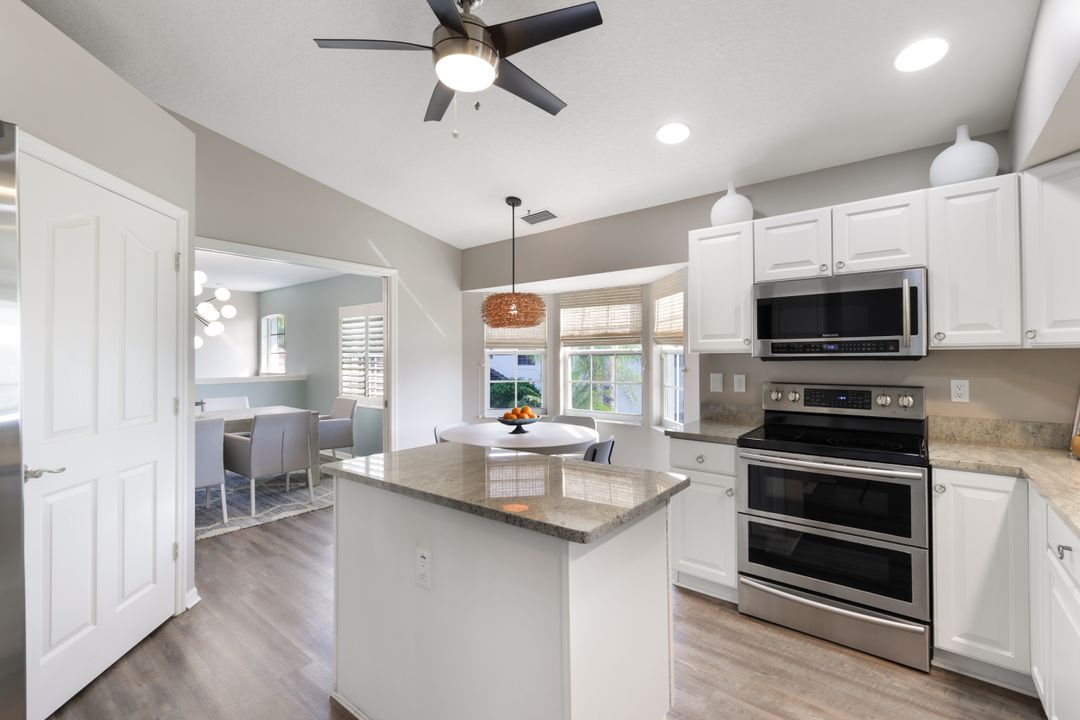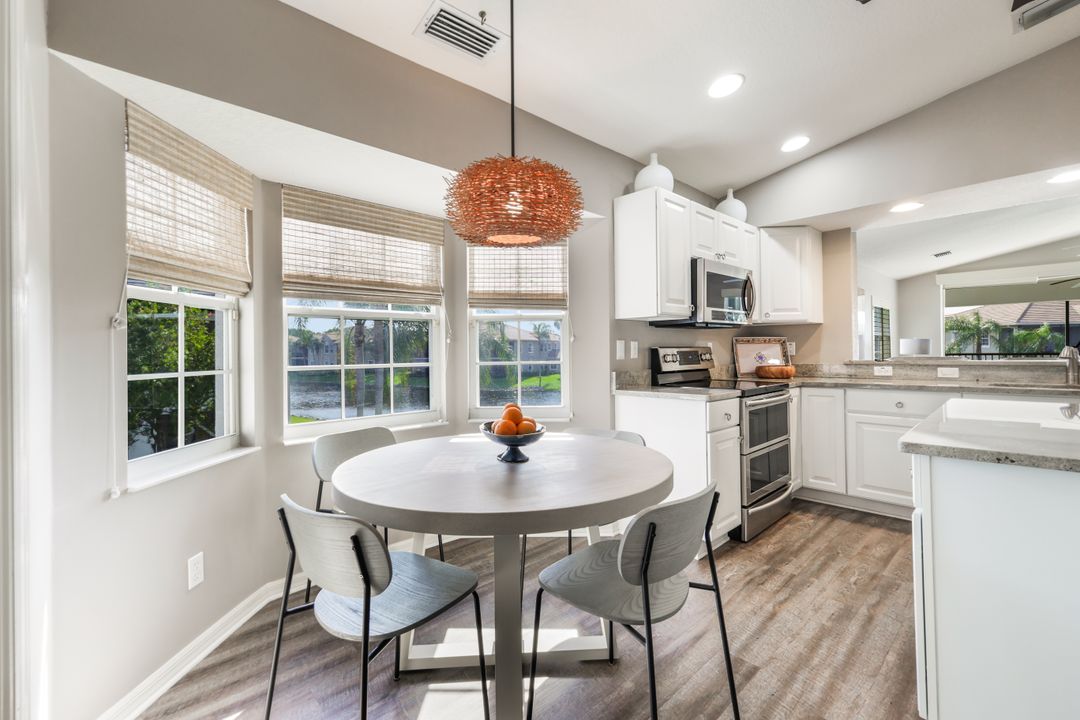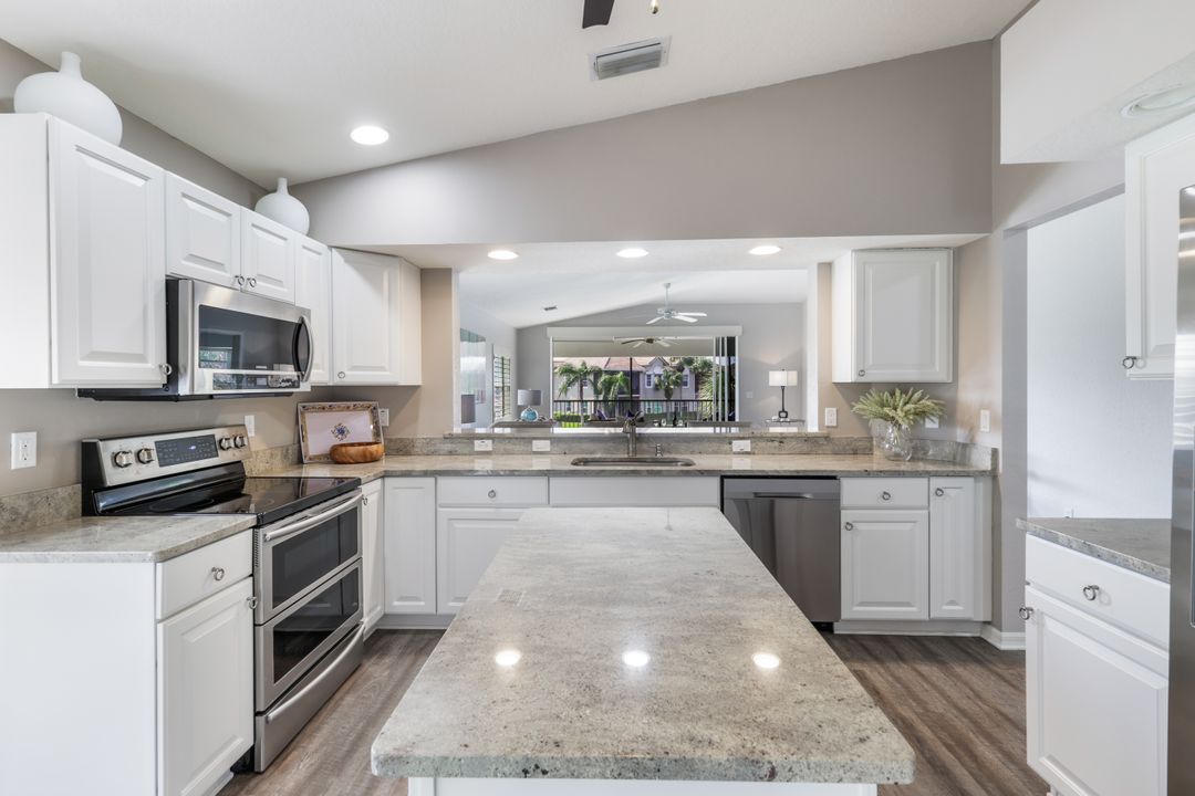 Recently updated and immaculately maintained, this stunning second-floor coach home with a two-car garage and private elevator feels like a model home. Spanning nearly 2,700 square feet, it offers the space and comfort of a single-family residence. With a split floor plan, it includes a spacious master suite and three generously sized guest suites, providing the perfect balance of privacy for family and visitors. As you head upstairs, the bright and airy dining room welcomes you, flowing seamlessly into the stylish kitchen. Here, you’ll find an inviting island, sleek white cabinets, granite countertops, a prep island, and stainless steel appliances. The fabulous eat-in kitchen also features a breakfast bar and a walk-in pantry, making it ideal for both everyday meals and entertaining. Moving through the kitchen, you enter the expansive family room, which opens onto a screened lanai with peaceful lake and partial golf course views. The western exposure of this home allows for plenty of natural light, making it the perfect spot to enjoy breathtaking sunsets. The master suite is a serene retreat, boasting dual vanities, a walk-in shower, two closets, and a bay window overlooking the lake. The recently renovated master bath is designed for relaxation, featuring an elegant shower with white tile and a soaking tub. Continuing down the hallway, you’ll find the laundry room, along with the first guest bedroom and a conveniently located guest bathroom. Toward the back of the home, two additional private bedrooms and a third full bathroom provide ample space for guests. This home’s layout is perfect for both relaxation and entertainment, with spacious common areas and private retreats. The new roof installed in 2019 adds to the home's peace of mind. Situated in central Naples, Kensington offers an amenity-rich lifestyle, including golf, tennis, pickleball, bocce, fitness facilities, pools, a clubhouse, and a restaurant. With several optional membership levels, there is truly something for everyone. Plus, it’s conveniently located near world-famous beaches, dining, shopping, and excellent schools. This property combines elegance and functionality in a stunning setting, offering the perfect Florida lifestyle.