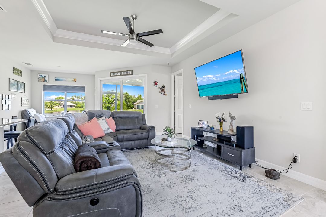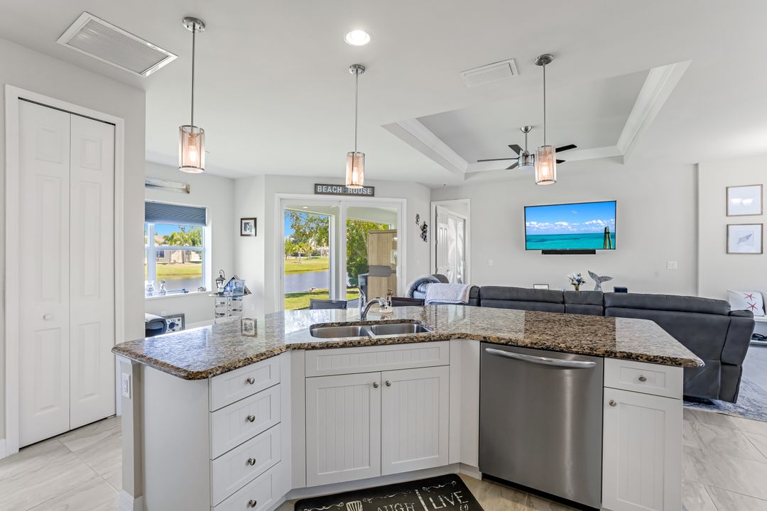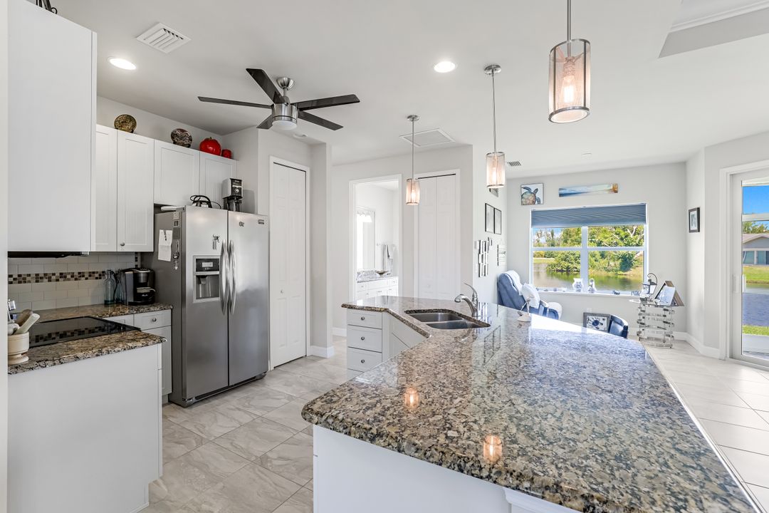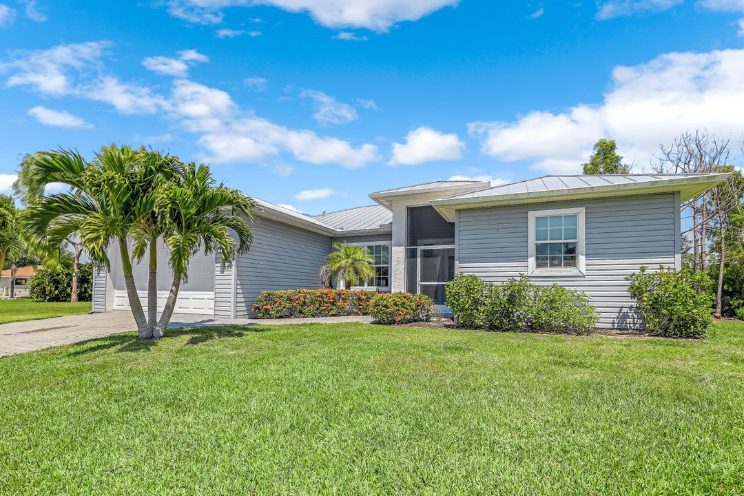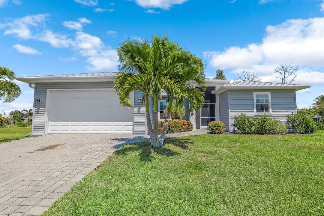 Newer Construction with Serene Long Lake Views! Positioned on one of the highest elevations on the island, this home sustained no damage from recent storms and is located in Flood Zone X, which means more savings for you! Welcome to your own slice of island paradise in the peaceful Pine Island Village community of Saint James City, FL. Built in 2017, this beautiful home blends coastal charm with modern durability, featuring a metal roof and impact-rated windows and doors for peace of mind during any season. Step inside and be instantly drawn to the wide lake views that create a calming, nature-filled backdrop to everyday living. The open-concept great room layout showcases tile flooring throughout, tray ceilings, and nautical-inspired fixtures, all enhancing the relaxed, coastal feel. Offering 3 spacious bedrooms and 2 bathrooms, including a private primary suite, this home is perfect for both unwinding and hosting. The kitchen is a chef’s delight, featuring granite countertops, stainless steel appliances, and generous cabinet space. Enjoy the outdoors year-round on the pavered lanai or sip your morning coffee on the pavered driveway as the sun rises over the water. Pine Island Village is a quiet, friendly community offering a low HOA fee of just $350/year, a community pool, and tranquil walking paths where you're likely to spot island wildlife. Come experience world-class fishing, boating, and the laid-back island lifestyle that makes Pine Island so special.