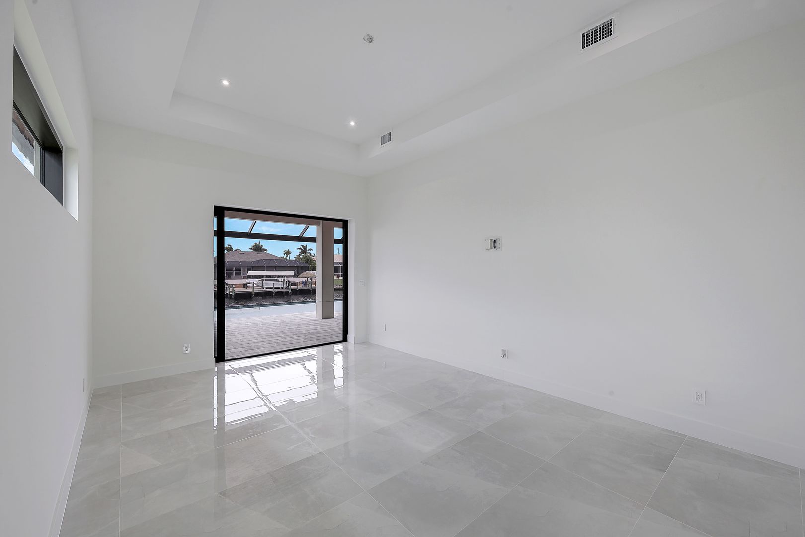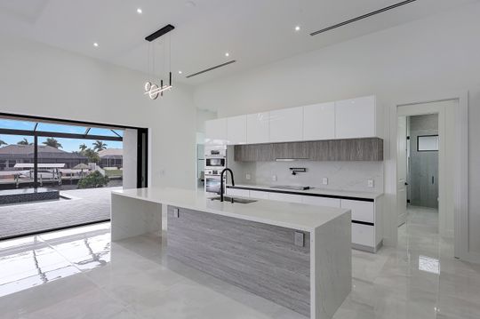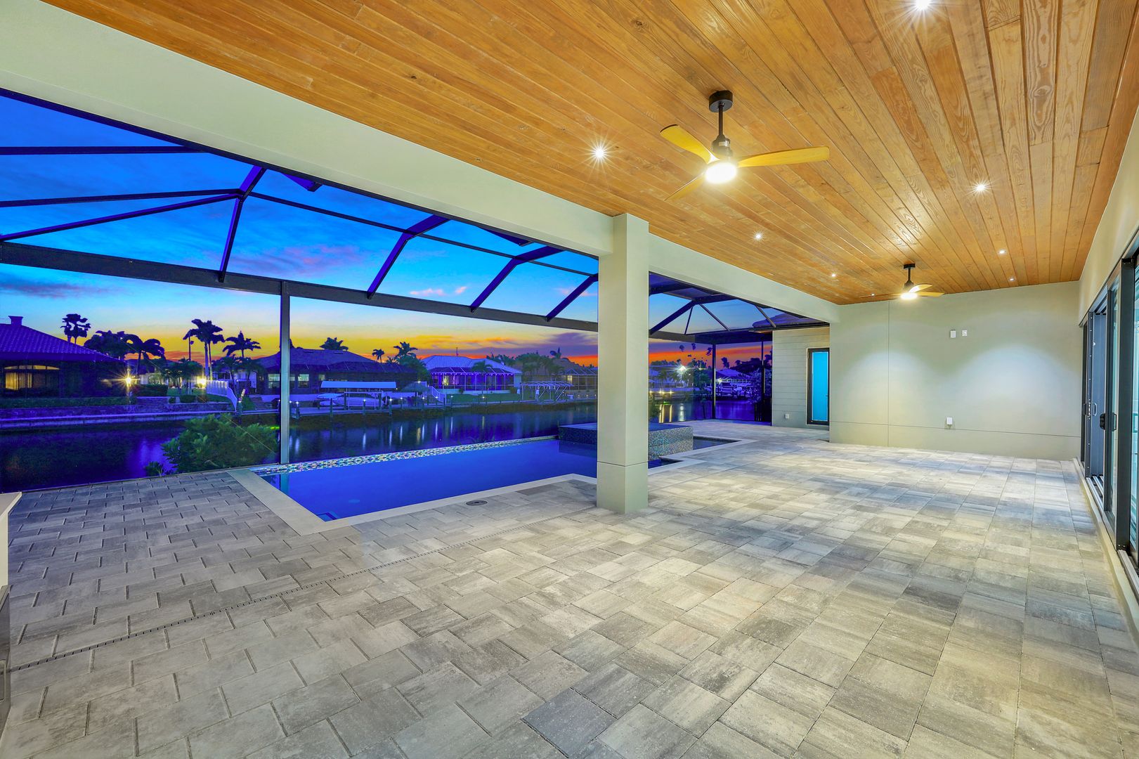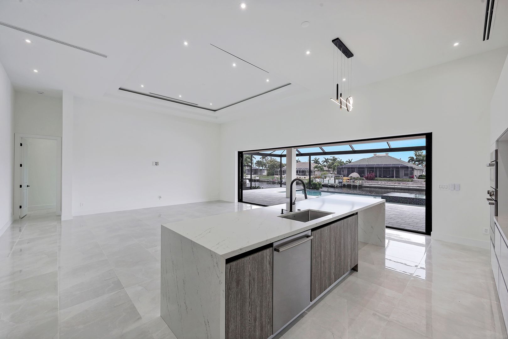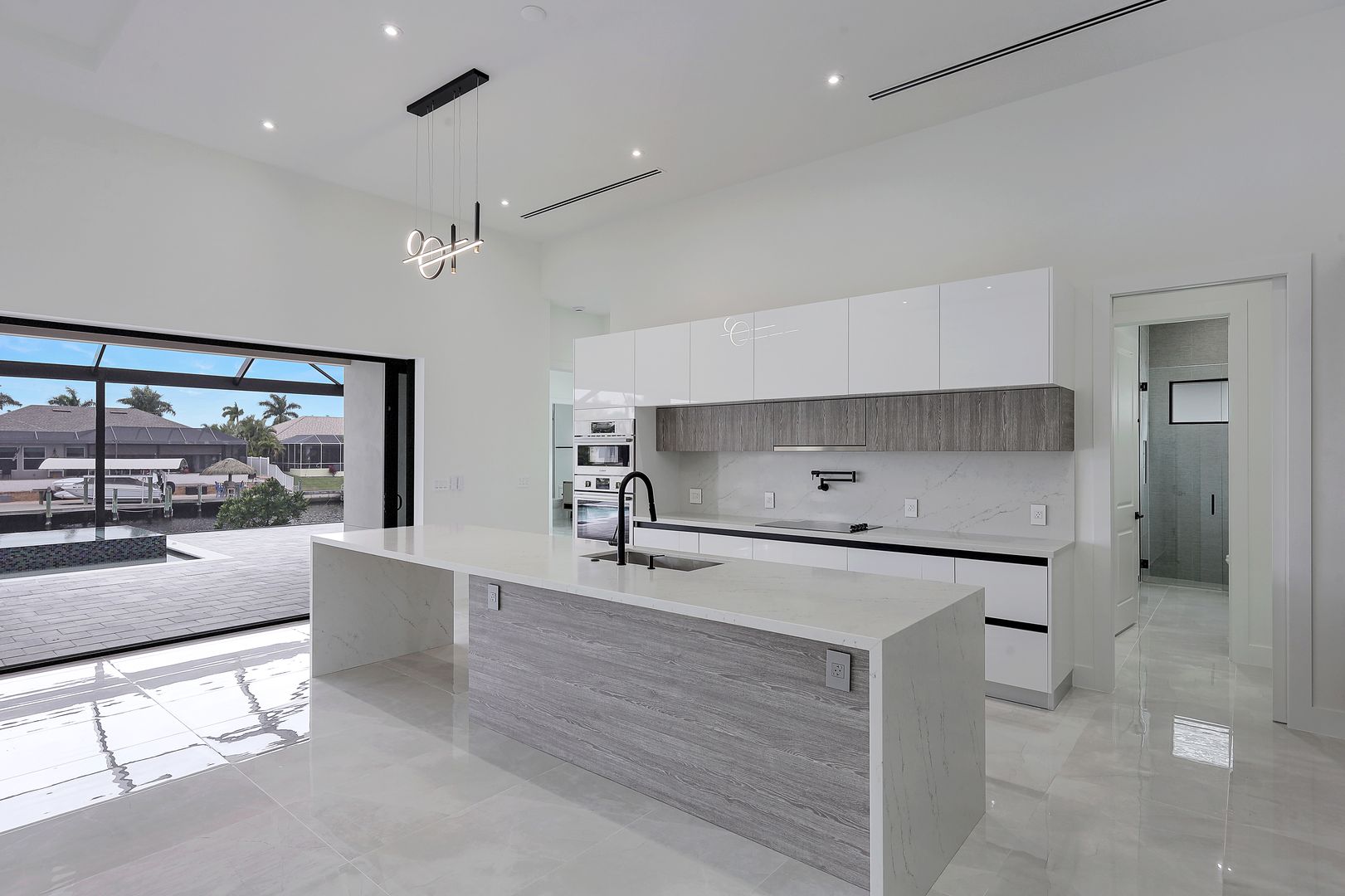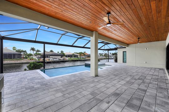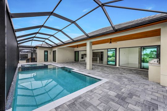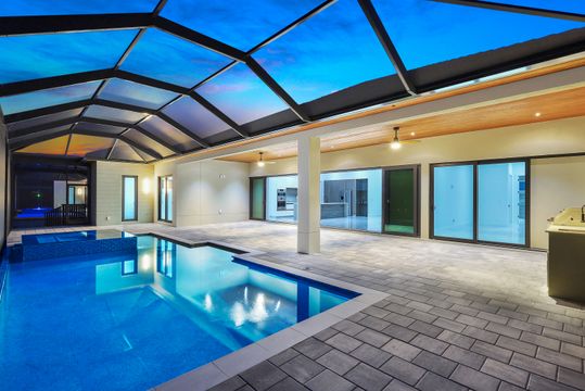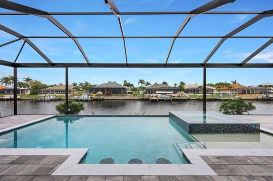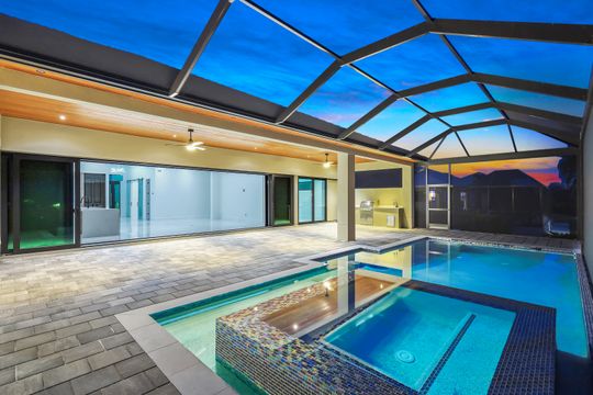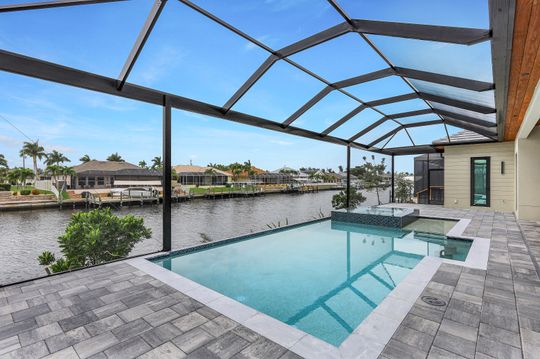 Modern New Construction Gulf Access Home in SW Cape Coral. Straight out of the pages of a magazine! Clean contemporary design overlooking a 150+ foot wide canal near Cape Harbour! Featuring 2,844 SF with 4 Beds, Office, 4 Bath, and a 3 Car Garage. Open family room with high volume ceilings and 23' pocketing sliding glass doors leading out to pool & spa. Entertainer's Kitchen has European style cabinetry, double waterfall Quartz island, high-end Bosch appliances, hidden walk-in pantry, and wine wall. Master suite overlooks the water. Stunning master bath w/ dual vanities and large walk-in shower w/ designer tub. Junior master suite and 2 spare bedrooms ideal for family & guests. Entertain or Relax on the spacious lanai w/ outdoor kitchen & false-negative edge Heated Pool on the water! Integrated 360 degree spillover spa and sun shelf complete this amazing pool! LOADED WITH FEATURES! Panoramic Screen Enclosure w/ picture window screens, Impact Windows & Doors, Wood ceilings on the lanai & foyer, liner AC vents, designer lighting, and large format tile flooring throughout. Boating & Fishing right from your back yard! Cape Harbour waterfront dining, shopping, and events very close by!