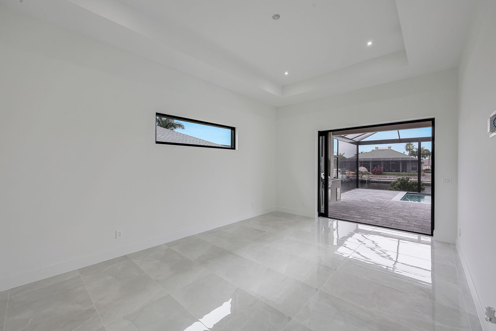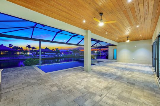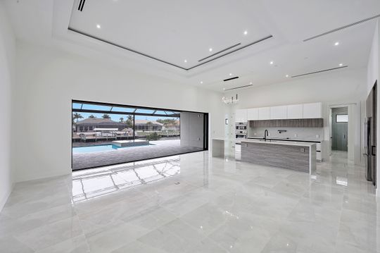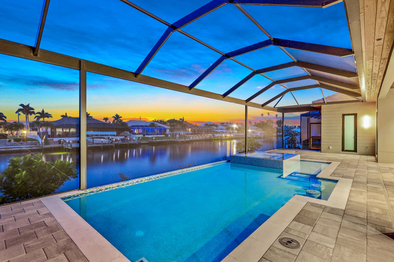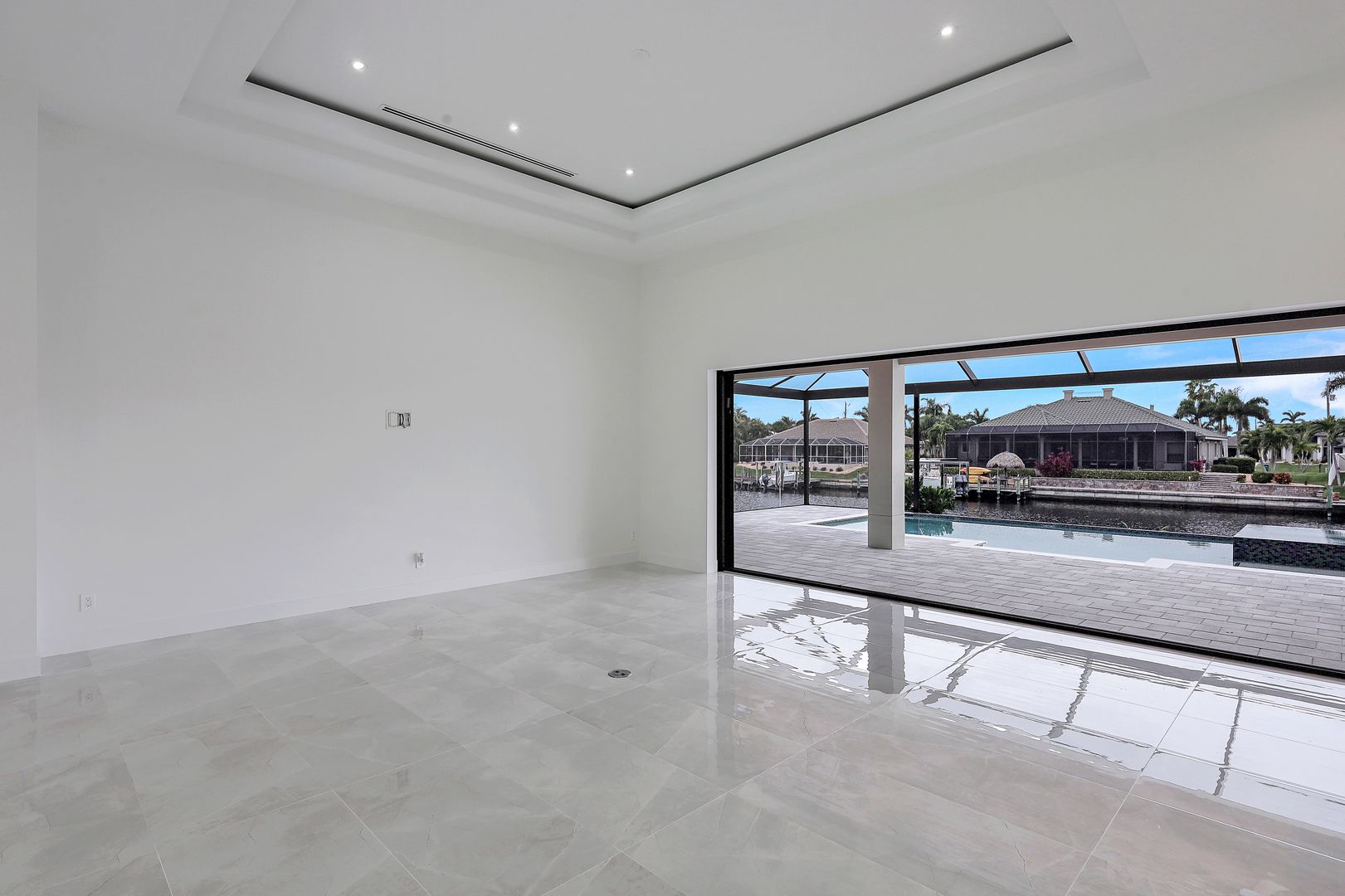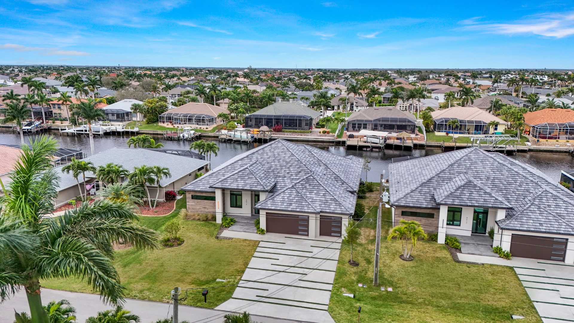 Modern New Construction Gulf Access Home in SW Cape Coral. Straight out of the pages of a magazine! Clean contemporary design overlooking a 150+ foot wide canal near Cape Harbour! Featuring 2,844 SF with 4 Beds, Office, 4 Bath, and a 3 Car Garage. Open family room with high volume ceilings and 23' pocketing sliding glass doors leading out to pool & spa. Entertainer's Kitchen has European style cabinetry, double waterfall Quartz island, high-end Bosch appliances, hidden walk-in pantry, and wine wall. Master suite overlooks the water. Stunning master bath w/ dual vanities and large walk-in shower w/ designer tub. Junior master suite and 2 spare bedrooms ideal for family & guests. Entertain or Relax on the spacious lanai w/ outdoor kitchen & false-negative edge Heated Pool on the water! Integrated 360 degree spillover spa and sun shelf complete this amazing pool! LOADED WITH FEATURES! Panoramic Screen Enclosure w/ picture window screens, Impact Windows & Doors, Wood ceilings on the lanai & foyer, liner AC vents, designer lighting, and large format tile flooring throughout. Boating & Fishing right from your back yard! Cape Harbour waterfront dining, shopping, and events very close by!