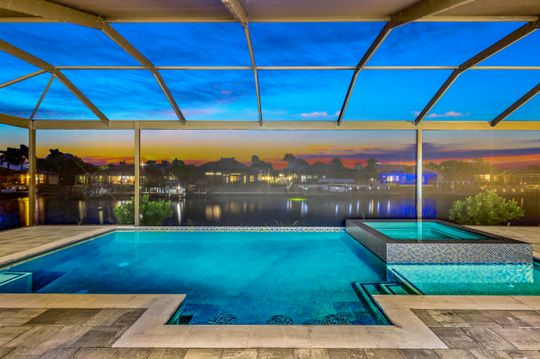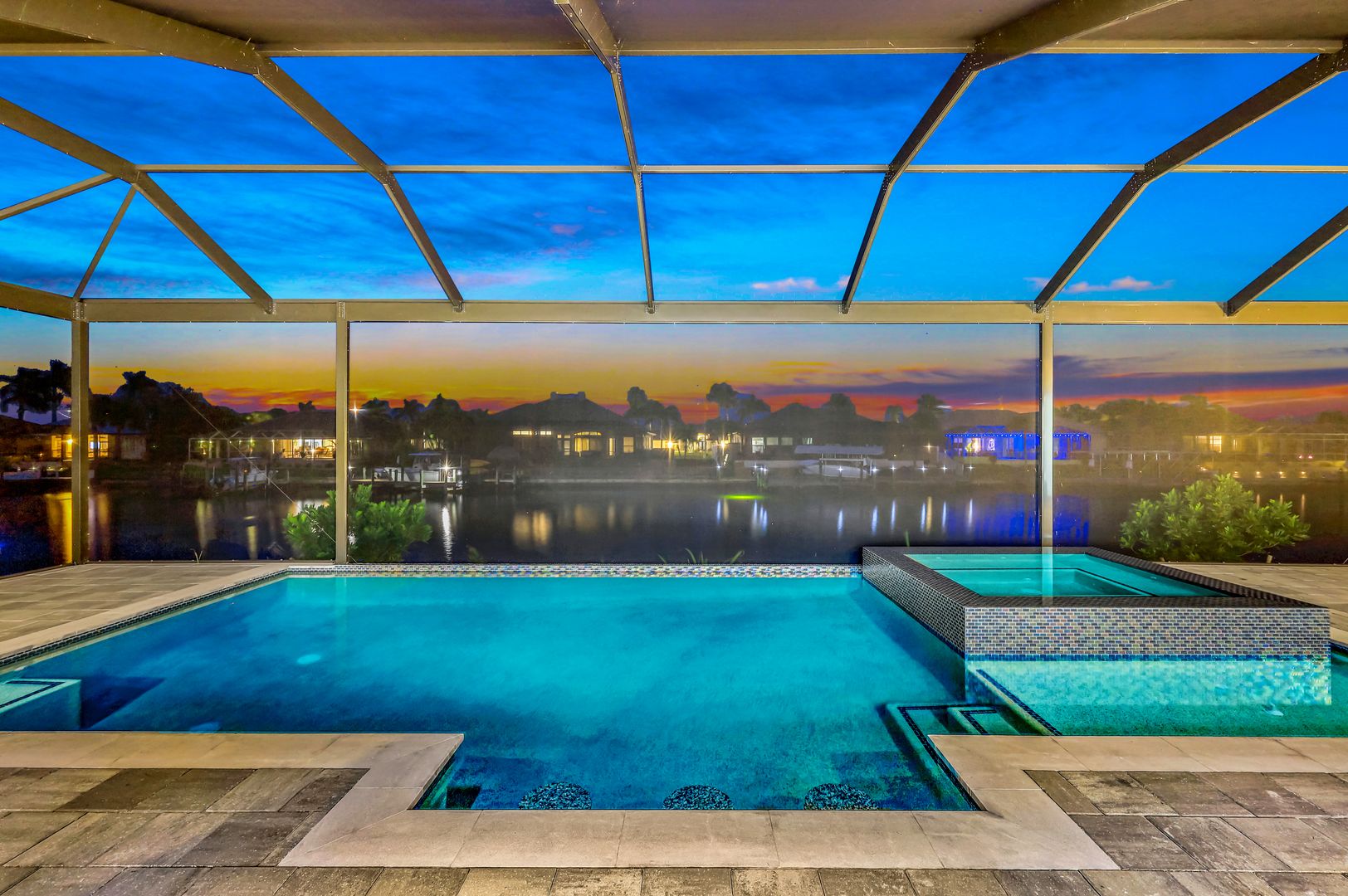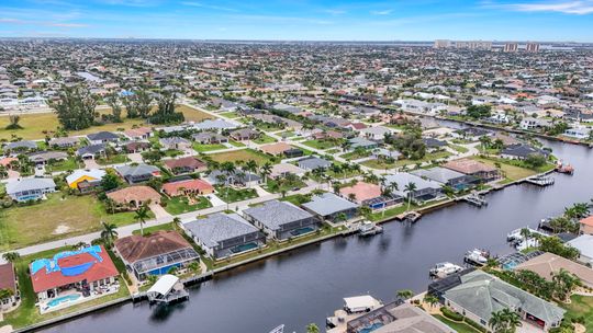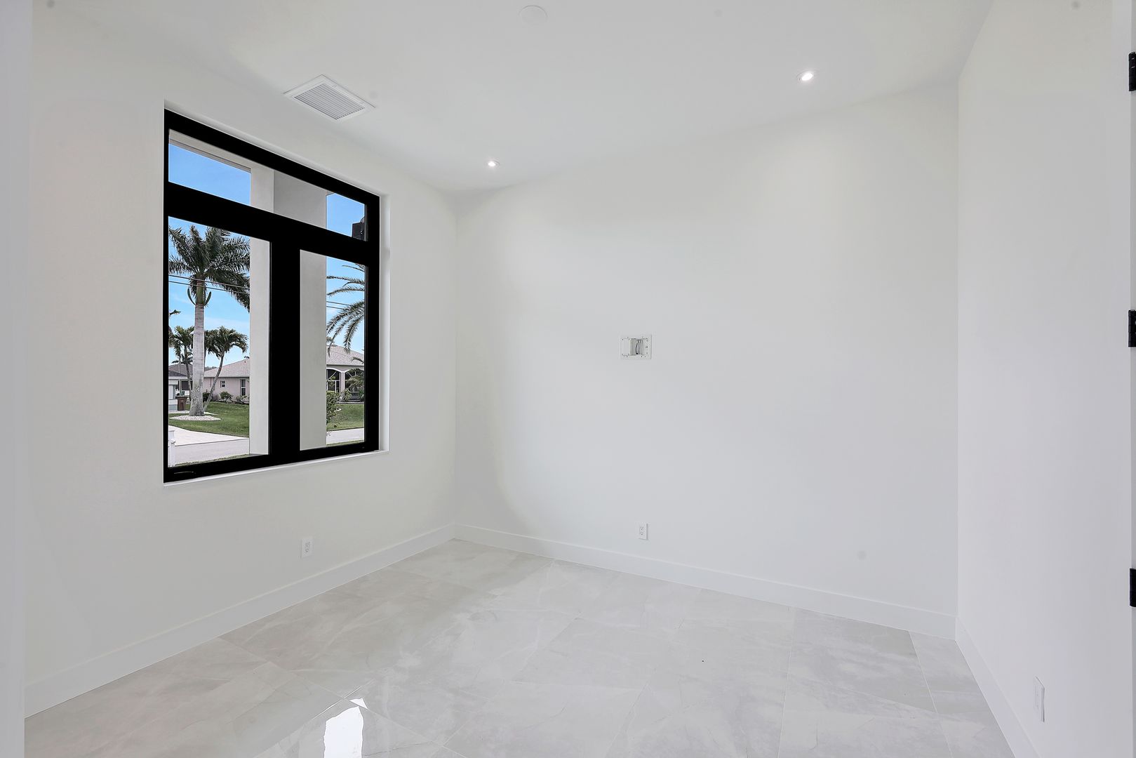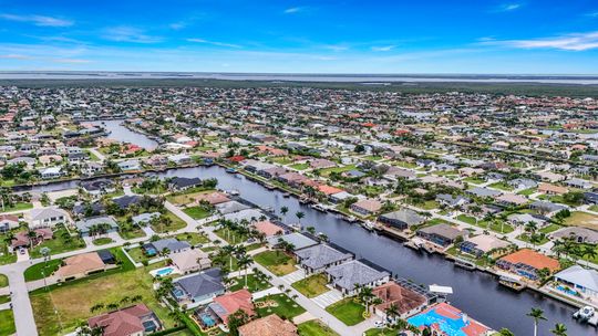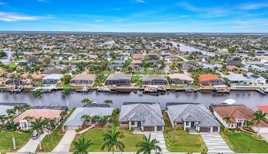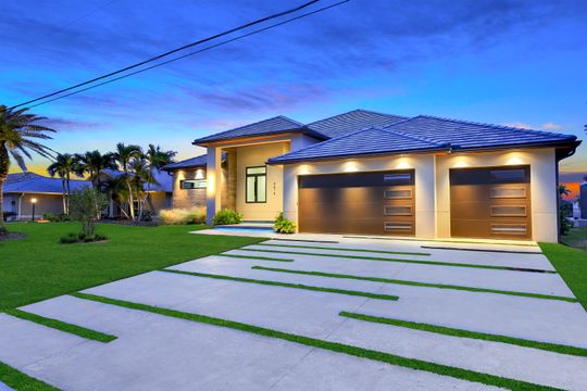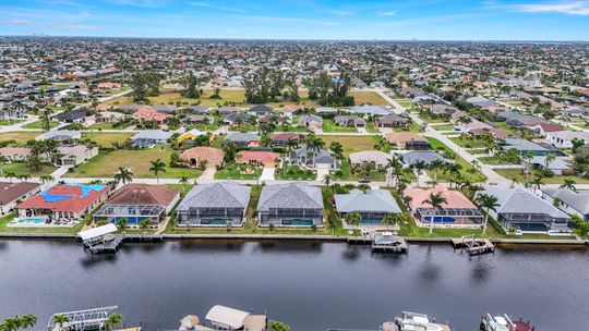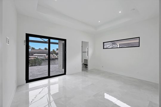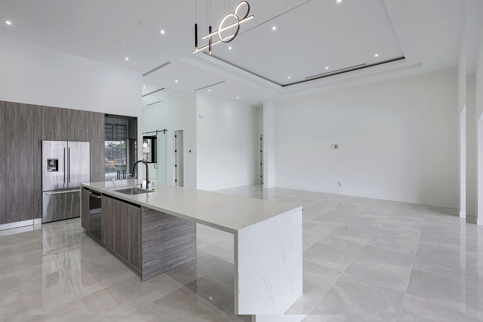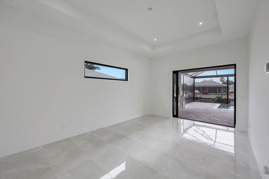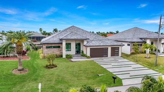 Modern New Construction Gulf Access Home in SW Cape Coral. Straight out of the pages of a magazine! Clean contemporary design overlooking a 150+ foot wide canal near Cape Harbour! Featuring 2,844 SF with 4 Beds, Office, 4 Bath, and a 3 Car Garage. Open family room with high volume ceilings and 23' pocketing sliding glass doors leading out to pool & spa. Entertainer's Kitchen has European style cabinetry, double waterfall Quartz island, high-end Bosch appliances, hidden walk-in pantry, and wine wall. Master suite overlooks the water. Stunning master bath w/ dual vanities and large walk-in shower w/ designer tub. Junior master suite and 2 spare bedrooms ideal for family & guests. Entertain or Relax on the spacious lanai w/ outdoor kitchen & false-negative edge Heated Pool on the water! Integrated 360 degree spillover spa and sun shelf complete this amazing pool! LOADED WITH FEATURES! Panoramic Screen Enclosure w/ picture window screens, Impact Windows & Doors, Wood ceilings on the lanai & foyer, liner AC vents, designer lighting, and large format tile flooring throughout. Boating & Fishing right from your back yard! Cape Harbour waterfront dining, shopping, and events very close by!