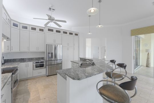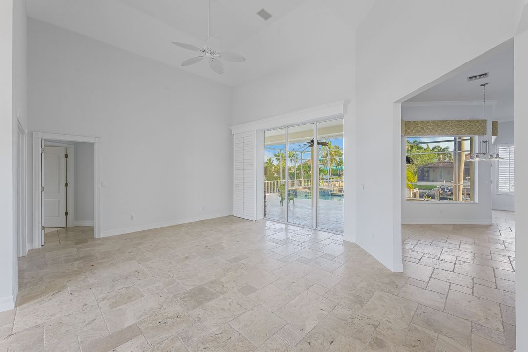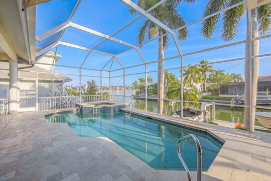 Explore this extraordinary waterfront retreat, a haven for those with a passion for boating, nestled in a tranquil northern island setting en route to Hideaway Beach. Bathed in southern sunlight, this residence boasts an expansive, light-filled floor plan. Situated on a wide 100ft canal and bay, it offers breathtaking vistas and effortless water direct access to Collier Bay and the Gulf of Mexico. The home presents a versatile den/office, high ceilings, and a well-appointed eat-in kitchen featuring a center idland with double sink, double oven, new refrigerator (2021), and breakfast bar seating six, seamlessly flowing into a family room that opens to a formal living area and dedicated dining space, all overlooking the 100 ft. waterfront. This single-level treasure includes a luxurious ensuite primary bedroom with dual walk-in closets and a spacious primary bath with a soaking tub, alongside split bedrooms for enhanced privacy, each equipped with cable TV and adorned with natural stone travertine and tile flooring throughout the residence. Outside, a sizable screened lanai with a pool and spa beckons relaxation, complemented by a wooden dock featuring a jet ski lift and slip accommodating boats up to 44ft with a 40,000 lb. boat lift, catering to the avid boater. Additional highlights encompass freshly painted interiors, a spacious laundry room with new cabinetry (washer/dryer-2019), and a dual garage with storage cabinets and shelving units that remain. The property boasts exceptional curb appeal, a generous side yard boasting a productive avocado tree, and lush landscaping with palm trees and tropical foliage, promising an enchanting indoor-outdoor lifestyle in the heart of Florida. Pat Wilkins | RE/MAX Affinity Plus | 239-290-8593 | https://marcoexpert.com