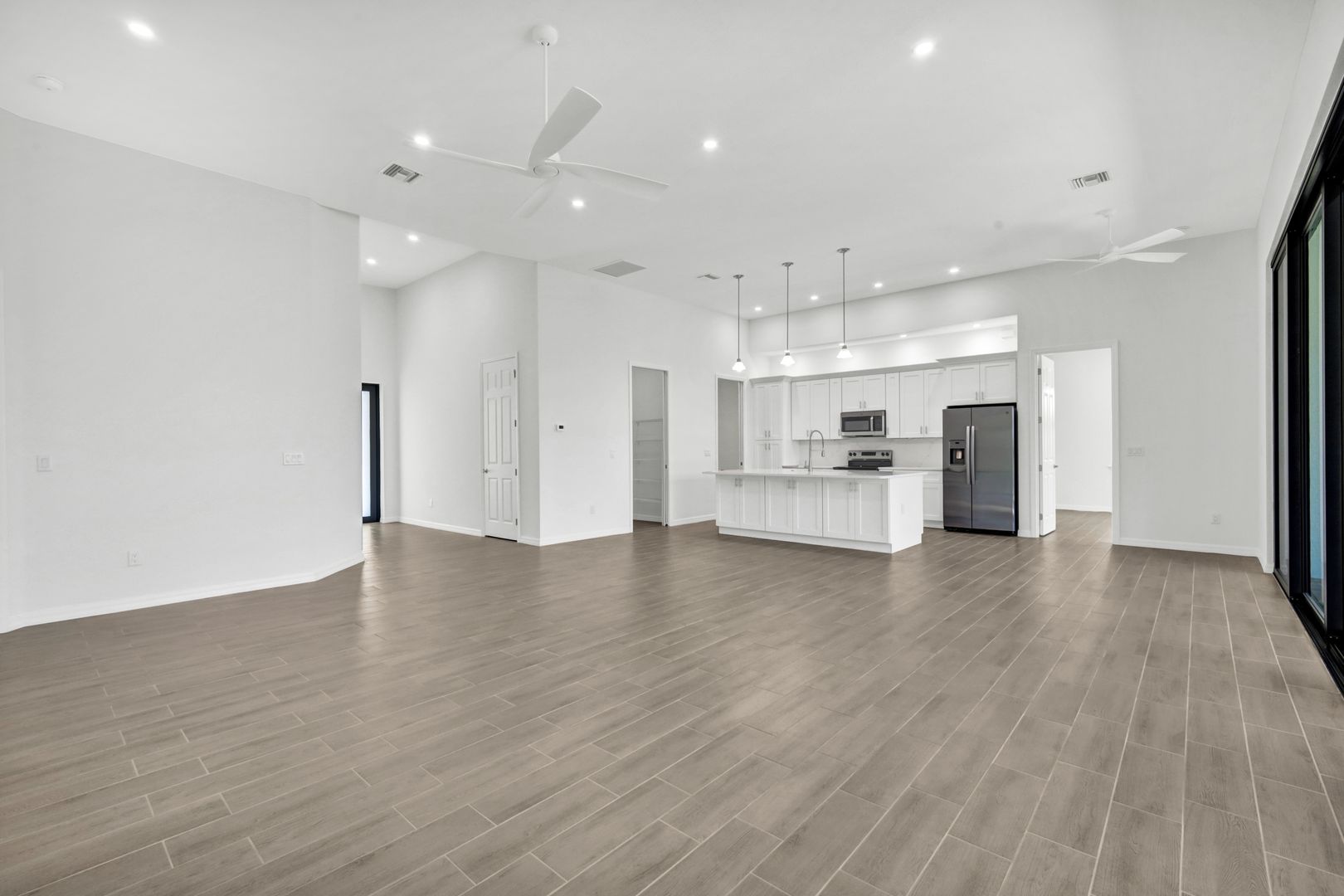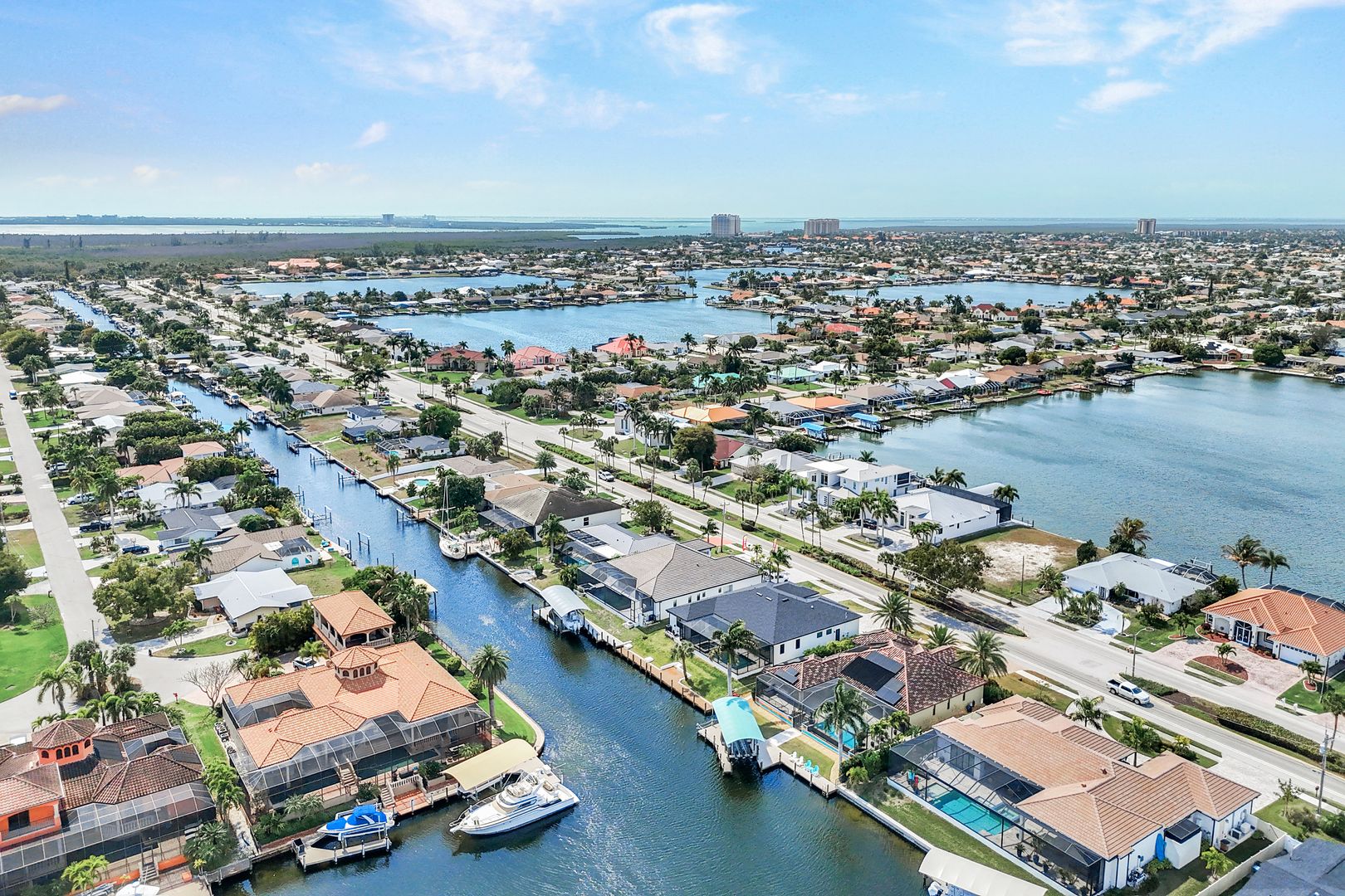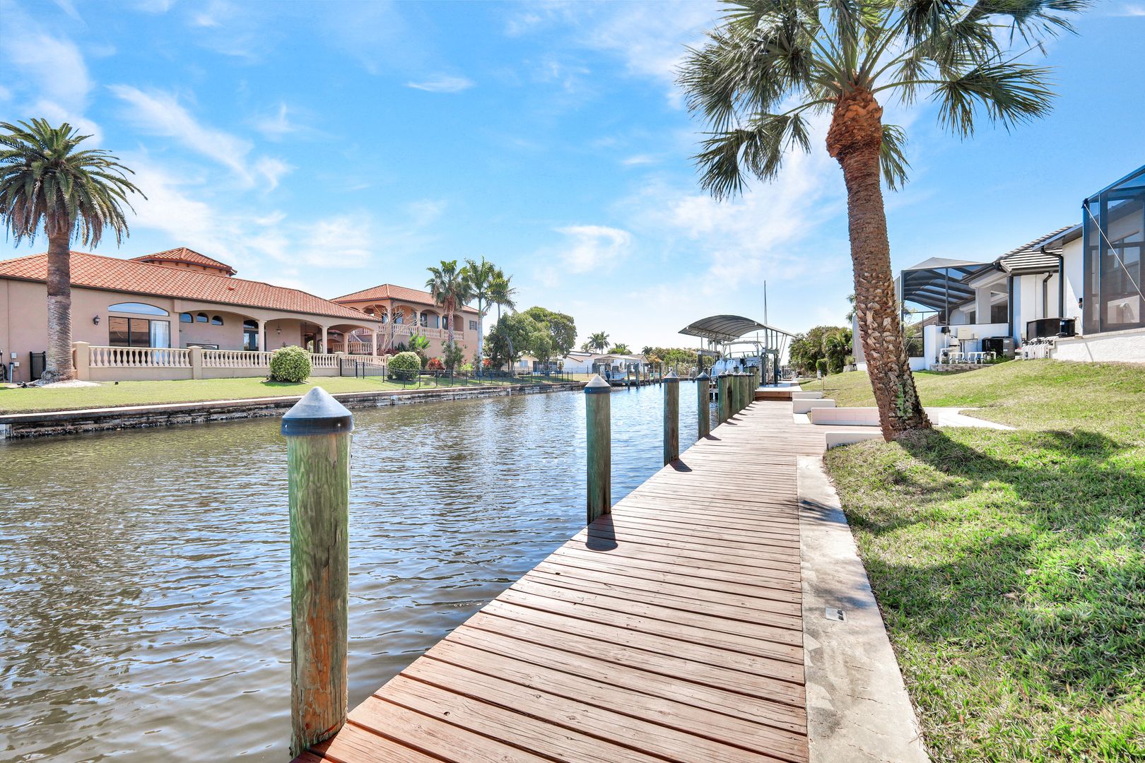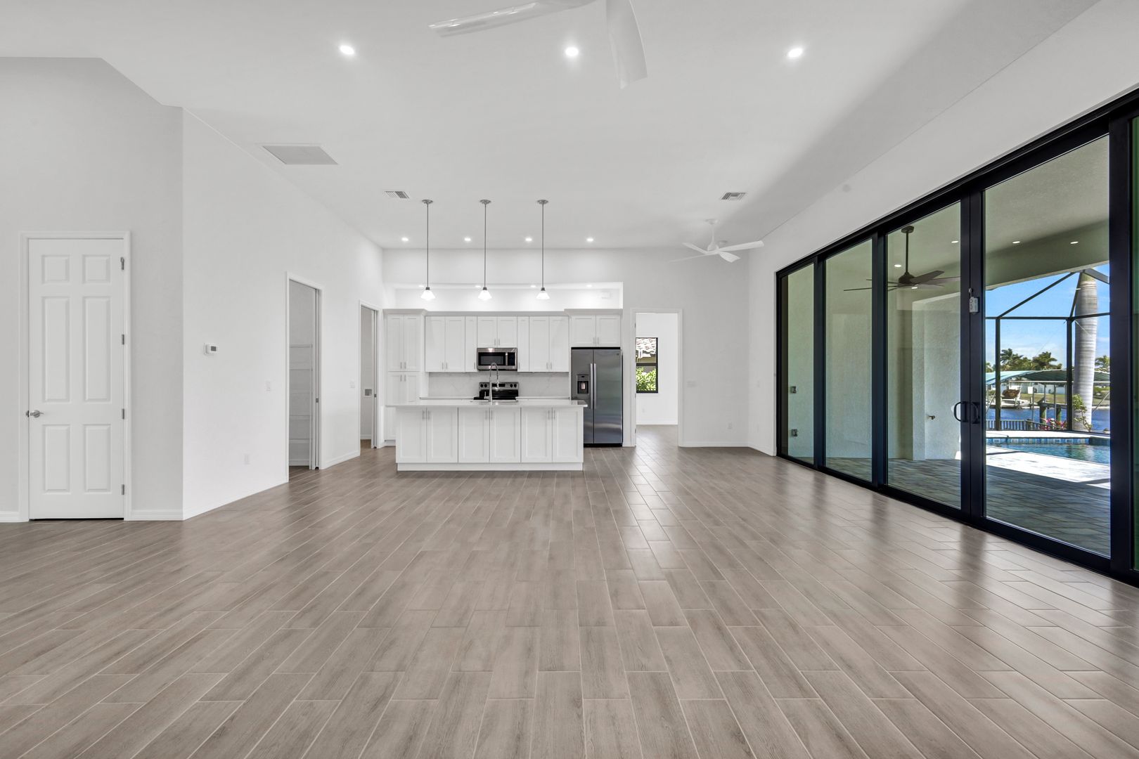 Brand-new 2026 Coastal Contemporary Home in Cape Coral’s highly sought-after 8 Lakes area, offering Deep Water, Direct Gulf access with no bridge restrictions and quick access to the river and open water. Situated on an intersecting canal, the home currently enjoys water views from both the front and rear, with expansive canal views from the backyard and lanai. The wide canal that intersects with this property is part of the Annual Christmas Boat Parade where you can enjoy the show right from your own back yard! Designed for effortless Florida living, the main home features plank-style tile flooring throughout, soaring ceilings, and oversized 10’ sliding glass doors that seamlessly connect the great room to the outdoor living space. The chef’s kitchen offers quartz countertops, stainless steel appliances, a large island with breakfast bar, and a walk-in pantry, with ample room for a dedicated dining area. The spacious primary suite includes sliding glass doors to the lanai, two walk-in closets, and a spa-inspired bath with dual vanities, soaking tub, and walk-in shower. All guest bedrooms are generously sized as well. A standout feature is the private guest house / in-law suite with its own entrance, bedroom, full bath (also serving as a pool bath), living area, and kitchenette with sink, dishwasher, and refrigerator—ideal for extended family, guests, or flexible living. Outdoor living shines with a large covered lanai, plumbed for an outdoor kitchen, overlooking the saltwater heated pool and spa. The long dock can accommodate a large vessel, making this a boater’s dream. Additional highlights include impact windows and doors, 3-car garage, circular paver driveway, eastern rear exposure to watch the morning sunrise, and an assumable flood insurance policy—a major advantage in SWFL. With 2,275 sq ft in the main home, 527 sq ft in the guest suite, and 3,846 sq ft total under roof, this elevated, worry-free new construction is perfect as a primary residence, seasonal retreat, or high-end vacation home. Don't let this one slip away! Secure your "Piece of Paradise" today!