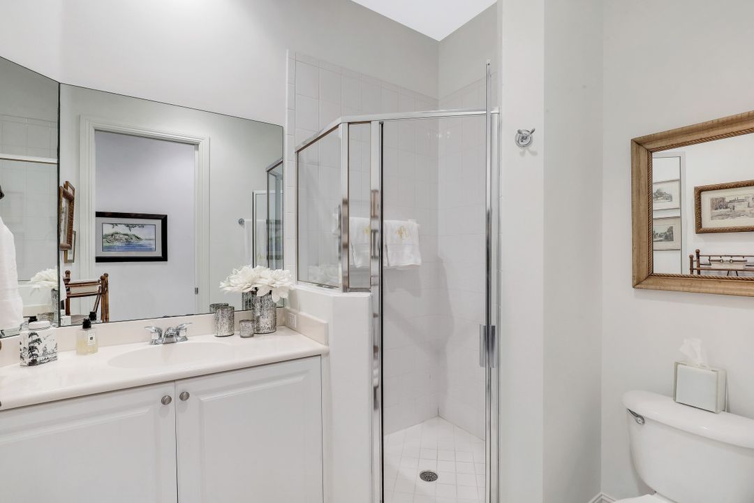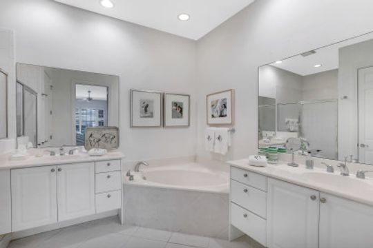 Dual vanities in bath, soaking tub and separate shower