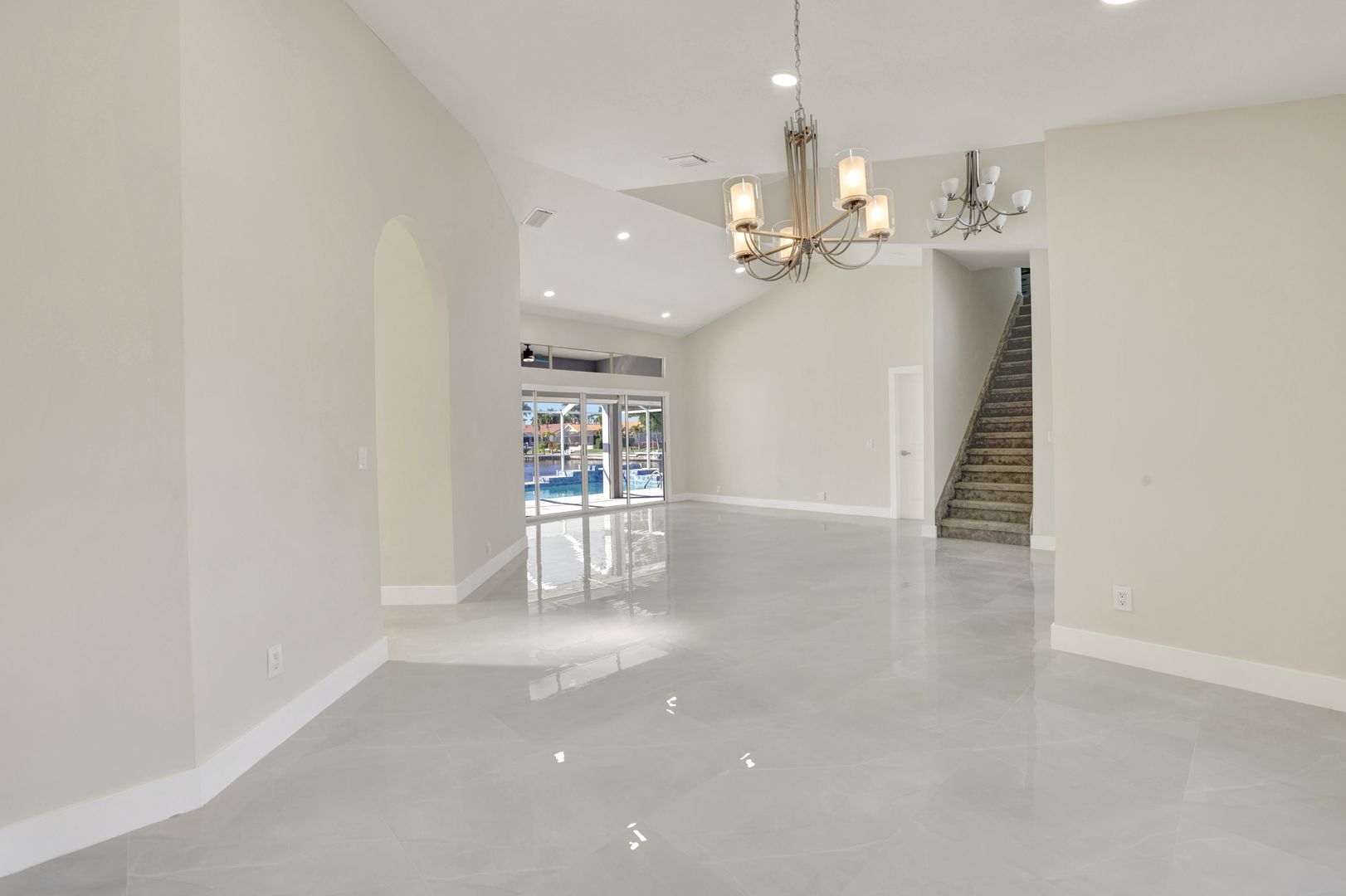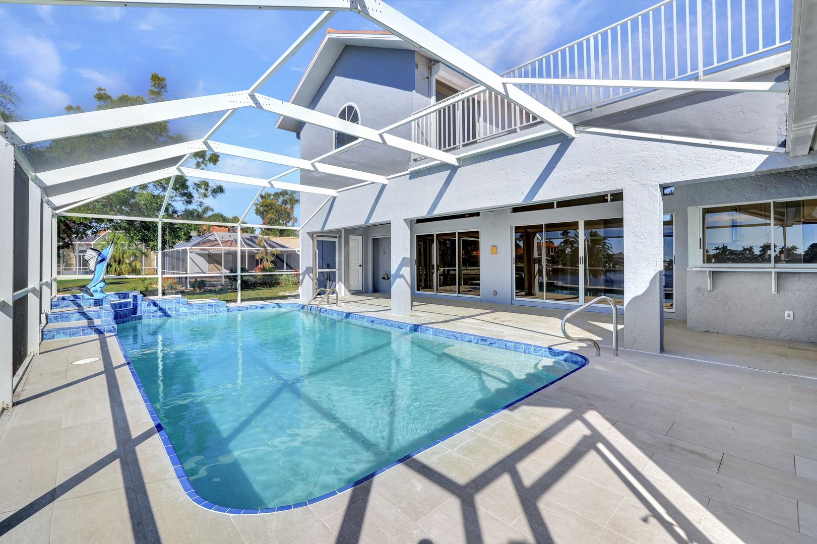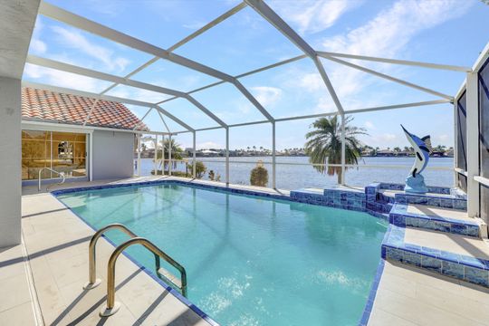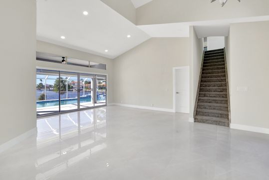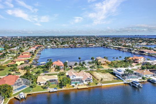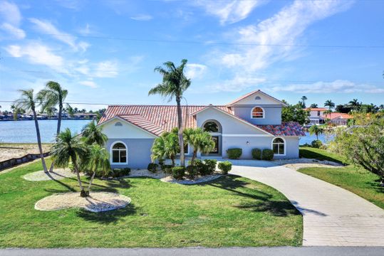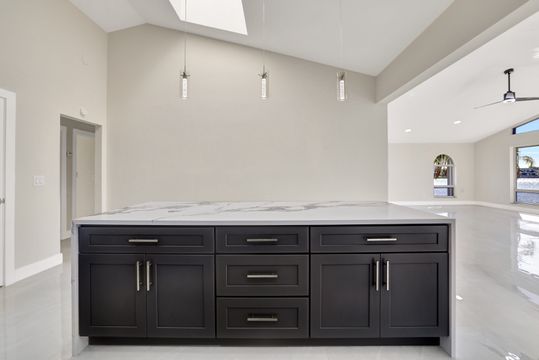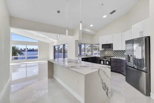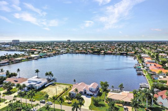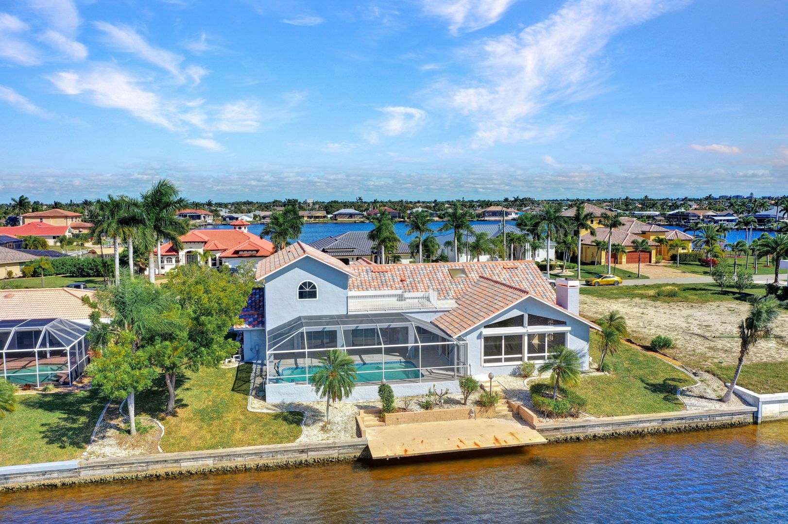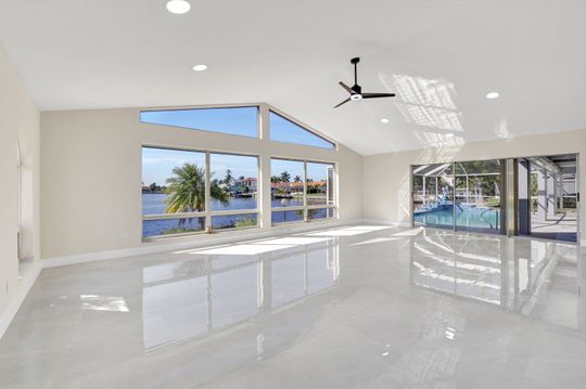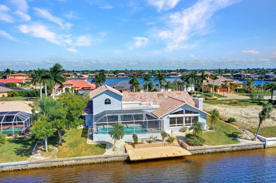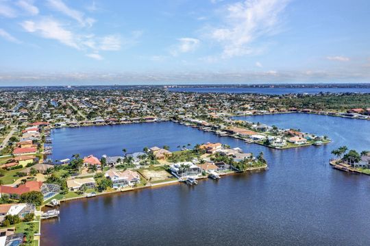 GULF ACCESS, WESTERN EXPOSURE, 8 LAKES, and UPDATED! Welcome to your dream home located in the prestigious 8 Lakes neighborhood of SW Cape Coral FL. Situated on a triple lot with breathtaking wide water views and coveted western exposure, this Gulf-access property epitomizes waterfront living at its finest. Recently completed, total renovation has transformed this residence into a masterpiece of modern design and functionality. Home encompasses 3294 sqft of living space, formal living & dining rooms, HUGE family room w/wall to wall windows, 2 Owners Suites (one up and one down stairs), 2 additional BR, 3.5BA & 2 Car side load garage. Step inside onto the 24x48 polished porcelain tile floors that lead you through an open-concept living space with soaring ceilings and abundant natural light streaming in from sliding glass doors, windows and a skylight. The kitchen is the heart of the home and boasts luxurious quartz waterfall counters, complemented by sleek shaker cabinets equipped with soft-close technology. Brand new LG slate appliances, a stylish tile backsplash, and a pass-through to the lanai make this kitchen a chef's delight and an entertainer's haven. Bathrooms feature floor-to-ceiling marble tile showers, quartz countertops, shaker cabinets, under mounted sinks, and porcelain tile flooring. LED lighting throughout adds a touch of eco-friendly sophistication, while impact or roll-down shutters provide peace of mind during storm season. Outside, the expansive covered lanai overlooks the sparkling blue pool, where you can soak in the warmth of the Southwest Florida sunsets painting the sky in vibrant hues. With only a 15-minute boat ride to open waters, this home is a boater's paradise, offering easy access to the Gulf of Mexico. Indulge in the ultimate Florida lifestyle with this impeccably designed home that seamlessly blends elegance, comfort, and functionality, all within reach of the area's finest amenities and attractions. Schedule your private tour today and experience waterfront living at its absolute finest.
