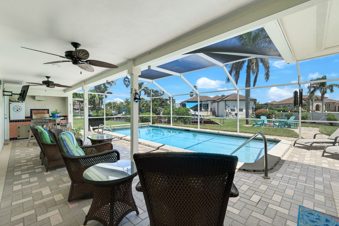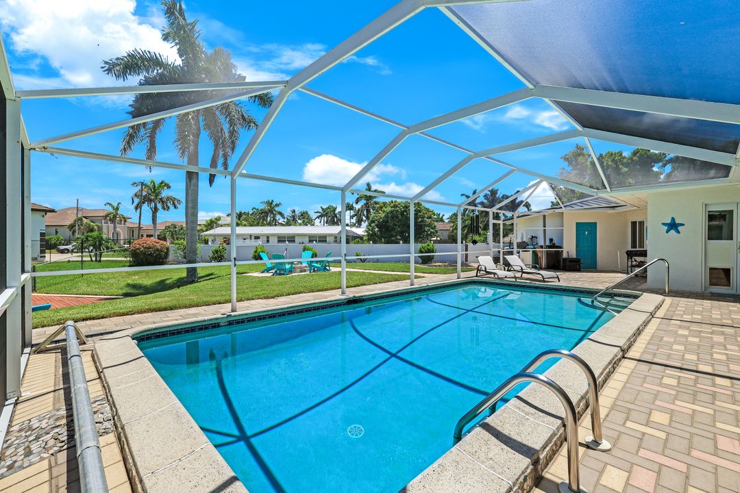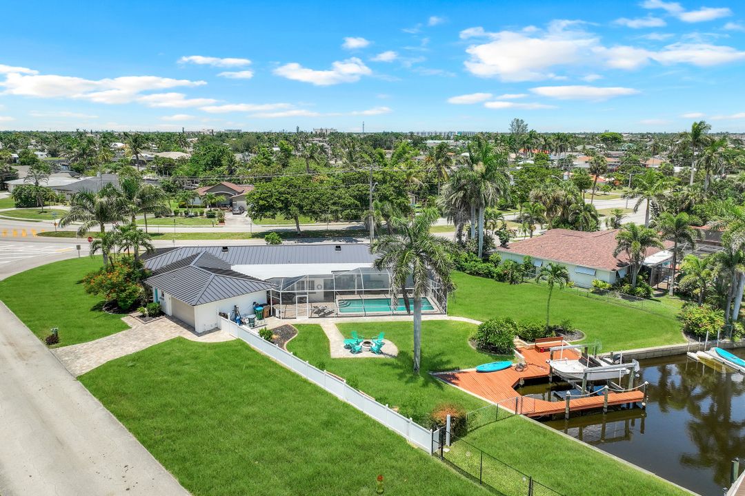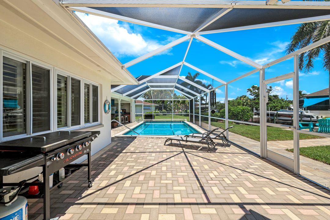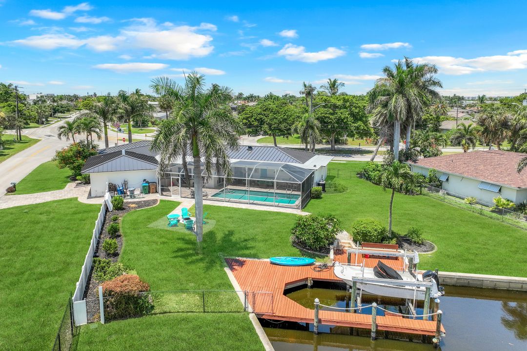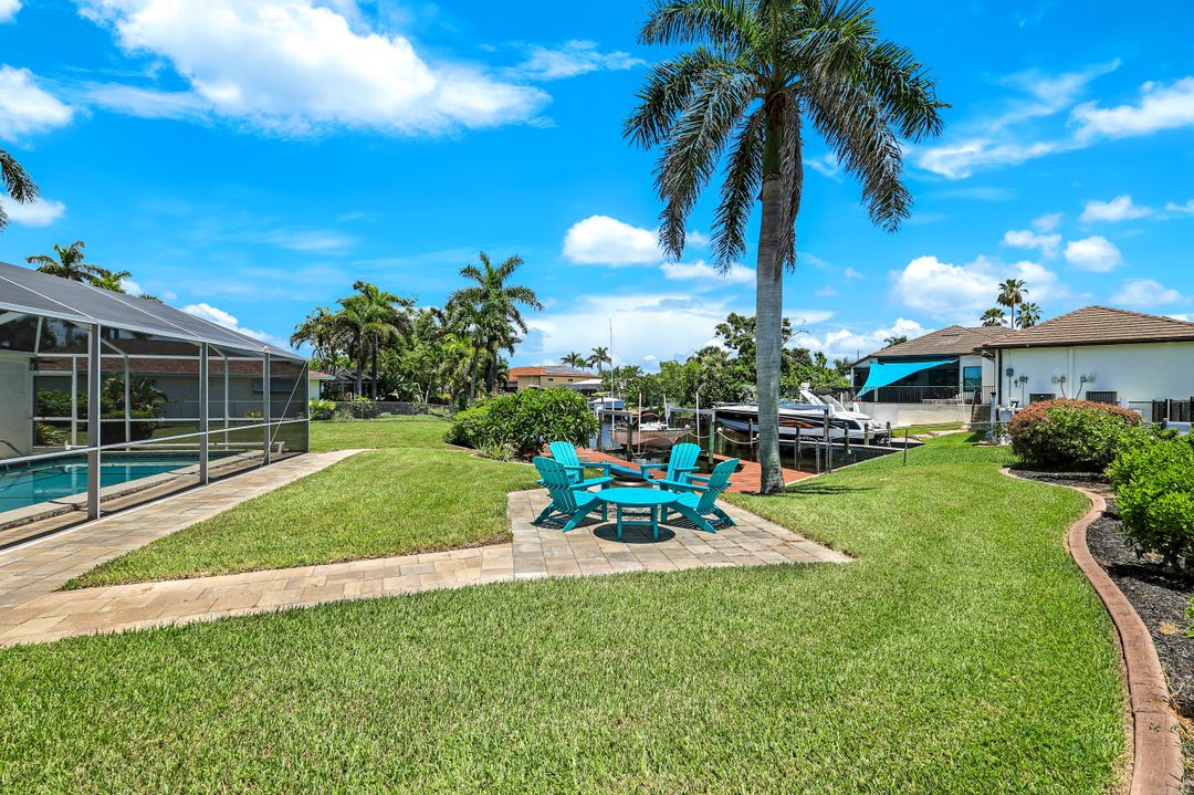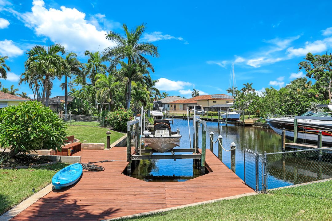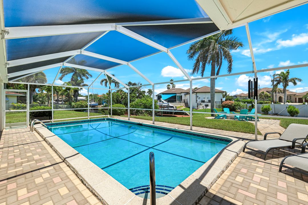 Experience the ultimate Florida waterfront lifestyle with this stunning Gulf-access pool home, located just minutes from open water with no bridges in the highly sought after YACHT CLUB of Cape Coral FL. Perfect for entertaining, large family gatherings or simply a personal retreat, the oversized corner lot features an electric heated saltwater pool, spacious screened lanai, outdoor kitchen with built-in grill, and a pet-friendly backyard with decorative curbing. Boaters will love the marine-grade dock with a 10,000 lb boat lift, ready for endless days on the water. Inside, the home offers 4 bedrooms, 4 bathrooms, a large Florida room with plantation shutters, and a combination of hardwood and laminate flooring throughout. The coastal decor and casual feel is relaxing after a a day on the water or on white sandy beaches. The kitchen is beautifully appointed with granite countertops, white shaker cabinets, stainless steel appliances, a double oven, and a charming bread basket nook, all flowing into formal and casual dining spaces. The primary suite boasts hardwood floors, a hidden closet behind the mirror, an ensuite bathroom with dual sinks, extra cabinetry, a jacuzzi tub, frameless glass shower, and direct access to the pool and lanai. Additional features include a 2024 metal roof, impact windows and doors, two A/C units, a large laundry room with storage and counter space, and a Jack & Jill bathroom with leather-textured countertops. The pool cage screens were recently repaired after Hurricane Ian, and the pool heater and pump are only three years old, ensuring peace of mind and top-notch amenities for the next lucky owner. The home also features permanent Gemstone LED track lighting, fully customizable through a smartphone app with millions of color options, perfect for security, holidays, and everyday curb appeal. Ideally located just minutes from downtown Cape Coral, the highly anticipated Bimini Basin, and the famous Cape Coral Yacht Club featuring restaurants, a resort-style pool, pier, playground, boardwalk, and community center, PLUS you’ll enjoy quick access to waterfront dining, boutique shopping, entertainment, white sandy beaches, all the vibrant lifestyle Southwest Florida has to offer - not to mention front row seats to the annual fireworks celebrations! Schedule your appointment today and secure your slice of paradise!