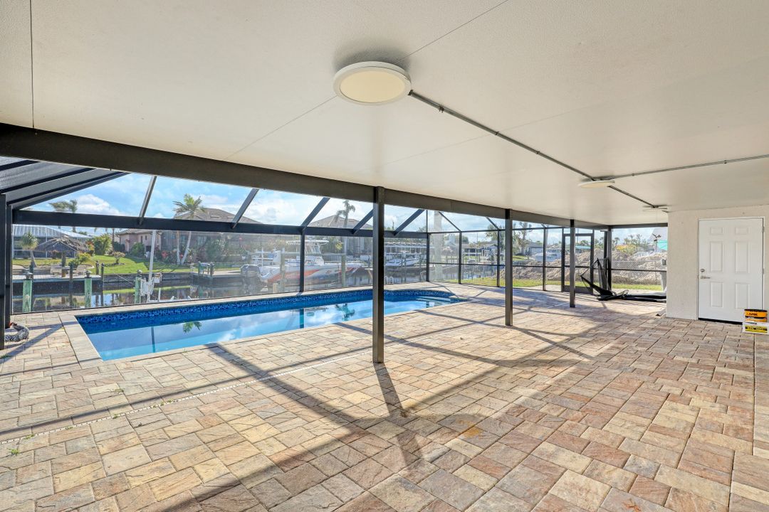 A charming waterfront single-family pool home in a highly sought-after community of Cape Coral, FL. This classic Florida-style design is an ideal blend of comfort & convenience. 3 bdrm & office/den, 2 bath, 1 car garage, provides ample living space. Only 1 mile to open water & offers a serene, inviting, peaceful atmosphere. Inside is bright & welcoming & offers Impact windows, open floor plan & is partially furnished. Pick out your own appl. w/ a credit back of $5,000. Large oversized heated pool, 10lb lift, large screened lanai & nice canal views. Perfect for enjoying Florida's beautiful water wildlife. Backyard offers a sundeck & paved walkway down to your boat. Plenty of room for entertaining & great for children and/or pets. In the heart of CC, minutes away from Rotary Park, The Westin Resort & Marina where there are several marvelous dining spots, & entertainment options. With its desirable location, attractive features, and comfortable living spaces, it's an excellent choice for the boating enthusiast. Roof is in process of being replaced. Move into this beautiful home or it would make a great rental or simply scrap and build the home of your dreams! Boaters dream location!