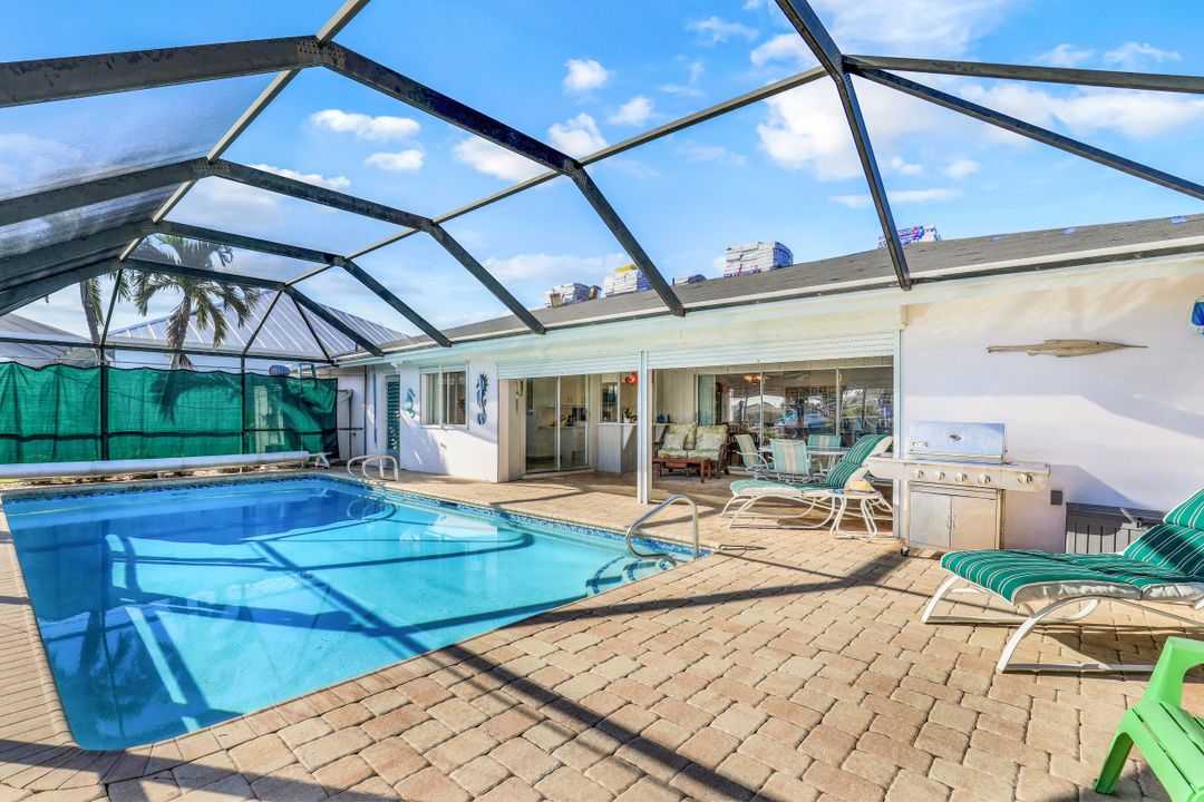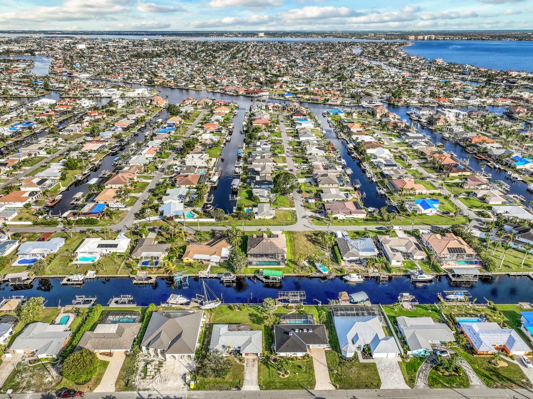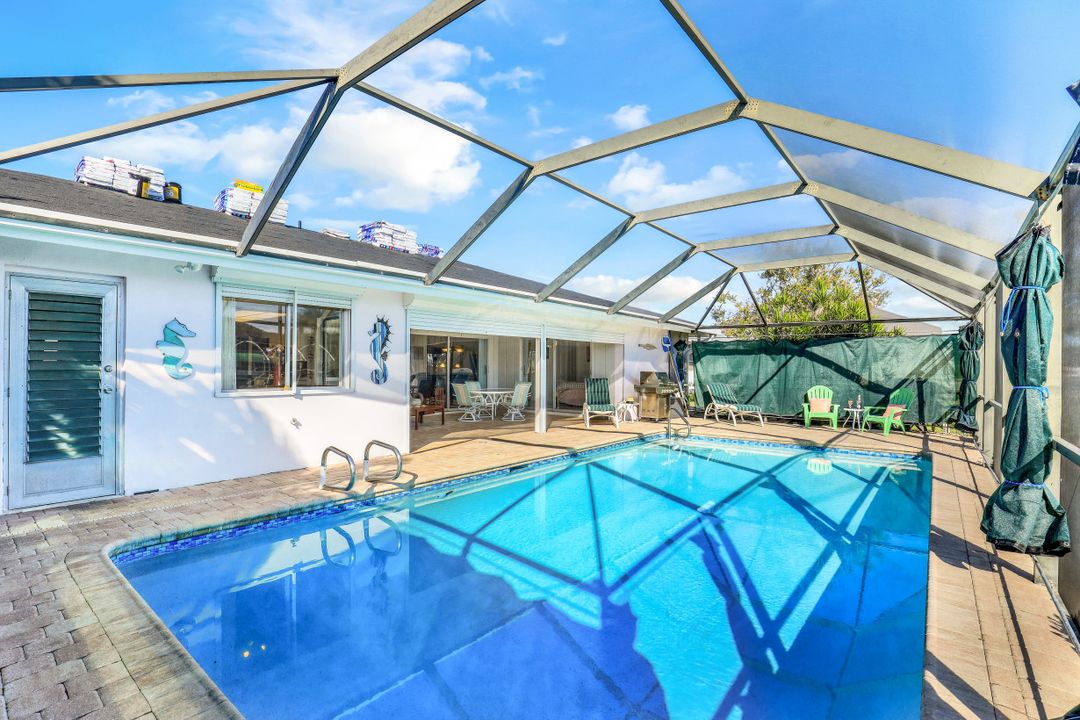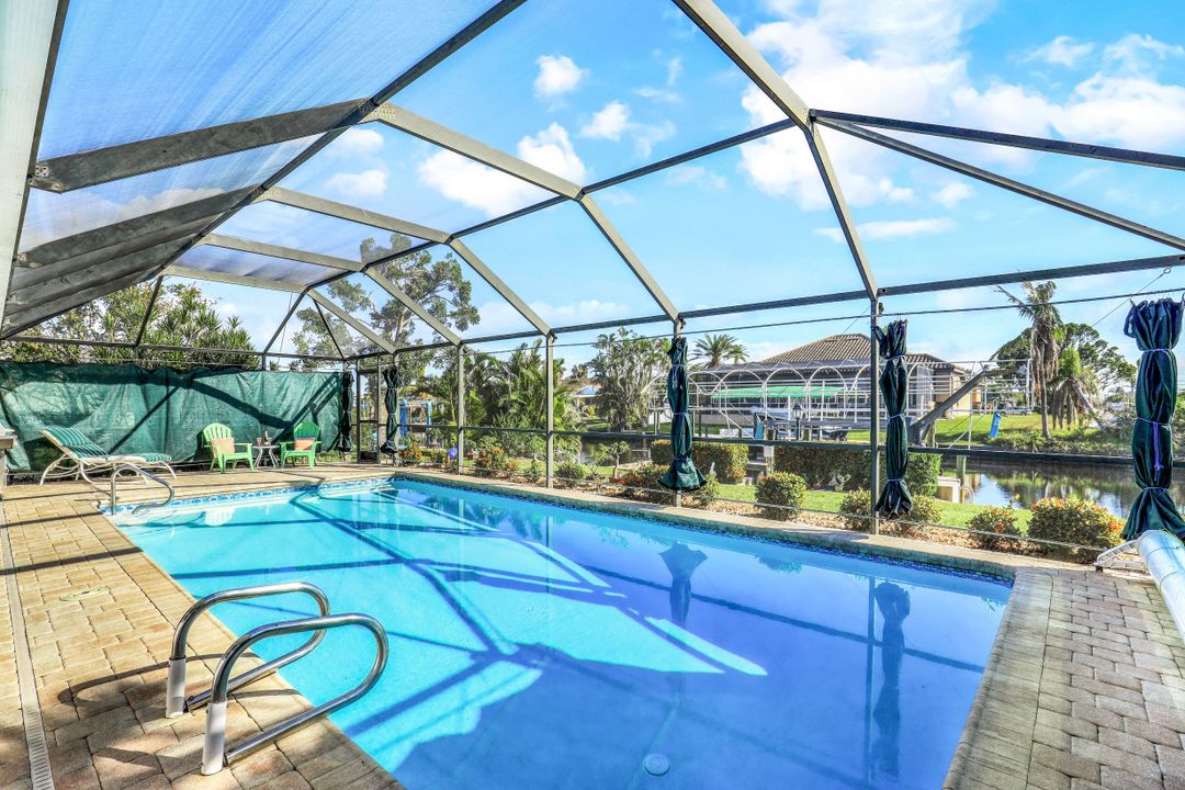 Strong & Mighty! Nestled popular boating community of SW Cape Coral FL just MINUTES TO OPEN WATER & all the boating benefits SWFL has to offer. 1404 sqft of living space, 3BR, 2BA & 2 Car Gar. Inside features gorgeous refurbished terrazzo flooring, galley kitchen w/newer SS appliances, quartz counters, utility farm style sink & nook area overlooking water & pool. Owners suite has private sliders to lanai, updated bathroom including quartz counter, counter top vessel sinks & glass shower door. All BR’s are spacious w/lots of light. Built to last with unheard of features that have proven to be worth every penny! Including but not limited to-BMI IMPACT windows throughout (roll downs shutters for sliders), newer electric panel, generator transfer w/generator, 1 inch thick roof sheathing & NEW roof! Outdoor living is a focal point w/large covered space, newer pavers, HUGE 15x30 heated crystal blue chlorine pool. Home comes complete w/dock, lift & davits for all your boating needs. Home has passed the ULTIMATE test withstanding & persevering through recent storm with no flooding or major damage! See attached features list for complete understanding as this home is NOT like the others!