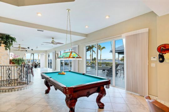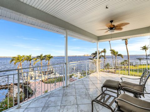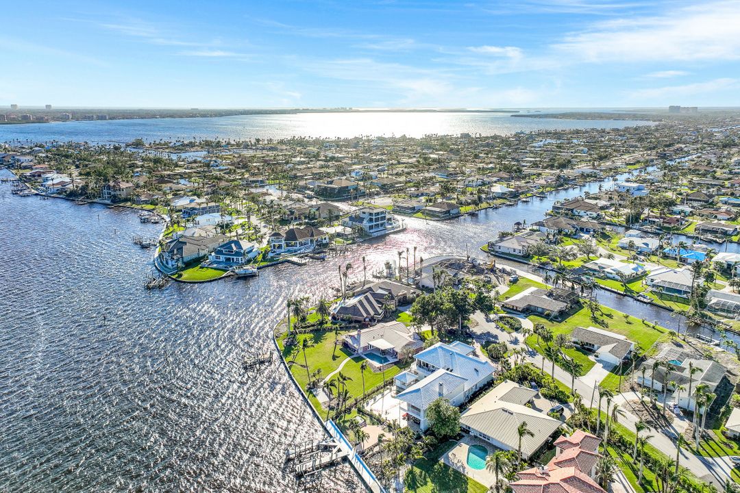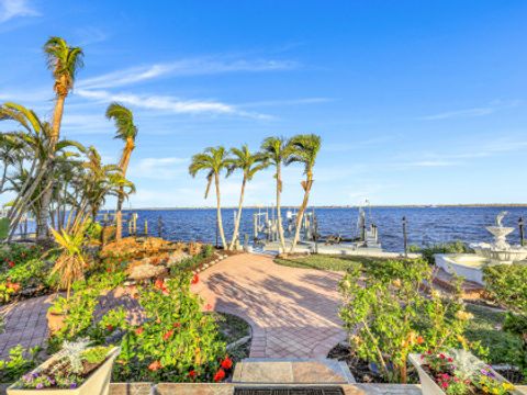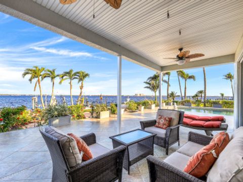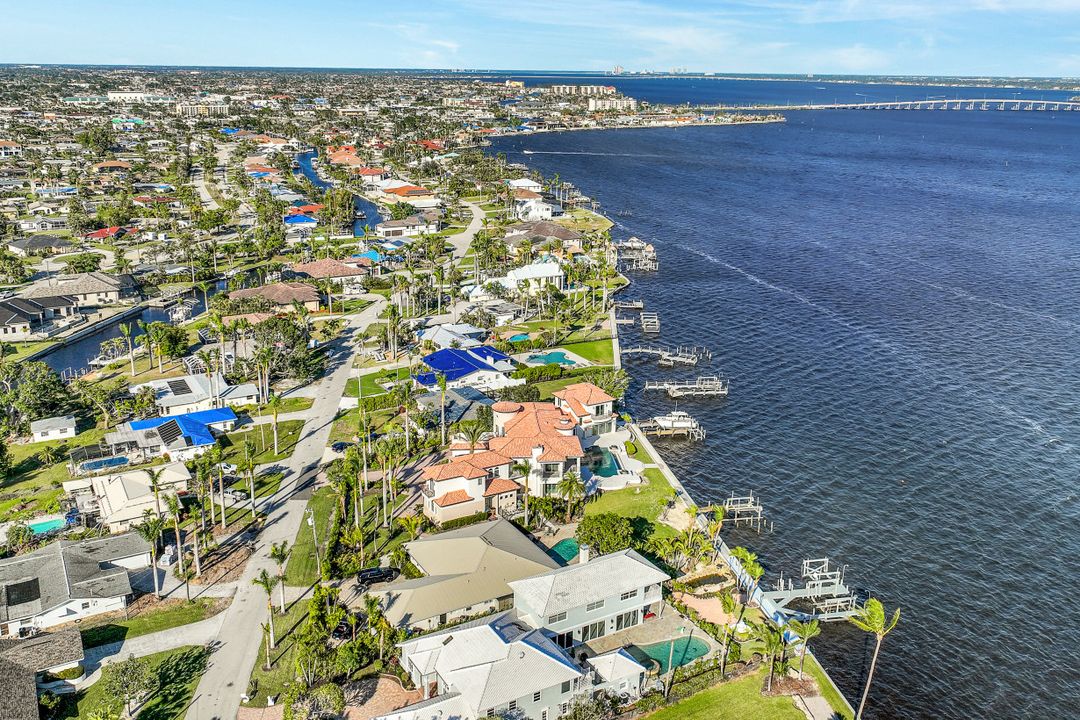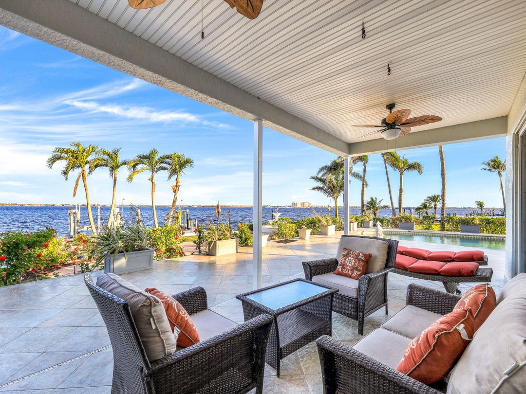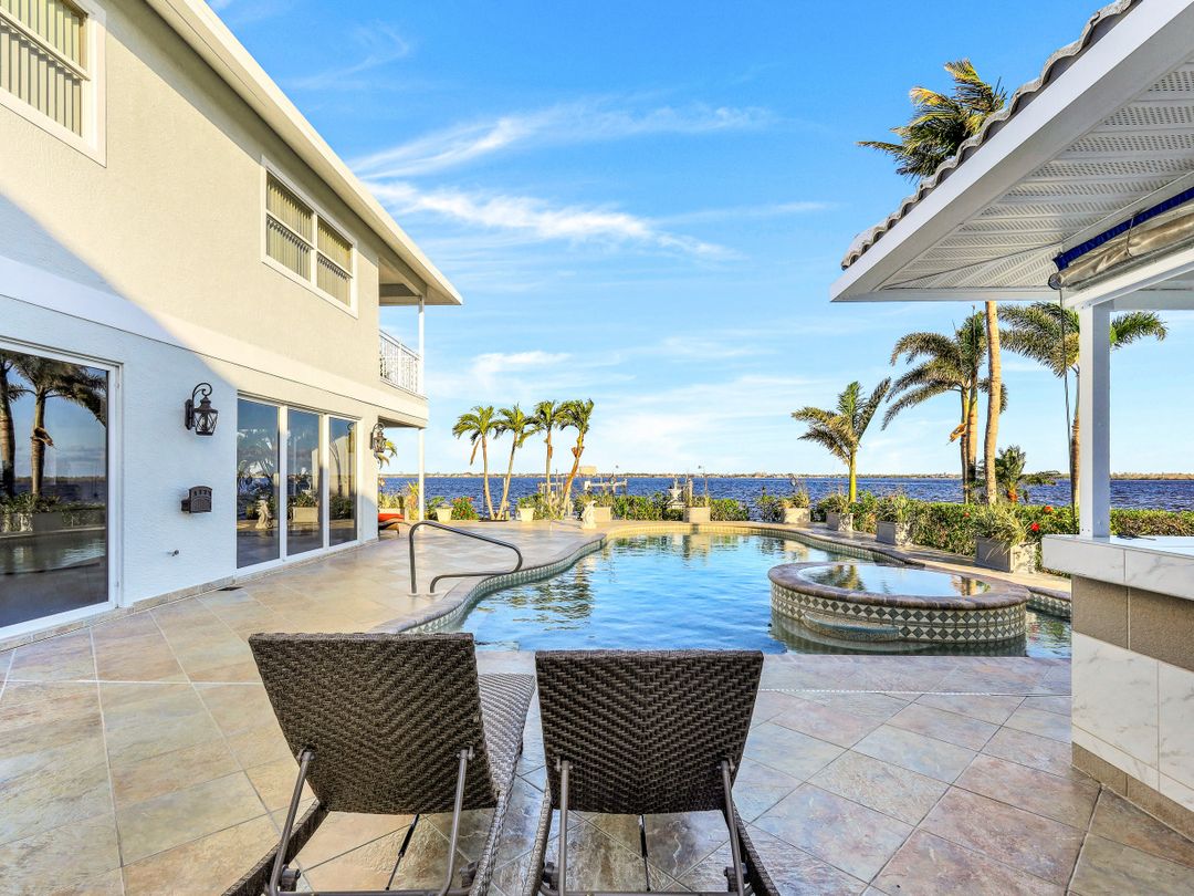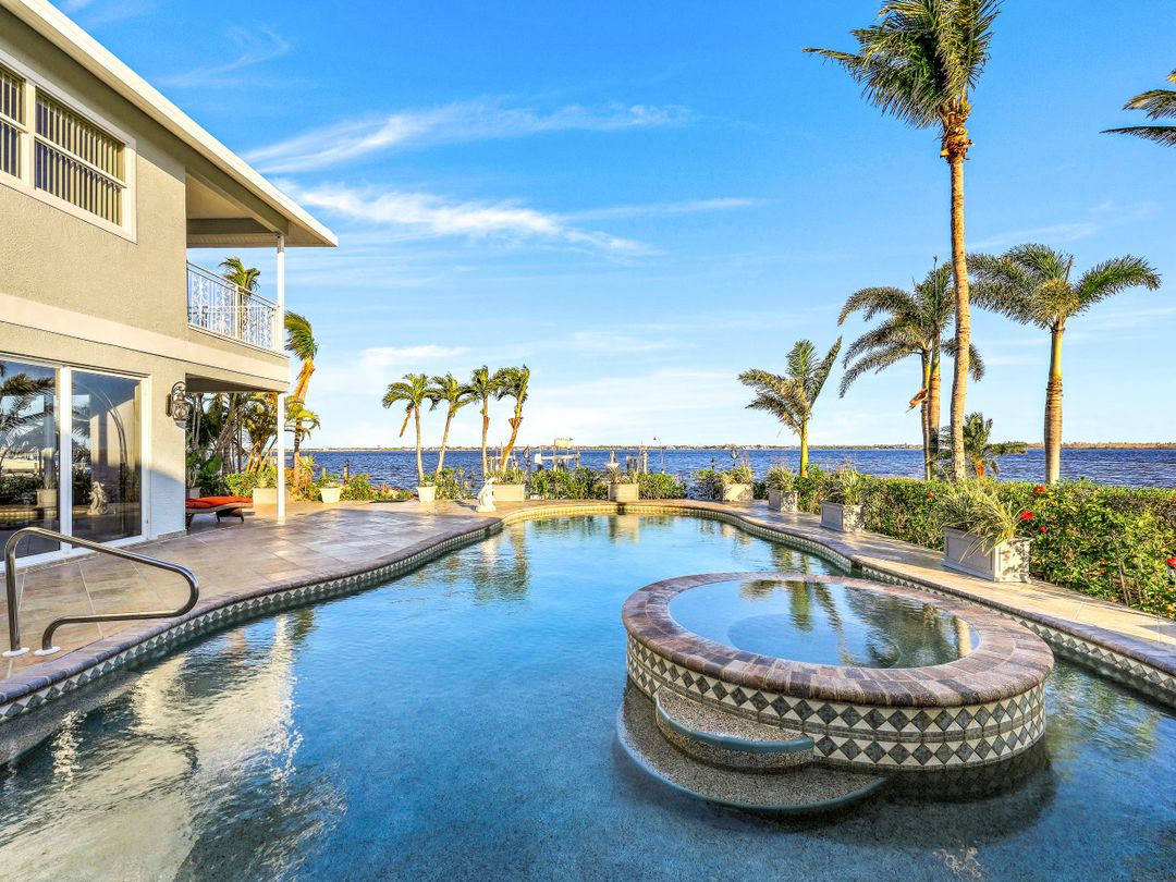 Riverfront Estate Home! This 7,000 SF Home overlooking miles of water in all directions. 2020 NEW TILE ROOF. NEW DOCK 2023. Situated on a .41 acres nearly 2x a normal lot. An entertainer's dream home featuring over 6 beds, 7 baths, an office, 6-person Sauna, indoor spa, and full bar. Large kitchen w/ granite counters, wall oven, and island. Elegant master suite with seating area and private balcony overlooking the expansive River views! Master bath with 2 walk-in closets, dual vanities, jetted tub, and shower. Well appointed spare bedrooms, waterfront balconies, and amenities on each floor. Spectacular 2,540 SF patio & pool area! The resort style pool area features an oversized pool with integrated infinity hot tub, fire feature, and cabana featuring grill, wet bar, and bathroom. Private pool bar! All this overlooking boats going by and miles of water in all directions!!! BOATERS - this is direct from your dock unrestricted boating access. Nautilus is an all waterfront street in the Yacht Club, known for great boating, stunning homes, and Cape Coral's only beach. Also near shopping, dining, Cape Harbour, Tarpon Point, and several beaches and islands by boat or car.
