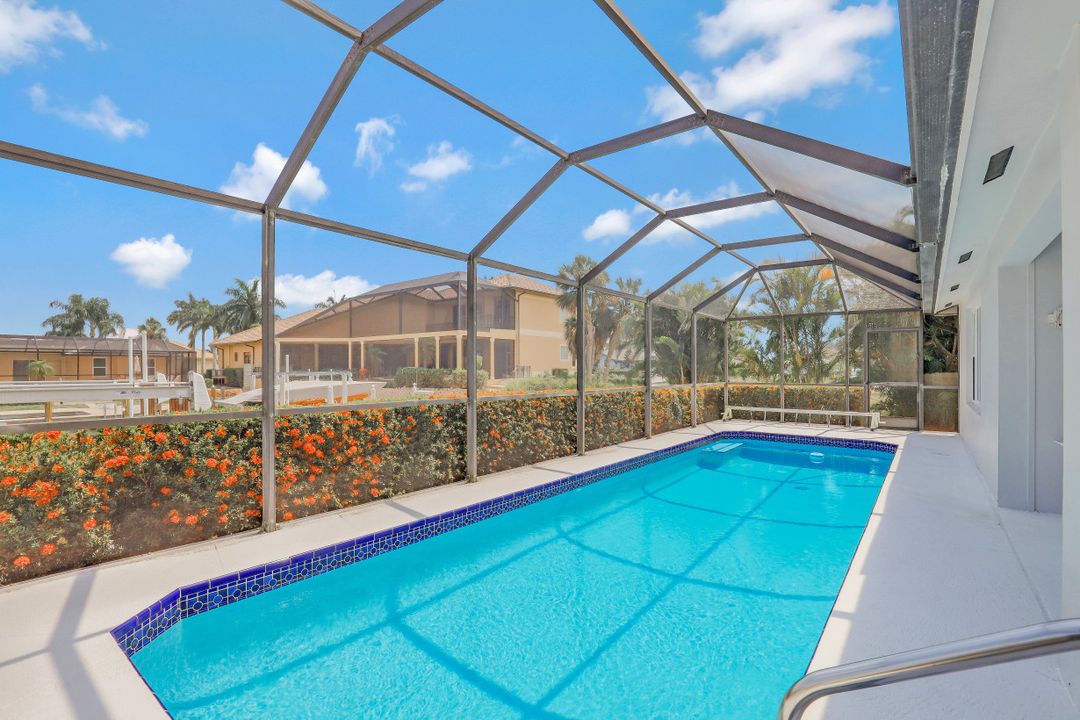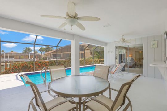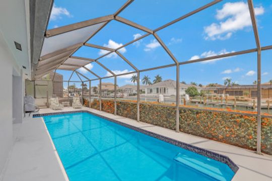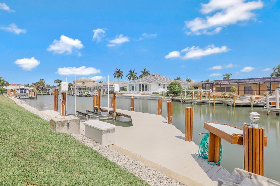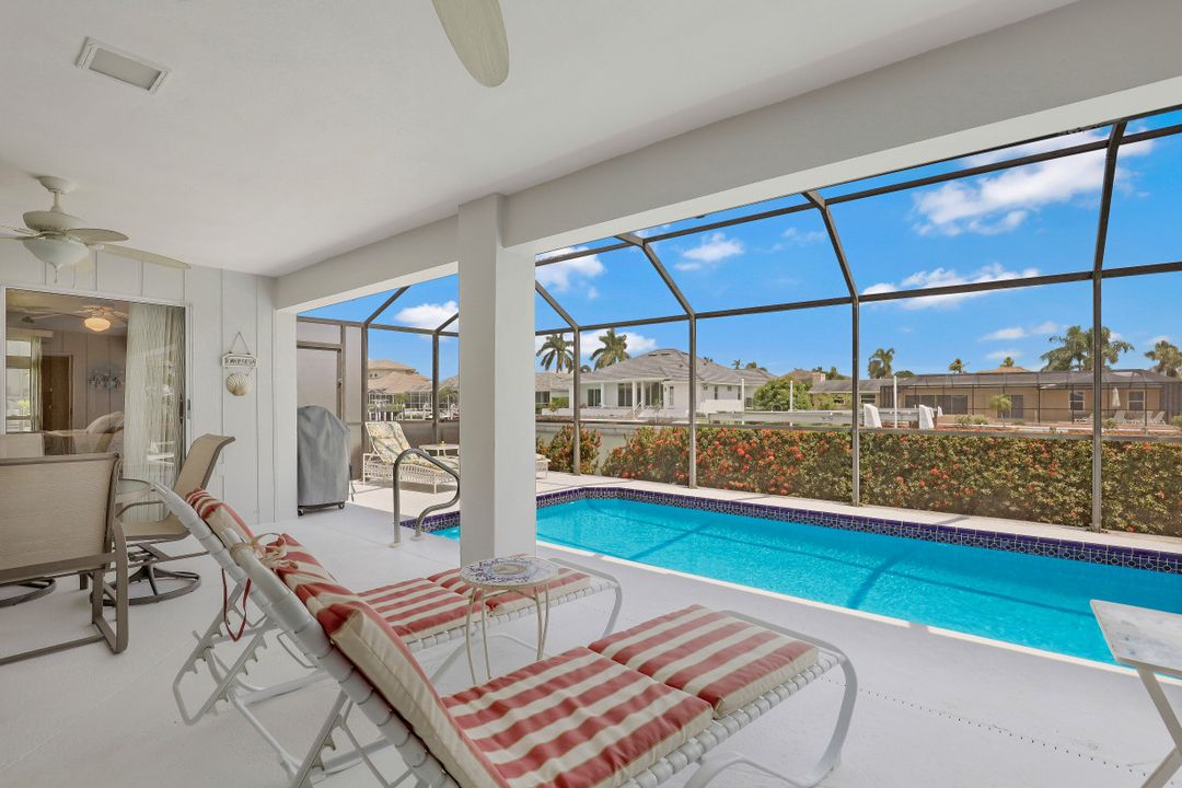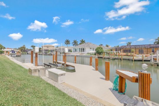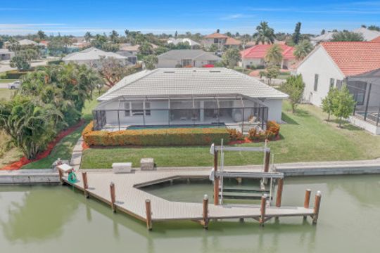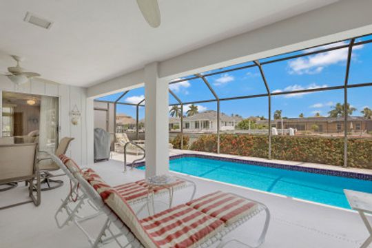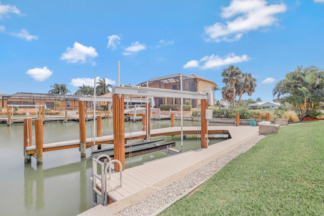Quick boating access to the Marco River with a 50 foot boat dock and 16,000 lb. boat lift this very well maintained home is a boater’s dream. The home lives large for a 2 bedroom (1818 sq. ft. under A/C) and has 2 and a half baths to accommodate your family and guests. Sunny southern exposure on your over-sized pool and extended screened lanai. Sliding glass doors add to the bright and light living style. Garage door is high impact rated and there are impact windows throughout.