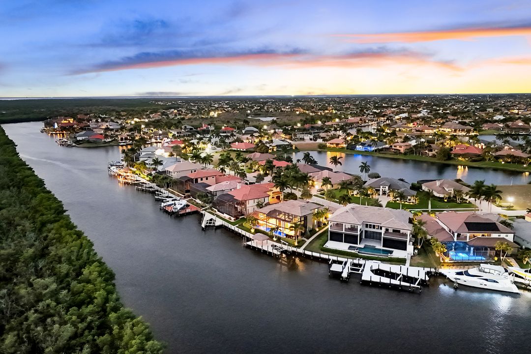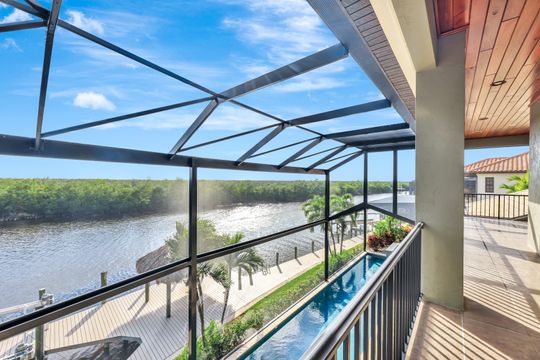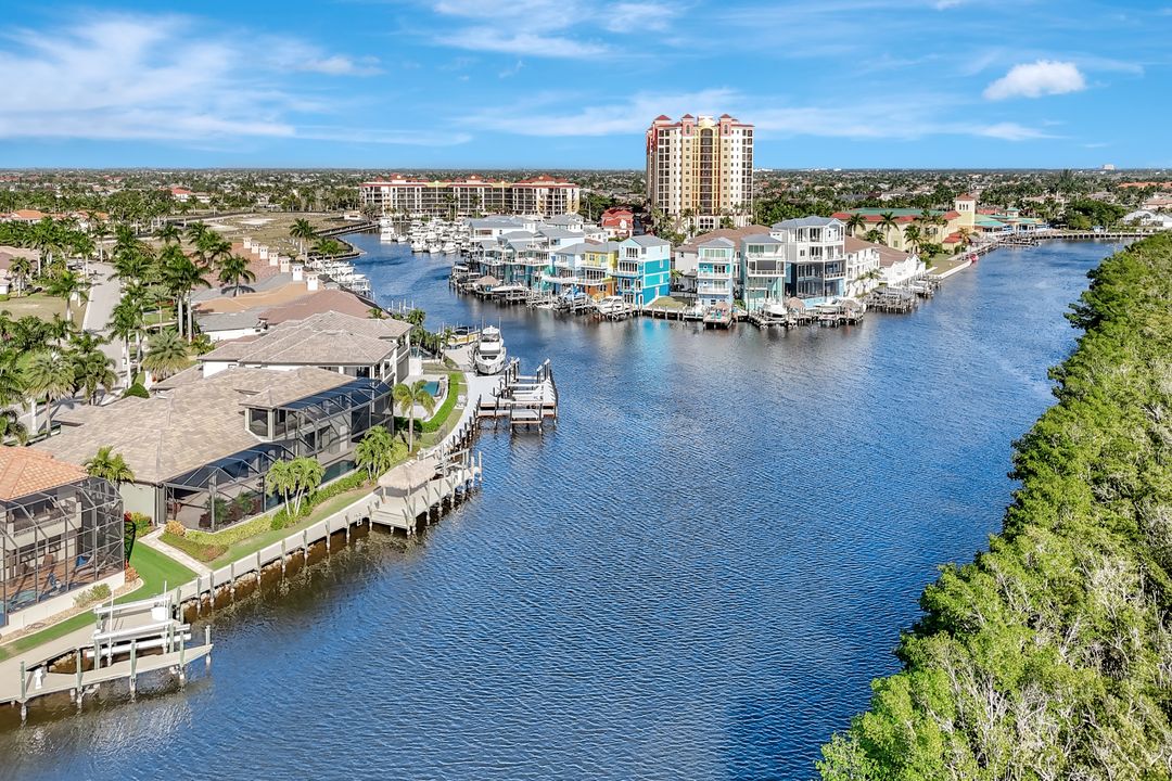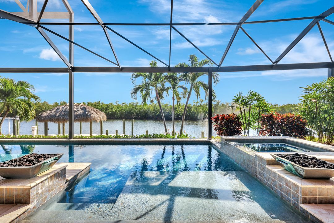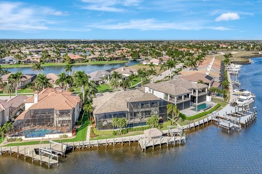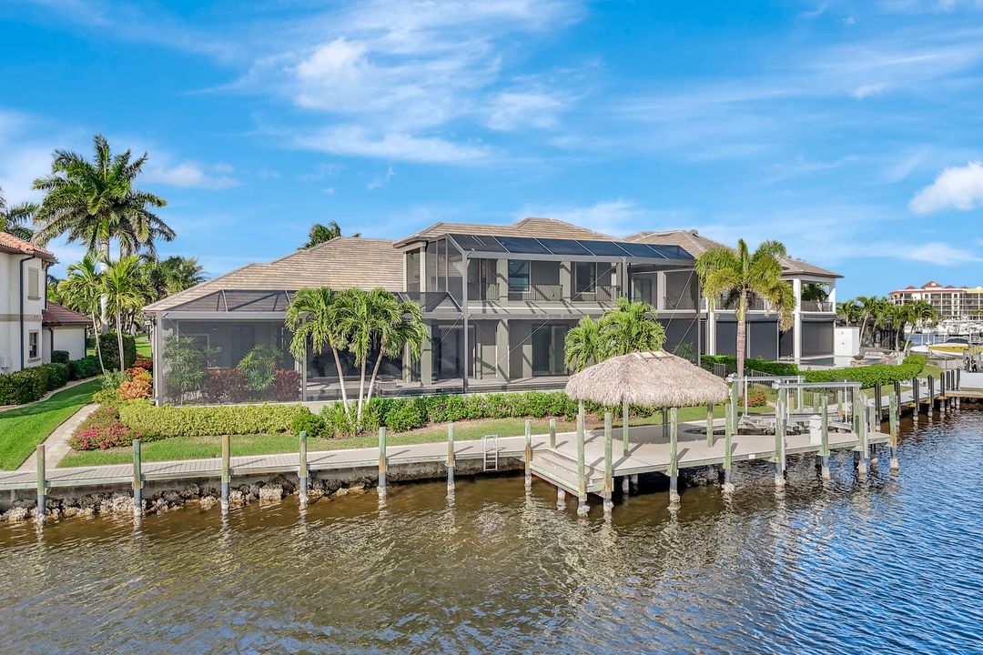 A true Cape Harbour showpiece built by award-winning Aubuchon Homes, offering DEEP WATER SAILBOAT ACCESS, 130’ OF WATER FRONTAGE, and highly desirable SOUTHERN REAR EXPOSURE with wide canal and preserve views. Designed for boating, entertaining, and effortless indoor-outdoor living, this custom estate delivers exceptional quality and lifestyle. This home was built "High & Dry" and had NO WATER PENETRATION or flooding during Hurricanes Ian, Milton, or Helene! Spanning 4,134 sq ft, the home features 4 bedrooms, 4.5 baths, plus a den/study. The primary suite and two guest ensuites are located on the main level, with a private upstairs guest retreat, full bath, and expansive media room with kitchenette and balcony overlooking the pool, canal, preserve, and evening city lights. Wood plank tile runs throughout the first floor, complemented by high ceilings, impact-resistant windows and doors, central vacuum, and automated sheer daytime and blackout evening shades in select living areas. The great room features coffered ceilings, fireplace, and 90-degree pocketing sliders that fully open to the screened lanai and pool area. The dining space is positioned between the great room and kitchen and includes its own pocketing sliders for seamless entertaining. The kitchen is generously sized and thoughtfully designed with custom wood cabinetry, quartz countertops, Sub-Zero refrigerator, gas range with pot filler, Advantium oven, wall oven, stand-alone ice maker, beverage cooler, large wine refrigerator, walk-in pantry, built-in casual dining table, and a dedicated beverage and serving area ideal for entertaining. The primary suite offers direct lanai access, two custom walk-in closets, a safe, AV closet, and a spa-inspired bath with dual vanities, makeup vanity, soaking tub, and a large walk-in shower with multiple shower heads. Outdoor living shines with a 2024 two-story screened enclosure, electric roll-down storm screens, summer kitchen with built-in grill, bar, beverage cooler, covered dining area, heated saltwater pool ideal for lap swimming, integrated spa, sun shelf with fire bowls, and outdoor shower. At the dock, enjoy a captain’s walk, tiki hut, 10,000 lb. boat lift, and approximately 70’ of additional dockage along the seawall, accommodating larger vessels or sailboats. Additional features include a 2023 roof, buried 500-gallon propane tank supporting the range, grill, fire bowls, and whole-home generator, whole-house carbon water filtration system, and a 3-car garage with mini-split A/C. Located behind the gates of Cape Harbour with quick boating access to open water, the Gulf of Mexico, and waterfront dining at Cape Harbour and Tarpon Point.