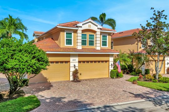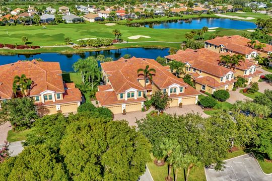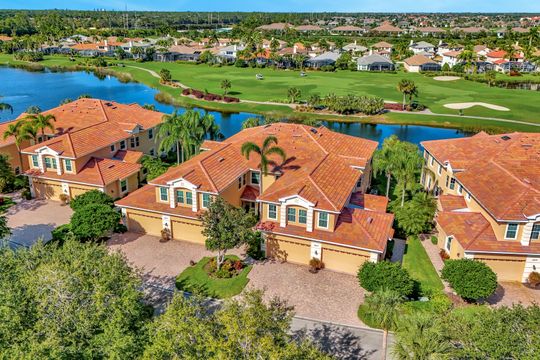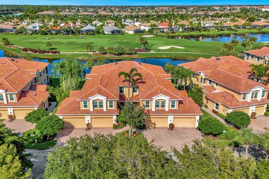 Experience the ultimate in Florida resort style living in this rarely available first floor Trophy Club coach home located at The Strand. A courtyard entry welcomes you into a spacious 2,160 sq. ft. floor plan. Enjoy one of the finest lake & golf course views in The Strand from your lanai. With 2 bedrooms, 3 full baths, an open dining or den area, and an additional enclosed den there is plenty of privacy & a flexible use of space. The kitchen features an island, cabinet pull-outs, walk-in pantry & breakfast nook. All three bathrooms have been updated including a luxurious primary bath with frameless glass shower, tile accents & quartz counters. Other improvements include decorator lighting, fans, tile in main living areas, newer carpet in bedrooms, custom paint & window treatments. New impact windows & slider doors and roll-down shutters provide the ultimate storm protection. Enjoy a friendly, active country club lifestyle, complete with 3 beautifully maintained 9-hole golf courses, tennis, pickleball, fitness center, pool with lap lanes, bocce courts, croquet, Island Bar and the all-new Tavern 59 for residents to enjoy. Centrally located, close to restaurants, shopping & beaches.