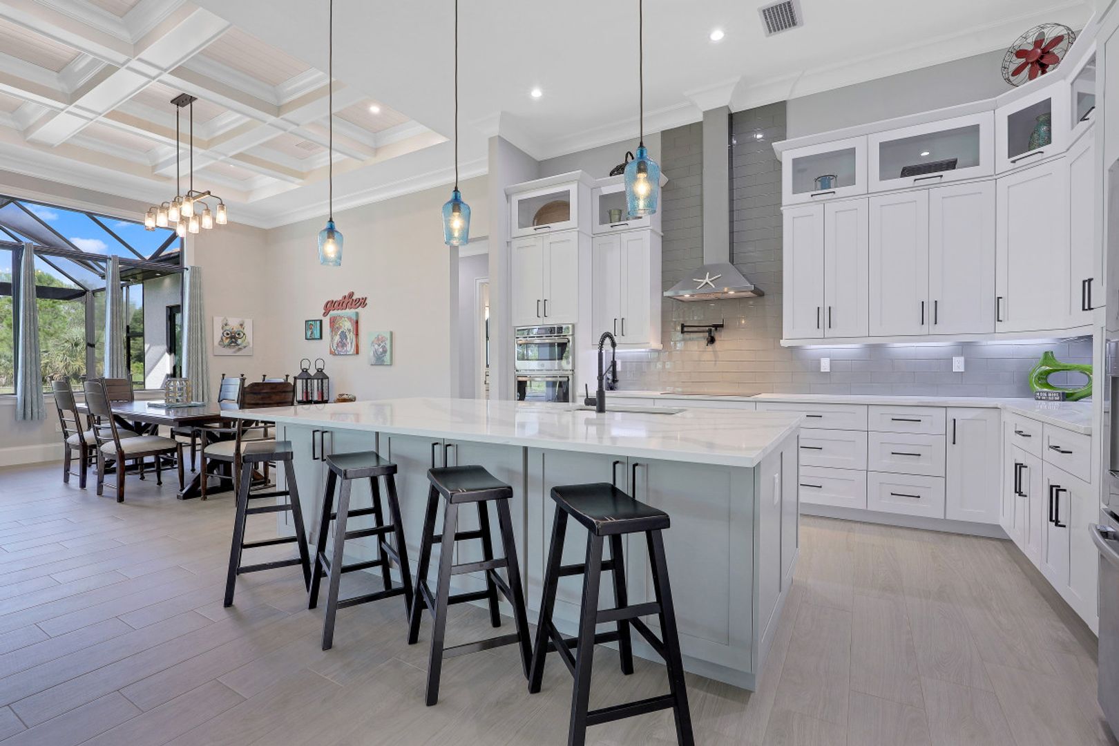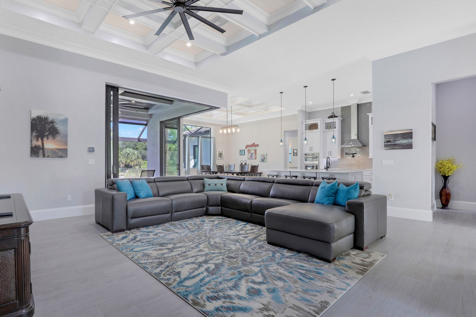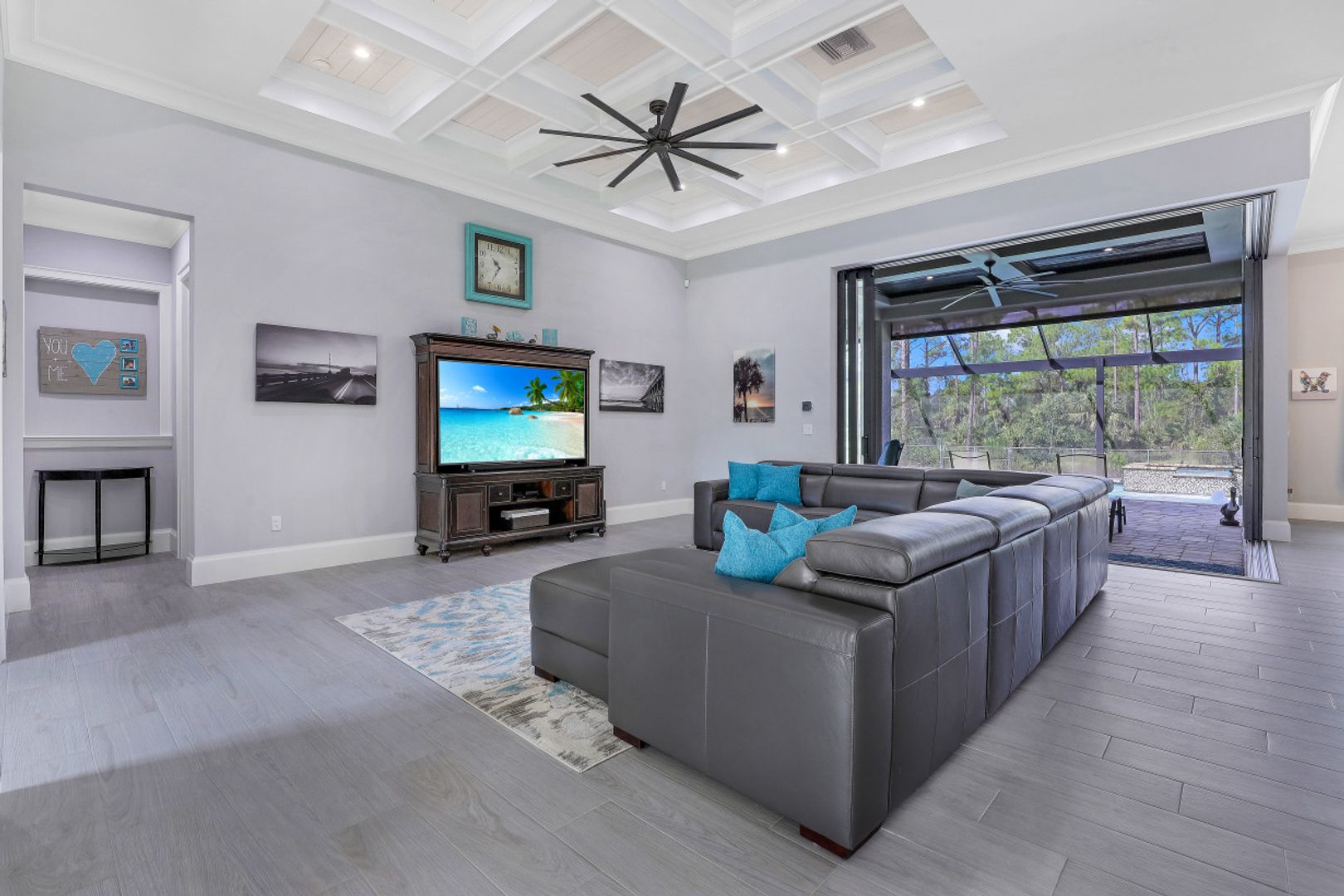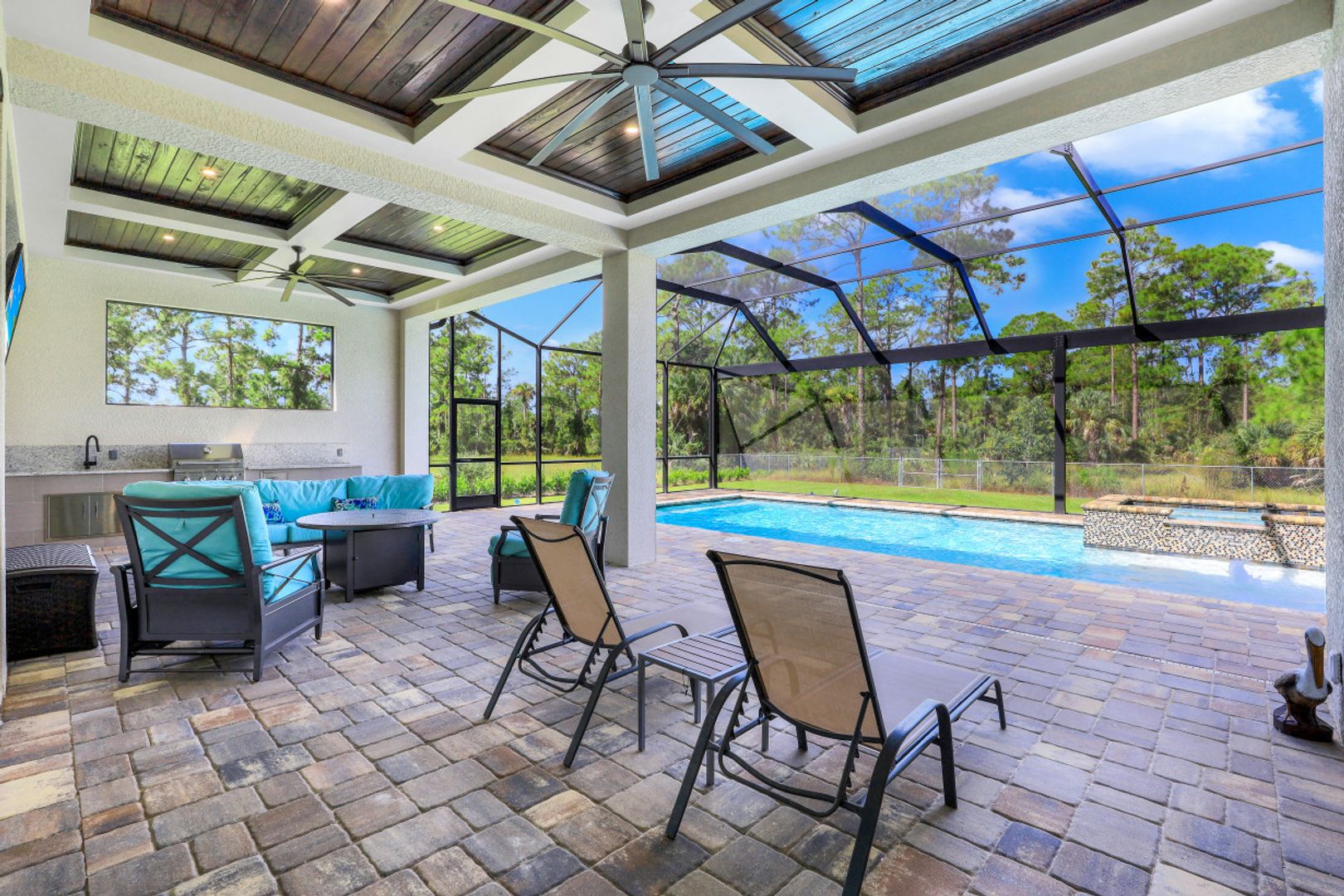 This gated and fully fenced estate home is situated on a lush 2.5 acre lot just 1.9 miles east of 951/Collier Blvd. Built in 2019, this custom home offers 4 Bedrooms+Den, 4 Baths, oversized 3 car garage, and 3310 Sq Ft under air. From the moment you pull through the electric gate and up the paver driveway to the front custom front door, you are greeted with luxury. Step inside and you will find 12' ceilings throughout the open great room style floorplan complete with two coffered ceilings, zero corner sliding glass doors to the lanai, wood look tile floors throughout (no carpet anywhere), and an impressive kitchen with shaker style cabinets with upper glass display boxes, and rich Calcatta Laza Quartz countertops and glass tile backsplash. Enjoy sunsets 365 days a year around the oversized pool/spa/sunshelf or covered area compete with two coffered ceilings with stained cypress accents. Other fine appointments include: 8" baseboards; solid core doors; hurricane impact windows & doors; electric roll down storm shutters on the lanai; outdoor kitchen; whole house reverse osmosis; alarm system with cameras; soffit lighting in the front and back of the home; and more!
