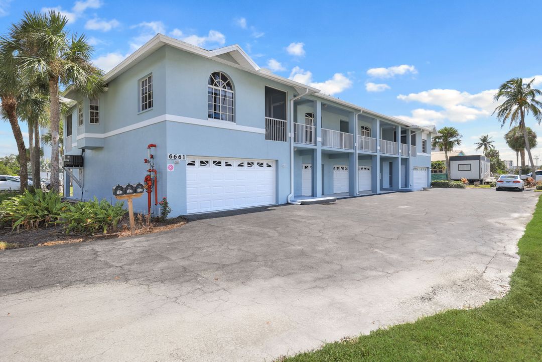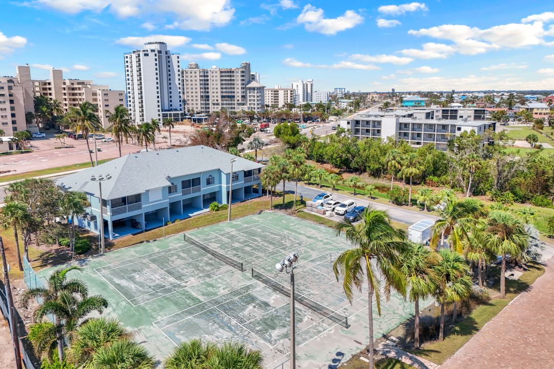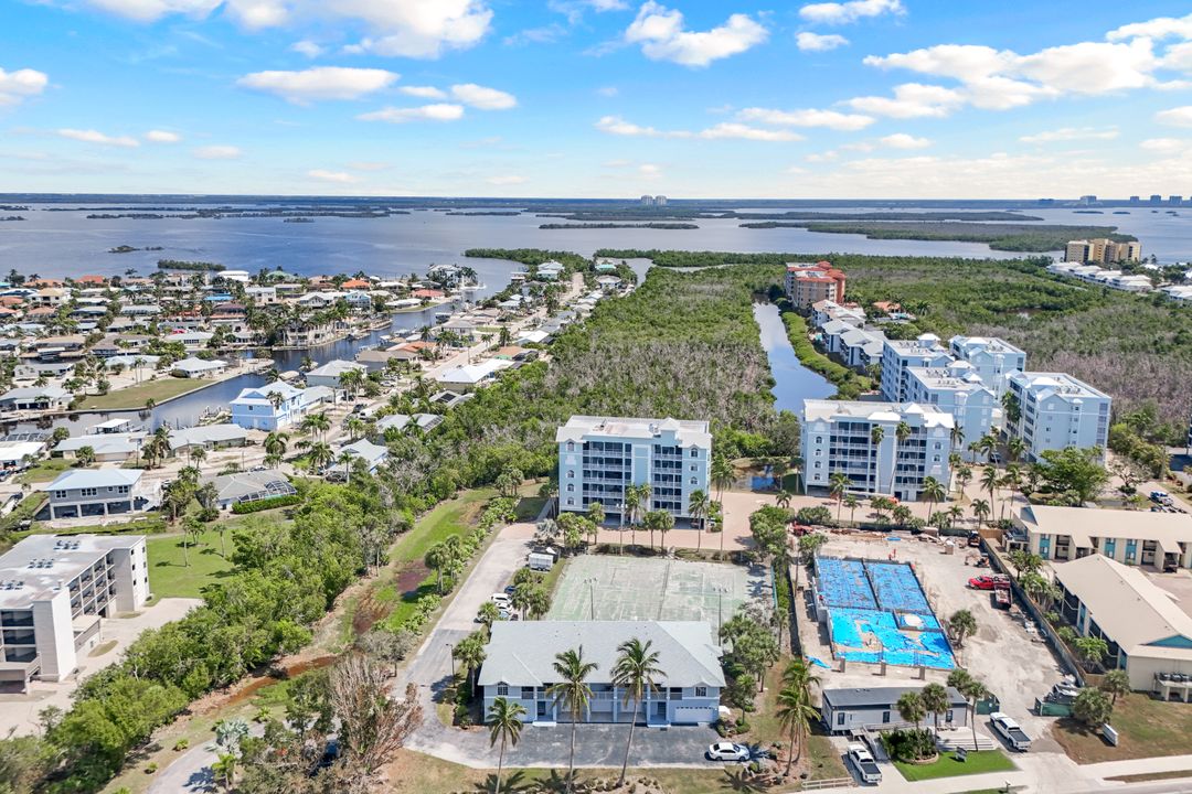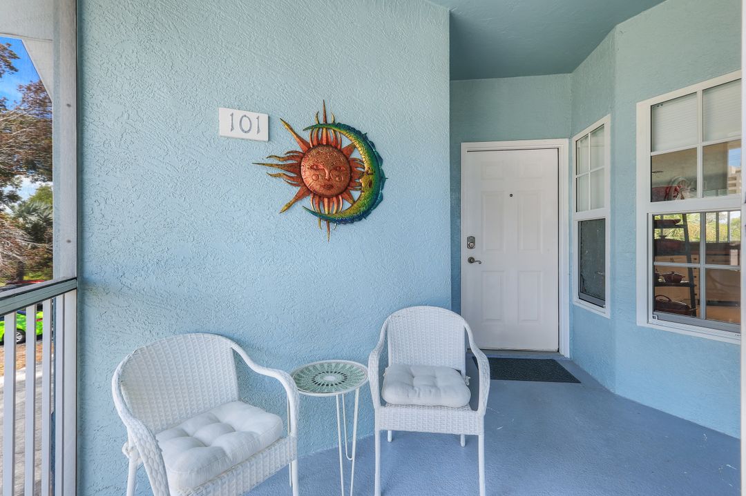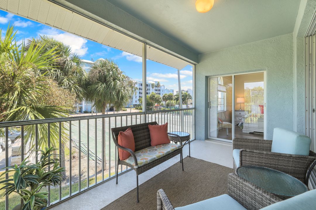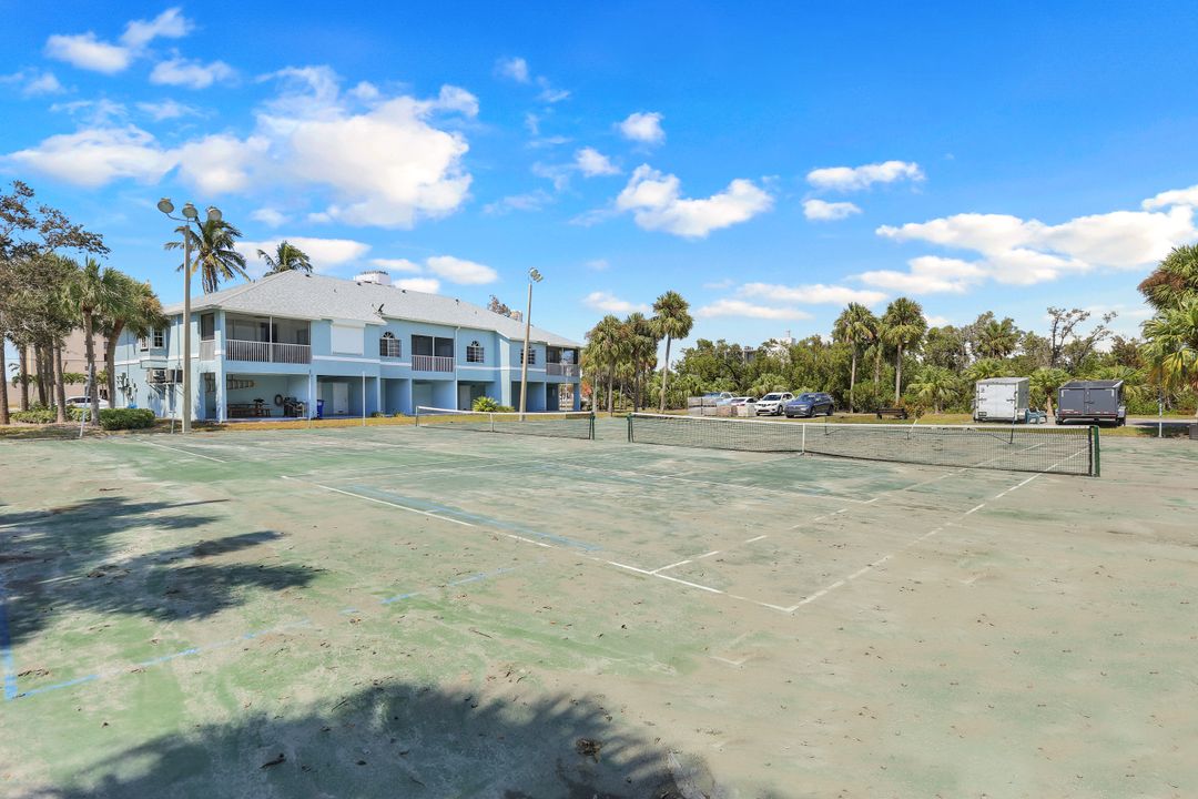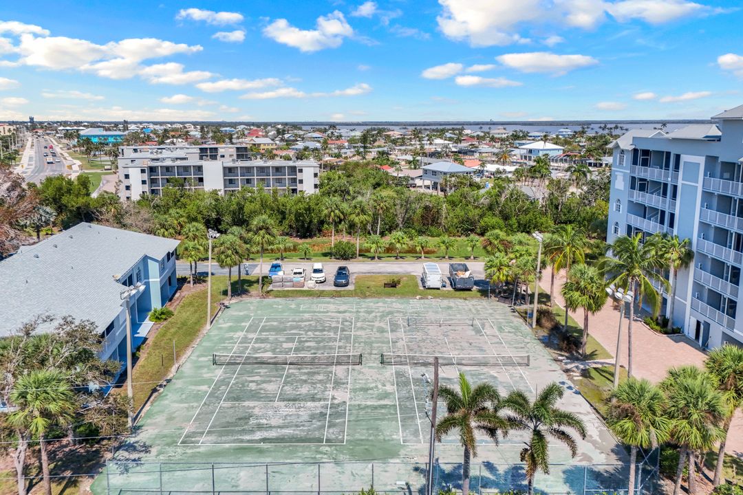 This stunning 2-bedroom, 2-bath end-unit condo in Captains Bay North offers incredible Gulf views and comes with a rare, oversized 2 1/2 stall private garage. Located in a tri-plex building, Unit 101 remained high and dry during both Hurricane Ian and Hurricane Helene, with no water damage. It was quickly livable after the storms, along with the other two units in the building. Completely remodeled in 2018, the unit features 2-inch solid teak countertops, new stainless steel appliances, updated bathrooms, tile and wood flooring, fresh paint, and a new roof with gutters. The condo also boasts a fire alarm monitoring system, in-unit washer and dryer, and an expansive 700 sq ft of outdoor living space, including a private screened lanai and a ground-level patio that overlooks tennis and pickleball courts. The community offers exceptional amenities, including two large heated pools, tennis courts, and shuffleboard. Additional shared guest parking (four spaces) is available. Situated just steps from the beach and within walking distance to nearby restaurants and shops, this condo is move-in ready and sold fully furnished—just bring your personal belongings. With only three units in the building and its own condo association, this property offers privacy, a strong sense of community, and a prime location for enjoying all that coastal Florida living has to offer.