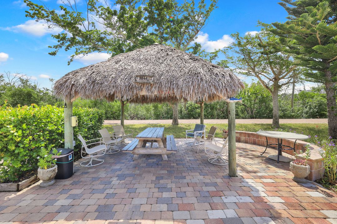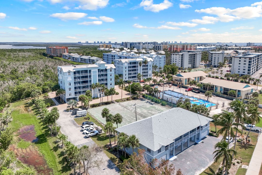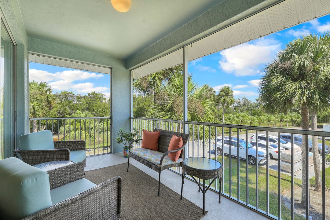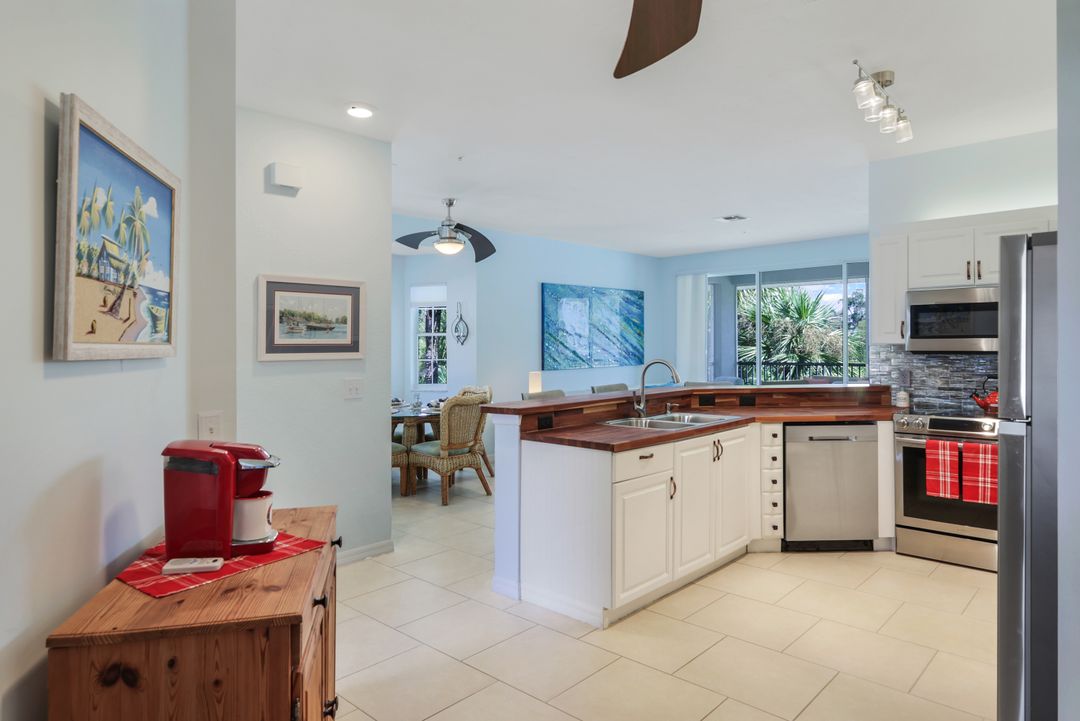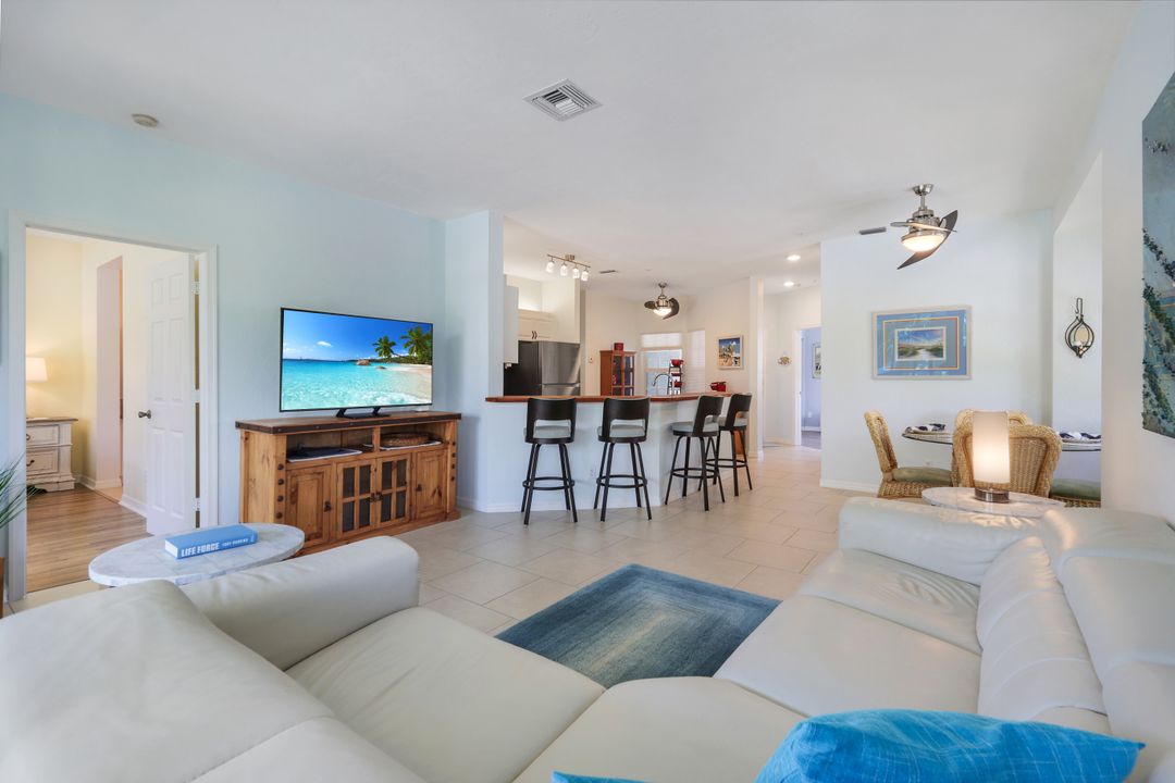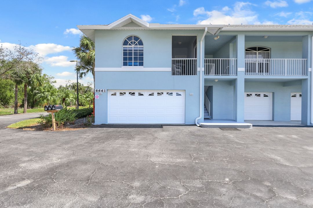 This stunning 2-bedroom, 2-bath end-unit condo in Captains Bay North offers incredible Gulf views and comes with a rare, oversized 2 1/2 stall private garage. Located in a tri-plex building, Unit 101 remained high and dry during both Hurricane Ian and Hurricane Helene, with no water damage. It was quickly livable after the storms, along with the other two units in the building. Completely remodeled in 2018, the unit features 2-inch solid teak countertops, new stainless steel appliances, updated bathrooms, tile and wood flooring, fresh paint, and a new roof with gutters. The condo also boasts a fire alarm monitoring system, in-unit washer and dryer, and an expansive 700 sq ft of outdoor living space, including a private screened lanai and a ground-level patio that overlooks tennis and pickleball courts. The community offers exceptional amenities, including two large heated pools, tennis courts, and shuffleboard. Additional shared guest parking (four spaces) is available. Situated just steps from the beach and within walking distance to nearby restaurants and shops, this condo is move-in ready and sold fully furnished—just bring your personal belongings. With only three units in the building and its own condo association, this property offers privacy, a strong sense of community, and a prime location for enjoying all that coastal Florida living has to offer.