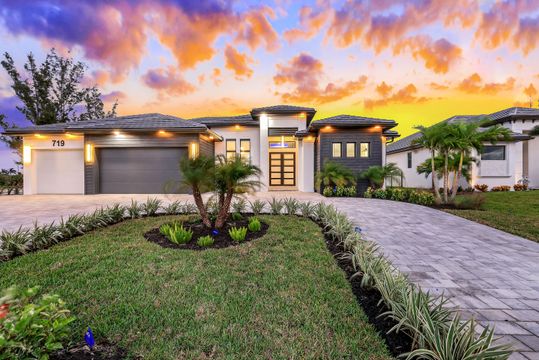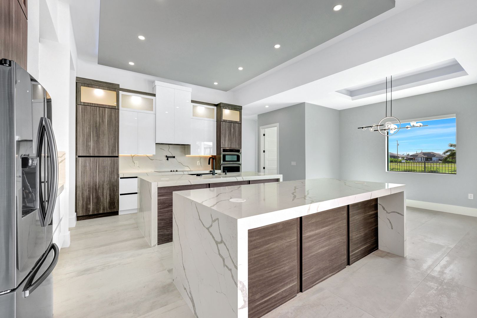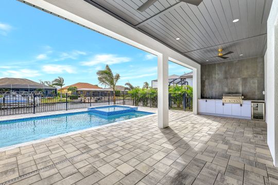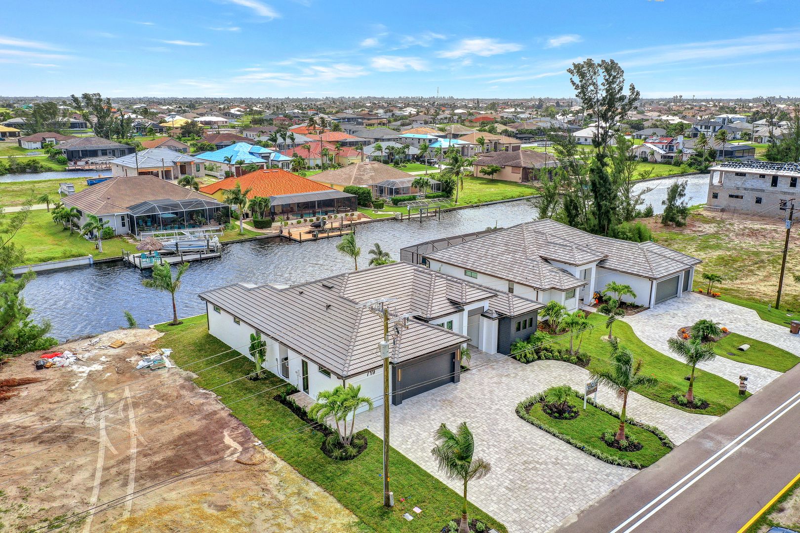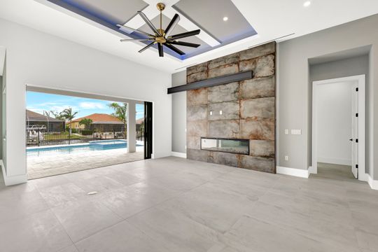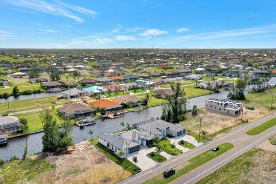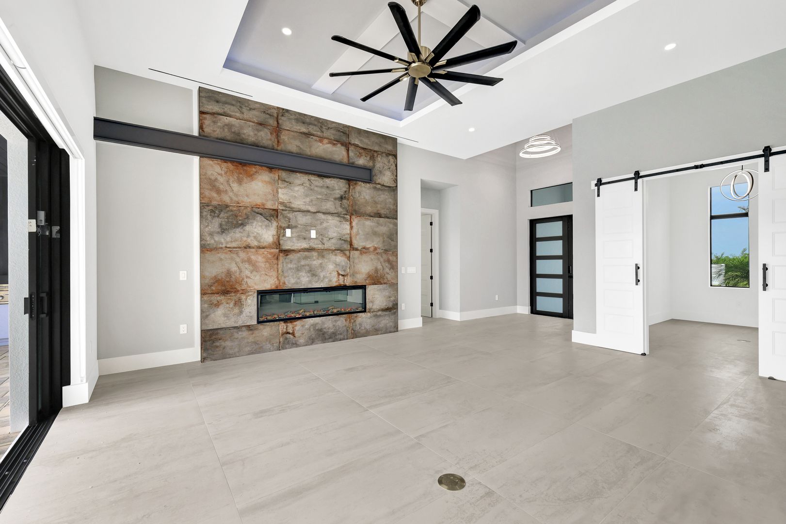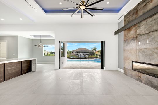 Gulf Access Luxury New Construction Home near future Seven Island Waterfront Community & Marina and Park. Done & Ready for you to enjoy this Winter Season! This stunning home comes loaded including modern double doors, glass wine display, breath-taking living room with water views, large 24 x 28 porcelain floors, feature wall with fireplace, 12 foot detailed coffered ceilings. A modern kitchen with luxurious cabinetry with LED lighting, pantry, bar top, and double waterfall quartz islands for entertainment & dining. Waterfront master suite with designer tray ceiling complimented by an incredible resort style bath with floating his & her vanities, LED vanities, and large walk-in shower. Guest Bedrooms and with 3 full baths no need to share! OVERSIZED POOL - Absolutely huge 29x14 Pool & Spa with Sun-self, multiple jets, water features, and integrated Spa turns our back yard into a waterfront resort. Your Oasis is topped off with an outdoor kitchen and lots of room for entertaining. BOATERS quick boating access to Matlacha Pass, fishing, beaches, and islands! CITY WATER & SEWER in & paid. Across the street from the future 7 Islands may include restaurants, shopping, marinas, a park, green space, and possibly even a beach area!