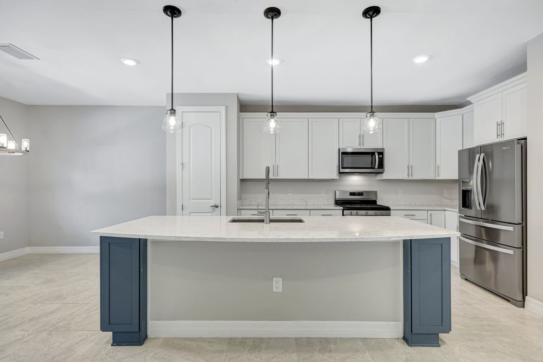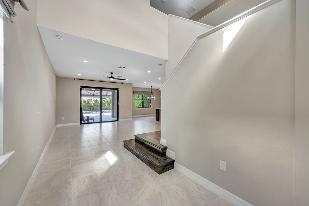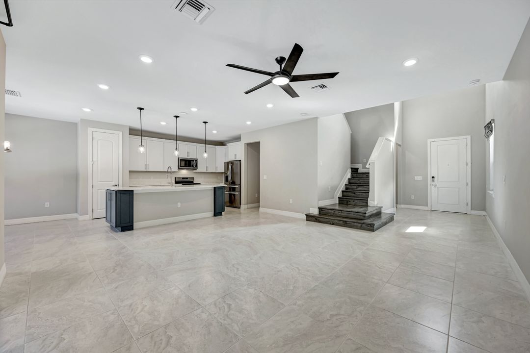 This home includes a whole-house generator for peace of mind during hurricane season and an upgraded mesh Wi-Fi system with boosters throughout. The sought-after Driftwood floor plan features impact-resistant glass windows and doors, a spacious great room, and a chef’s kitchen with soft-close cabinetry, quartz countertops, expanded island, stainless-steel appliances, and gas cooking. The large dining area and powder room complete the first floor, while sliding glass doors open to the extended covered lanai.