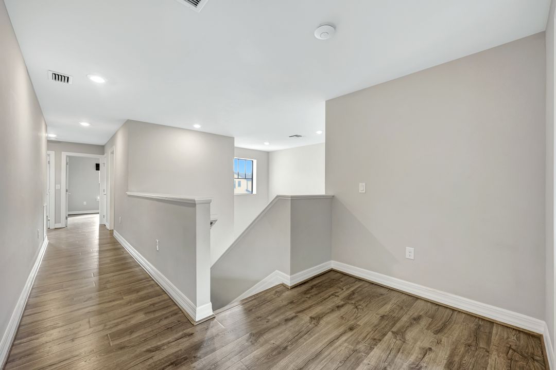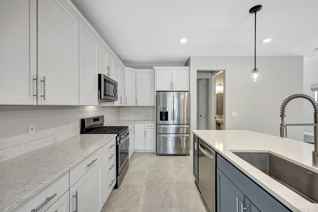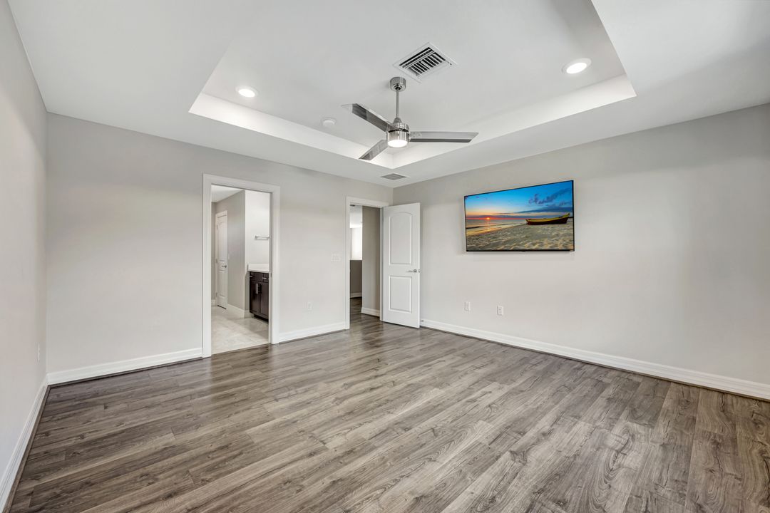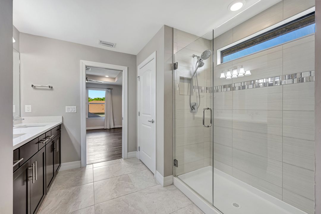 Upstairs, the luxurious primary suite boasts a tray ceiling with LED lighting, double vanity with quartz countertops, frameless glass shower, and custom walk-in closet. Three additional bedrooms and two full baths (one en-suite) provide space for family and guests. A versatile main-level den/flex room can serve as a fifth bedroom or office.