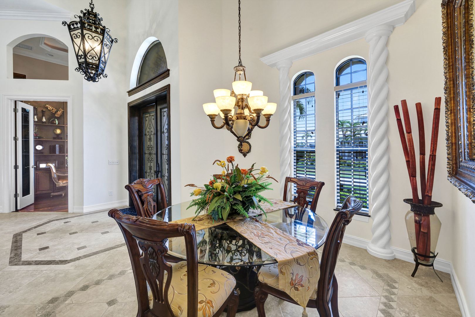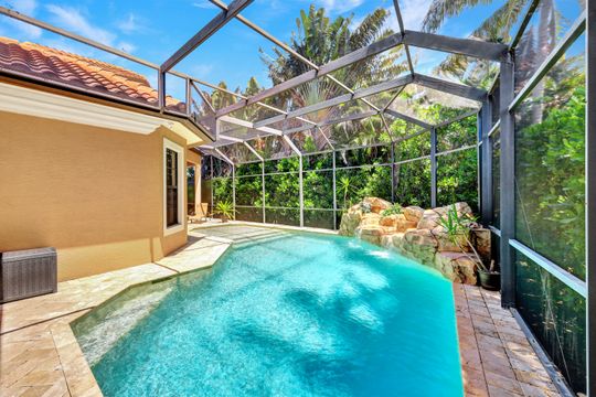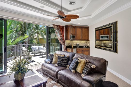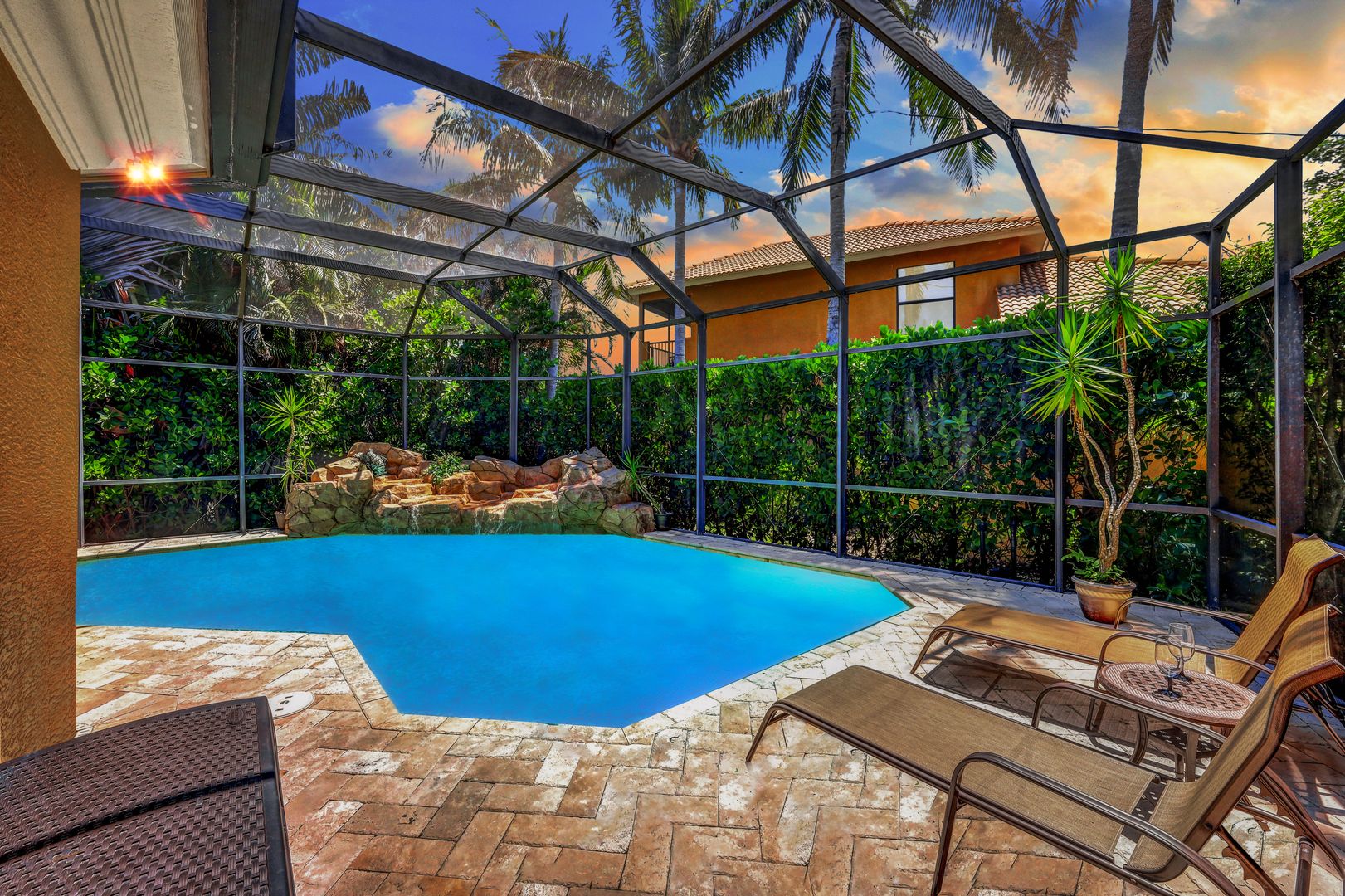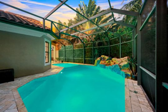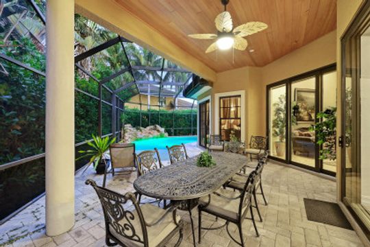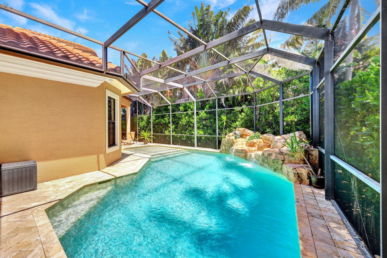 Stunning 2 story Mediterranean style residence where luxurious elegance and comfort blend in a harmonious way. Superb architectural custom details, crown molding, double tray, coffered and soaring ceilings, beautifully appointed, professionally decorated and impeccable craftsmanship throughout. It is sure to capture the attention of the most discerning buyer. The exquisitely designed open floor plan flows smoothly integrating the spacious family, dining and living room areas, showcasing a gourmet kitchen with rich cabinetry, detailed backsplash, granite counter tops, stainless steel appliances, wet bar and many traits to enhance your culinary experience. All these while enjoying the captivating, inviting and private lanai surrounded by tropical foliage featuring a sun deck pool with a soothing rock waterfall making it your own idyllic oasis in paradise ideal to entertain or relax. High impact windows throughout ensure maximum safety and peace of mind. Spacious master bedroom and upscale bathroom with walk-in shower, soaking tub, and oversized walk-in closet. The Office/Den with French doors is finished with functional floor to ceiling built-ins and timeless wood floors. The second floor has their own charm and flavor with 3 spacious bedrooms, a full bath plus a fabulous and comfortable loft/family room completed with morning kitchen and with access to a nice and private open terrace surrounded by palm trees ideal to sunbathe, have that morning coffee or enjoy a happy hour drink. Another fabulous bonus is the complete fenced-in garden to let the children play, let your pets run free or delight yourself by absorbing the beauty of the surroundings. Phenomenal location, close to shops, restaurants and the beach. Offered turnkey furnished, ready to move in. A true gem in Paradise.