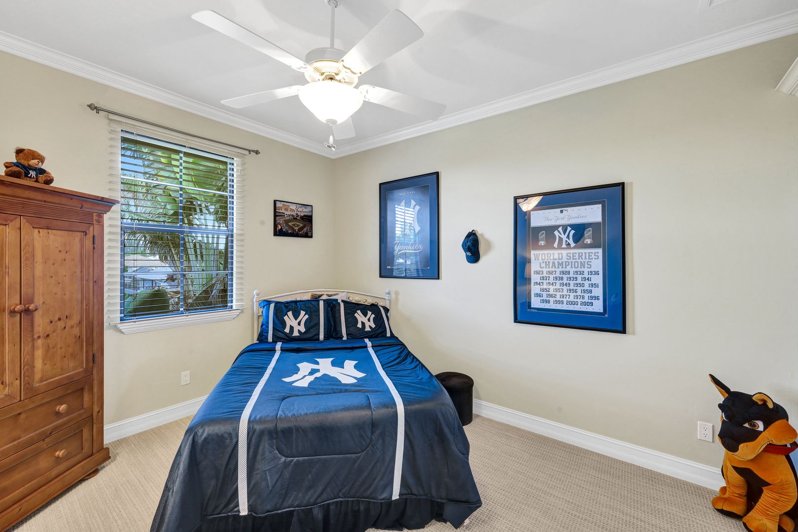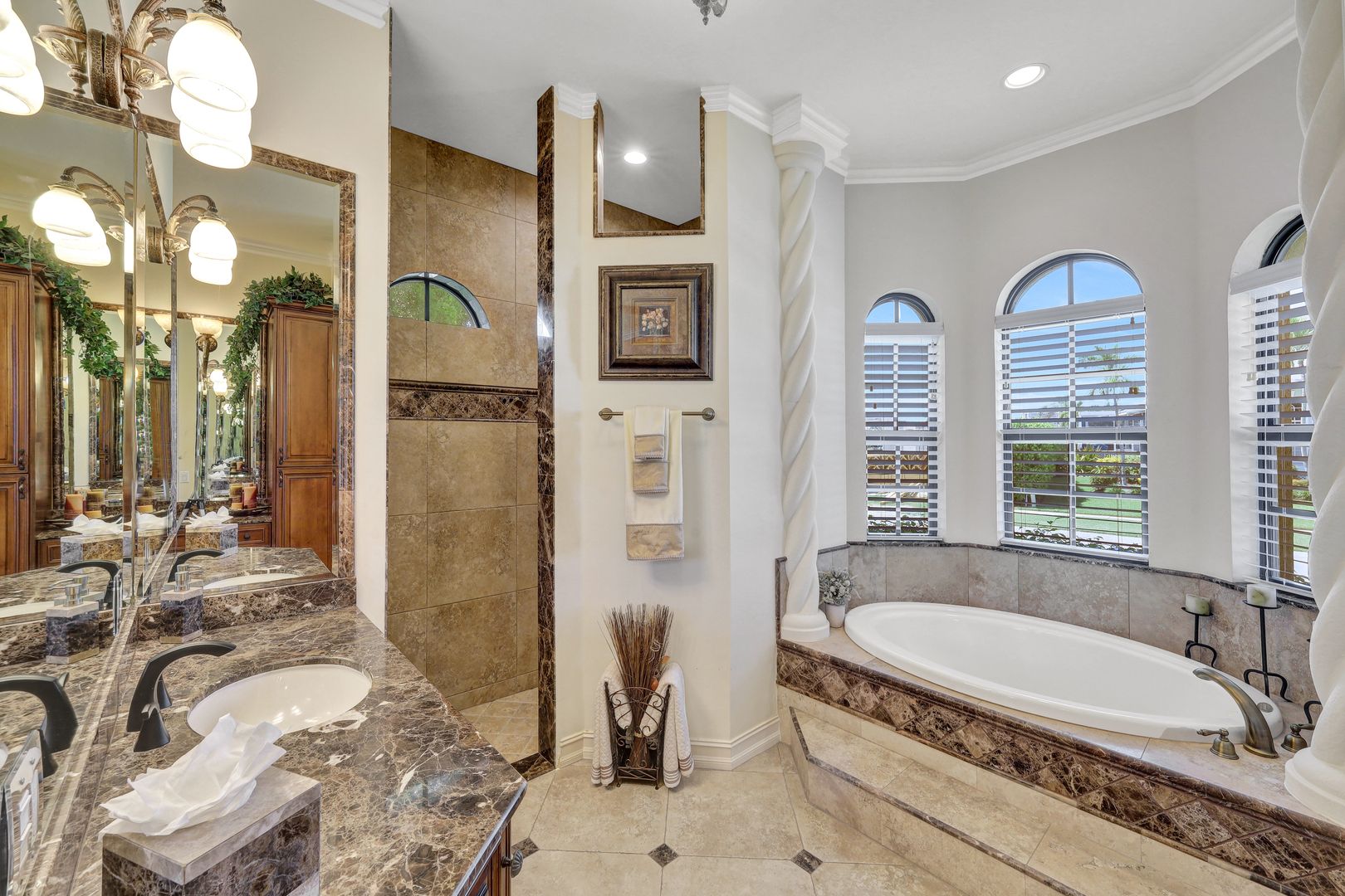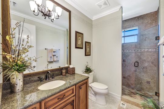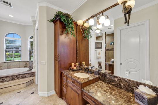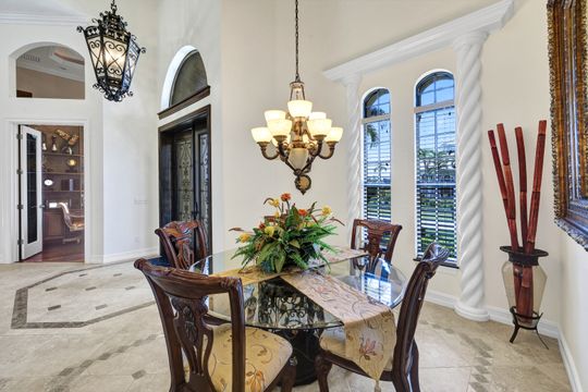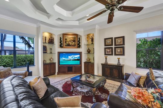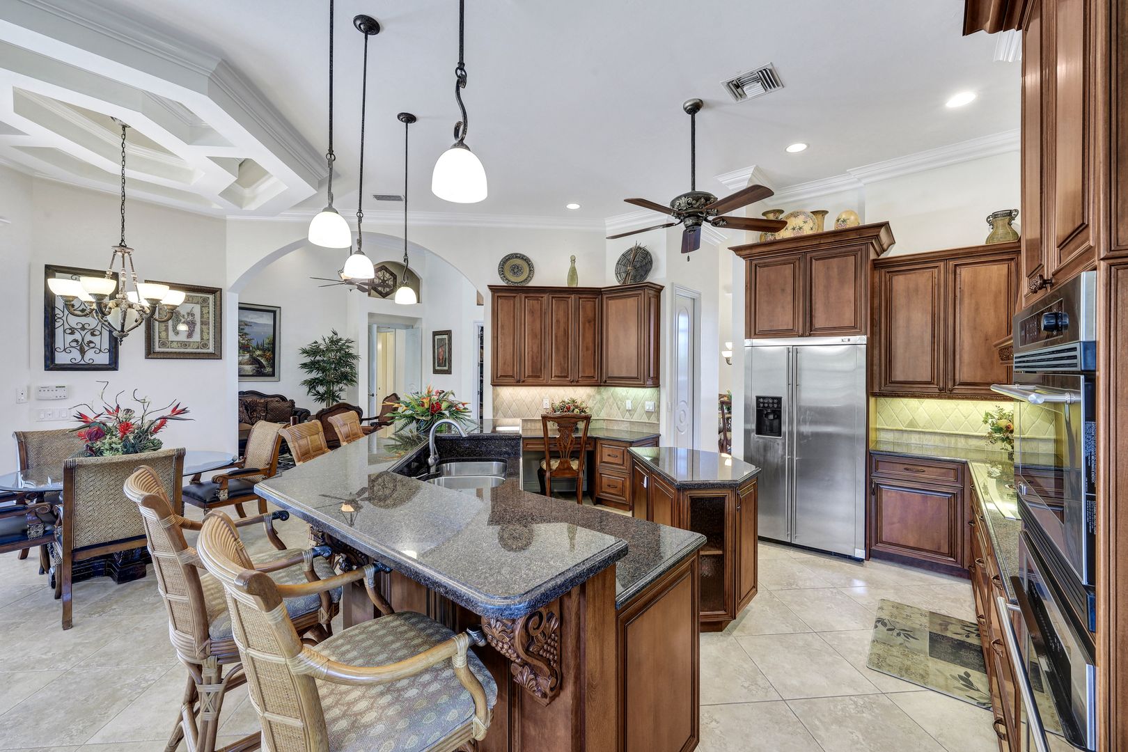 Stunning 2 story Mediterranean style residence where luxurious elegance and comfort blend in a harmonious way. Superb architectural custom details, crown molding, double tray, coffered and soaring ceilings, beautifully appointed, professionally decorated and impeccable craftsmanship throughout. It is sure to capture the attention of the most discerning buyer. The exquisitely designed open floor plan flows smoothly integrating the spacious family, dining and living room areas, showcasing a gourmet kitchen with rich cabinetry, detailed backsplash, granite counter tops, stainless steel appliances, wet bar and many traits to enhance your culinary experience. All these while enjoying the captivating, inviting and private lanai surrounded by tropical foliage featuring a sun deck pool with a soothing rock waterfall making it your own idyllic oasis in paradise ideal to entertain or relax. High impact windows throughout ensure maximum safety and peace of mind. Spacious master bedroom and upscale bathroom with walk-in shower, soaking tub, and oversized walk-in closet. The Office/Den with French doors is finished with functional floor to ceiling built-ins and timeless wood floors. The second floor has their own charm and flavor with 3 spacious bedrooms, a full bath plus a fabulous and comfortable loft/family room completed with morning kitchen and with access to a nice and private open terrace surrounded by palm trees ideal to sunbathe, have that morning coffee or enjoy a happy hour drink. Another fabulous bonus is the complete fenced-in garden to let the children play, let your pets run free or delight yourself by absorbing the beauty of the surroundings. Phenomenal location, close to shops, restaurants and the beach. Offered turnkey furnished, ready to move in. A true gem in Paradise.