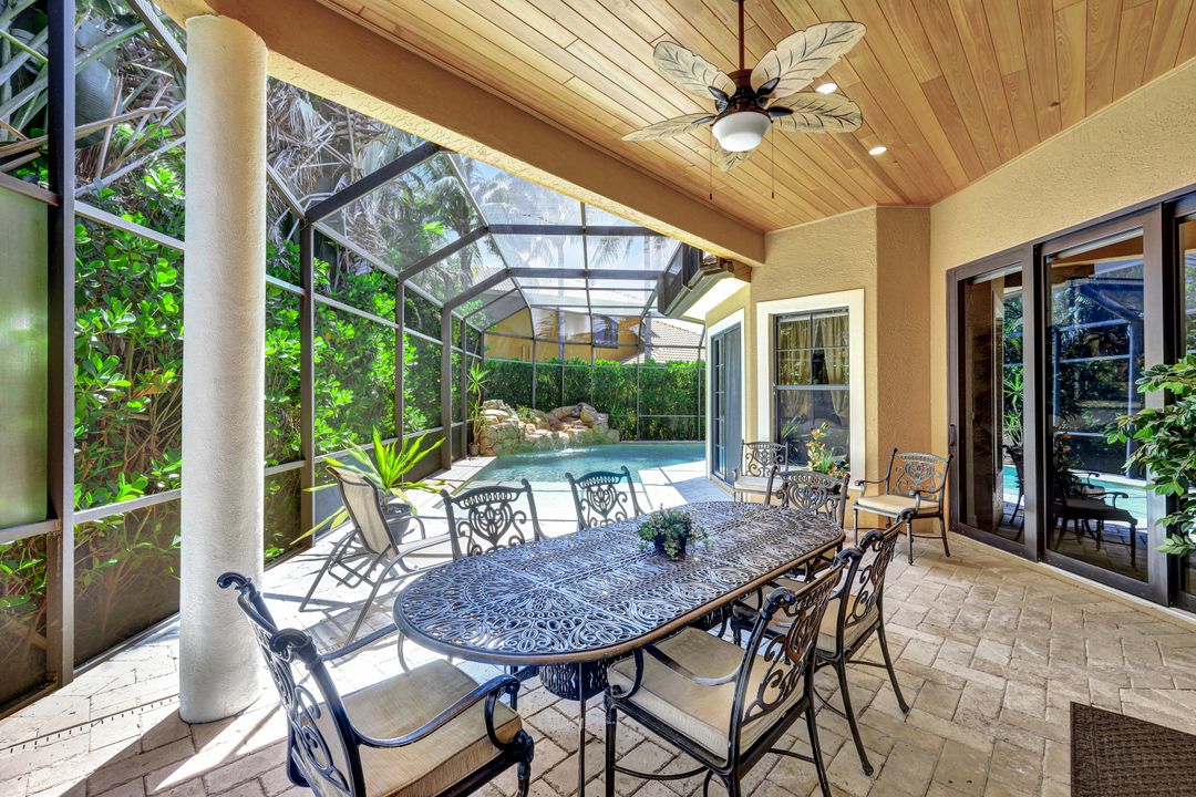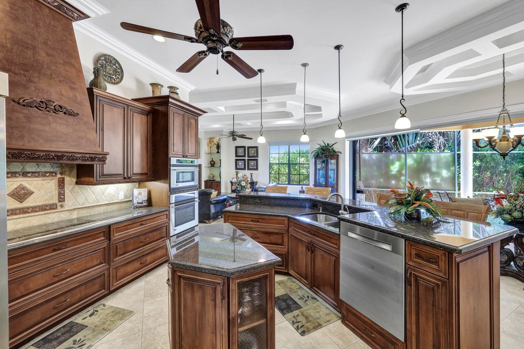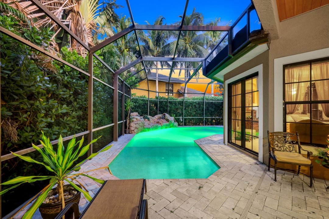 Stunning 2 story Mediterranean style residence where luxurious elegance and comfort blend in a harmonious way. Superb architectural custom details, crown molding, double tray, coffered and soaring ceilings, beautifully appointed, professionally decorated and impeccable craftsmanship throughout. It is sure to capture the attention of the most discerning buyer. The exquisitely designed open floor plan flows smoothly integrating the spacious family, dining and living room areas, showcasing a gourmet kitchen with rich cabinetry, detailed backsplash, granite counter tops, stainless steel appliances, wet bar and many traits to enhance your culinary experience. All these while enjoying the captivating, inviting and private lanai surrounded by tropical foliage featuring a sun deck pool with a soothing rock waterfall making it your own idyllic oasis in paradise ideal to entertain or relax. High impact windows throughout ensure maximum safety and peace of mind. Spacious master bedroom and upscale bathroom with walk-in shower, soaking tub, and oversized walk-in closet. The Office/Den with French doors is finished with functional floor to ceiling built-ins and timeless wood floors. The second floor has their own charm and flavor with 3 spacious bedrooms, a full bath plus a fabulous and comfortable loft/family room completed with morning kitchen and with access to a nice and private open terrace surrounded by palm trees ideal to sunbathe, have that morning coffee or enjoy a happy hour drink. Another fabulous bonus is the complete fenced-in garden to let the children play, let your pets run free or delight yourself by absorbing the beauty of the surroundings. Phenomenal location, close to shops, restaurants and the beach. Offered turnkey furnished, ready to move in. A true gem in Paradise.