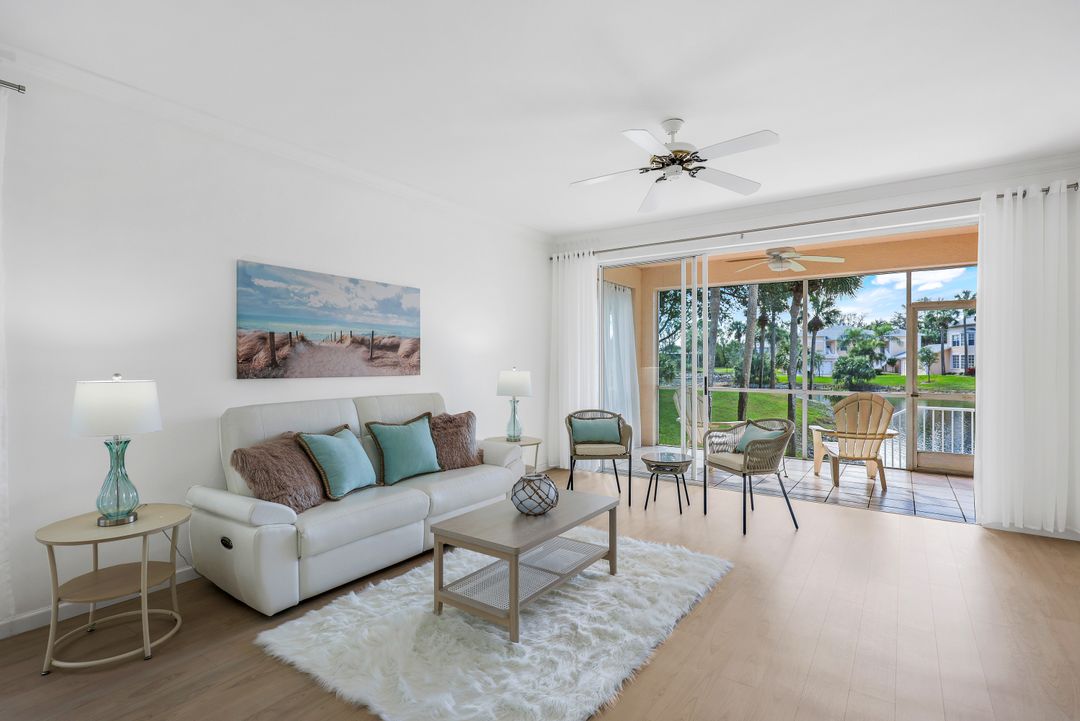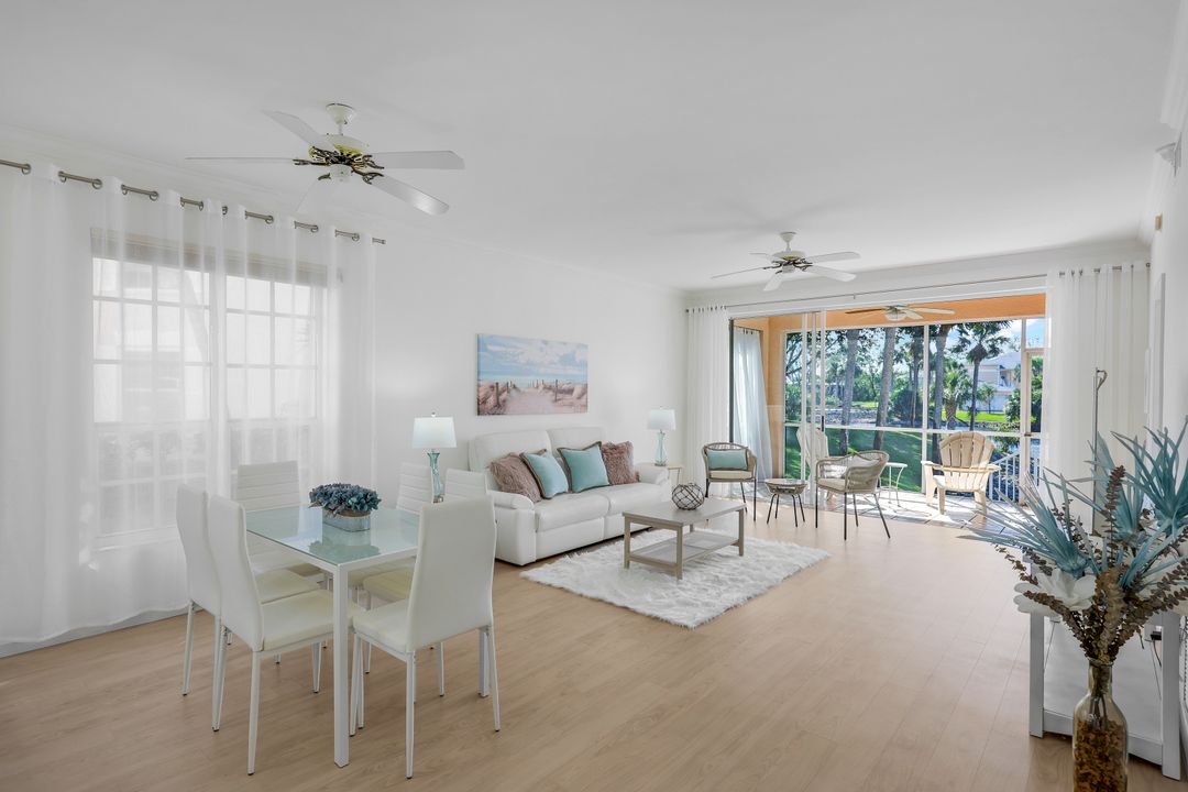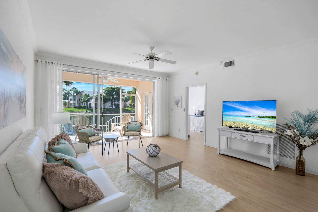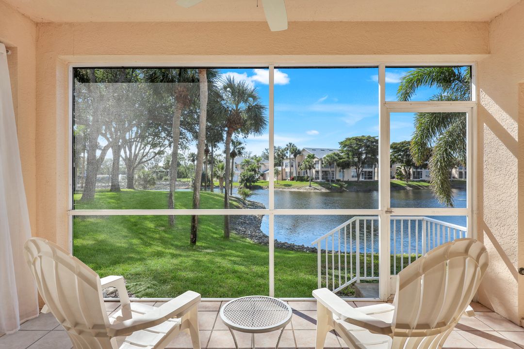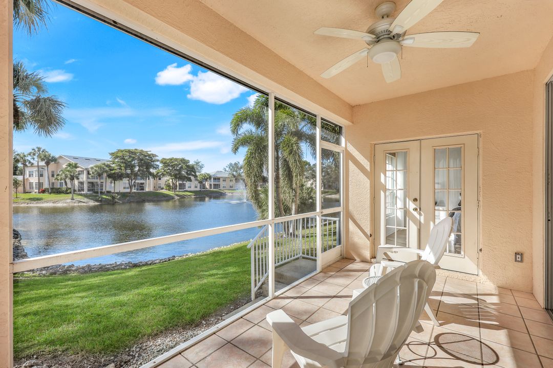 This charming first-floor, lakefront, turnkey-furnished corner coach home with an oversized attached garage is across from Kinsale Golf Club and just 3 miles from the beach! Located west of US-41, with only four units per building, this beautiful residence offers the feel of a single-family home with 9-foot ceilings and a sunny south-facing lanai with breathtaking lake and fountain views, protected by motorized hurricane shutters.